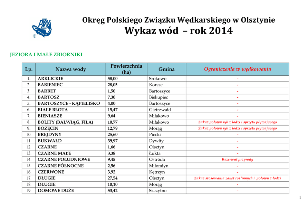Okręg Polskiego Związku Wędkarskiego w Olsztynie Wykaz wód – rok 2014 JEZIORA I MAŁE ZBIORNIKI Lp. 1. 2. 3. 4. 5. 6. 7. 8. 9. 10. 11. 12. 13. 14. 15. 16. 17. 18. 19. Nazwa wody ARKLICKIE BABIENIEC BARBET BARTOSZ BARTOSZYCE - KĄPIELISKO BIAŁE BŁOTA BIENIASZE BOLITY (BALWIĄG, FILA) BOŻĘCIN BREJDYNY BUKWAŁD CZARNE CZARNE MAŁE CZARNE POŁUDNIOWE CZARNE PÓŁNOCNE CZERWONE DŁUGIE DŁUGIE DOMOWE DUŻE Powierzchnia (ha) 58,00 28,05 1,50 7,30 4,00 15,47 9,64 10,77 12,79 25,60 39,97 1,66 3,38 9,45 2,56 3,92 27,54 10,10 53,42 Gmina Srokowo Korsze Bartoszyce Biskupiec Bartoszyce Gietrzwałd Miłakowo Miłakowo Morąg Piecki Dywity Olsztyn Łukta Ostróda Miłomłyn Kętrzyn Olsztyn Morąg Szczytno Ograniczenia w wędkowaniu Zakaz połowu ryb z łodzi i sprzętu pływającego Zakaz połowu ryb z łodzi i sprzętu pływającego Rezerwat przyrody Zakaz stosowania zanęt roślinnych i połowu z łodzi - 1 20. 21. 22. 23. 24. 25. 26. 27. 28. 29. 30. 31. 32. 33. 34. 35. 36. 37. 38. 39. 40. 41. 42. 43. 44. 45. 46. 47. 48. DOMOWE MAŁE DOST DREŃSKIE DUŻE DREŃSKIE MAŁE DURĄG DUŚ GAJEREK DUŻY GISIEL (SZCZEPANKOWSKIE) GLĘDY GŁĘBOKIE GOLUB (GOŁĄB) GÓROWO IŁAWECKIE GRABOWIEC GUBER/SALPIK (zb. zaporowy) GUGOWO GUZOWY PIEC JASNA WODA KARAŚNIK KAZANICE KIERSZTANOWO KIRSZYTY KOCIOŁEK KOMIN KWIECEWO KWIDZKIE LINÓWKO LINÓWKO LITWA ŁANKIEJMY 12,00 11,32 11,55 1,88 16,50 35,51 4,26 20,84 5,77 5,07 5,76 3,53 1,50 228,00 66,94 10,62 7,38 1,84 2,78 16,01 12,09 8,03 6,56 57,00 31,54 7,50 34,20 9,03 5,00 Szczytno Jeziorany Łukta Łukta Ostróda Piecki Iława Dźwierzuty Łukta Ostróda Łukta Górowo Ił. Iława Ryn, Kętrzyn Ostróda Gietrzwałd Korsze Dywity Lubawa Kętrzyn Miłomłyn Iława Dobre Miasto Dobre Miasto Kętrzyn Barczewo Olsztynek Miłakowo Korsze Łowisko specjalne - obowiązują odrębne składki 2 49. 50. 51. 52. 53. ŁAZIENKI ŁĄCKIE (ŁĄKA, LONKER) ŁOMY MAŃKI MAZANY (MAŻAŃSKIE) 1,00 24,23 23,16 4,63 22,66 Lubawa Iława Jonkowo Olsztynek Kętrzyn 54. MORĄG – UŻYTEK EKO. 121,63 Morąg 55. 56. 57. 58. 59. 60. 61. 62. 63. 64. 65. 66. 67. 68. 69. 70. 71. 72. 73. 74. 75. 76. 77. MOTYLEK MÓJ NIEGŁAWKI ORZYC MAŁY PAJTUNY PASŁĘK PARWÓŁKI DUŻE PARWÓŁKI MAŁE PAWEŁEK PAPROTECKIE PARKUN (PERKUN) PIECKOWSKIE PIETRASZEWO PLATYNY PODKÓWKA (SIGINEK) PUPEL DUŻY PUPEL MAŁY RAJCZUCHY REDYKAJNY SANDELA SIEMIAŃSKIE (UROWIEC) SIEMKI SIERCZE 3,19 118,69 7,22 9,62 12,54 8,84 9,56 4,43 8,30 27,80 12,31 21,16 8,33 48,72 7,45 11,46 5,52 4,52 33,39 1,50 24,36 3,23 61,95 Ostróda Kętrzyn Miłakowo Barczewo Purda Olsztynek Gietrzwałd Gietrzwałd Piecki Miłki Iława Reszel Dobre Miasto Olsztynek Olsztyn Dobre Miasto Dobre Miasto Barczewo Olsztyn Lubawa Iława Reszel Kętrzyn Zakaz połowu ryb z łodzi i sprzętu pływającego w okresie od 1 stycznia do 31 maja Zakaz połowu ryb z łodzi i sprzętu pływającego Zakaz połowu ryb z łodzi i sprzętu pływającego 3 78. 79. 80. 81. 82. 83. 84. 85. 86. 87. 88. 89. 90. 91. 92. 93. 94. 95. 96. 97. 98. 99. SINIEC WIELKI SINIEC MAŁY SKARP SKOK SKOLITY SMOLANEK SOŁTYSKIE SREBRNE DUŻE SREBRNE MAŁE SUCHY PASKIERZ (TROCKIE) SZCZYCIONEK ŚWIERKOCIN TOLKOWSKIE TUCHEL WIELOCHOWSKIE WŁODOWO WRONOWO ZAPADŁE (CZARNE DUŻE) ZBIORNIK DOBRE MIASTO ZDROŻNE ZŁOTNA (KALNICKI STAW) ŻABIE 29,60 10,52 22,98 12,88 39,03 6,60 9,39 9,56 1,09 7,42 9,36 3,74 40,62 42,88 67,72 14,59 14,07 6,00 0,69 12,84 6,70 2,27 Srokowo Srokowo Piecki Piecki Świątki Olsztynek Mrągowo Miłomłyn Miłomłyn Miłomłyn Szczytno Olsztynek Korsze Kętrzyn Lidzbark Warm. Świątki Kozłowo Łukta Dobre Miasto Piecki Morąg Ostróda Zakaz używania jednostek pływających z silnikiem spalinowym Zakaz połowu ryb z łodzi i sprzętu pływającego Zakaz połowu ryb z łodzi i sprzętu pływającego Zakaz połowu ryb z łodzi i sprzętu pływającego Zakaz używania jednostek pływających z silnikiem spalinowym - 4 RZEKI Lp. 1. 2. Powierzchnia (ha) Gmina Granica Rodzaj wody Ograniczenia Stawiguda, Olsztyn, Dywity, Dobre Miasto, Lidzbark Warm., Bartoszyce, Sępopol, Jeziorany, Górowo Iławeckie Rzeka Łyna z dopływami od połączenia z jeziora Kielarskiego do granicy państwa, z wyłączeniem odcinka od jazu piętrzącego elektrowni wodnej w miejscowości Brąswałd, do połączenia ze starym korytem rzeki Łyna, tj. obwód rybacki jeziora Skłodzin, obwód rybacki jeziora Mosąg. Dopływy rzeki Łyna: 1. Struga Kortówka – od przepustu drogowego Olsztyn-Olsztynek. 2. Rzeka Wadąg – od jazu piętrzącego elektrowni w miejscowości Wadąg. 3. Stara Łyna i nowe koryto rzeki Łyna w Dobrym Mieście. 4. Rzeka Sunia – od przepustu drogowego na odcinku Świątki-Żardeniki. 5. Rzeka Kirsna – od źródeł. 6. Rzeka Symsarna – od mostu na drodze Klutajny-Głębowo. 7. Rzeka Elma – od źródeł. 8. Rzeka Pisa Bartoszycka – od źródeł. 9. Rzeka Guber – od źródeł. 10. Rzeka Dajna – od wypływu z jeziora Dajnowa. 11. Rzeka Sajna – od przepustu przy Grodzkim Młynie. 12. Rzeka Liwna – od przepustu na drodze Solanka-Srokowo wraz z wodami dopływów i odpływów. rzeka nizinna - Od połączenia z rzeką Dobrążka do przepustu pod drogą Łęgajny – Barczewko. rzeka nizinna - WIPSÓWKA Od przepustu drogowego w miejscowości Wipsowo do jej ujścia. rzeka nizinna - KANAŁ ELBLĄSKI Od jeziora Drwęckiego do mostu w miejscowości Miłomłyn na drodze krajowej nr 7. woda nizinna - Od połączenia z kanałem Elbląskim do jeziora Dauby. woda nizinna - Nazwa rzeki ŁYNA 411,65 PISA 24,70 48,40 3. KANAŁ IŁAWSKI Barczewo 5 4. KANAŁ ULGOWY Od dolnej wody jazu w miejscowości Miłomłyn. woda nizinna - KANAŁ MAZURSKI 1 Od pierwszej śluzy w miejscowości Leśniewo do mostu drogowego na drodze Przystań-Pniewo. woda nizinna - Od mostu drogowego w miejscowości Guja do granicy państwa. woda nizinna - woda górska Przynęty sztuczne i roślinne. Wymiar ochronny pstrąga potokowego35cm, dzienny limit 1 szt. woda nizinna - woda nizinna - 20,60 Srokowo, Węgo