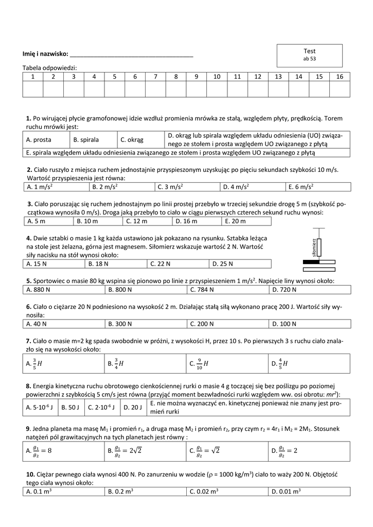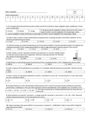 Test Imię i nazwisko: ____________________________________ Tabela odpowiedzi: 1 2 3 4 5 6 7 8 ab 53 9 10 11 12 13 14 15 16 1. Po wirującej płycie gramofonowej idzie wzdłuż promienia mrówka ze stałą, względem płyty, prędkością. Torem ruchu mrówki jest: D. okrąg lub spirala względem układu odniesienia (UO) związaA. prosta B. spirala C. okrąg nego ze stołem i prosta względem UO związanego z płytą E. spirala względem układu odniesienia związanego ze stołem i prosta względem UO związanego z płytą 2. Ciało ruszyło z miejsca ruchem jednostajnie przyspieszonym uzyskując po pięciu sekundach szybkości 10 m/s. Wartość przyspieszenia jest równa: A. 1 m/s2 B. 2 m/s2 C. 3 m/s2 D. 4 m/s2 E. 6 m/s2 3. Ciało poruszając się ruchem jednostajnym po linii prostej przebyło w trzeciej sekundzie drogę 5 m (szybkość początkowa wynosiła 0 m/s). Droga jaką przebyło to ciało w ciągu pierwszych czterech sekund ruchu wynosi: A. 5 m B. 10 m C. 12 m D. 16 m E. 20 m siłomierz 4. Dwie sztabki o masie 1 kg każda ustawiono jak pokazano na rysunku. Sztabka leżąca na stole jest żelazna, górna jest magnesem. Siłomierz wskazuje wartość 2 N. Wartość siły nacisku na stół wynosi około: A. 15 N B. 18 N C. 22 N D. 25 N 5. Sportowiec o masie 80 kg wspina się pionowo po linie z przyspieszeniem 1 m/s2. Napięcie liny wynosi około: A. 880 N B. 800 N C. 784 N D. 720 N 6. Ciało o ciężarze 20 N podniesiono na wysokość 2 m. Działając stałą siłą wykonano pracę 200 J. Wartość siły wynosiła: A. 40 N B. 300 N C. 200 N D. 100 N 7. Ciało o masie m=2 kg spada swobodnie w próżni, z wysokości H, przez 10 s. Po pierwszych 3 s ruchu ciało znalazło się na wysokości około: 3 A. 5 𝐻 3 B. 4 𝐻 9 C. 10 𝐻 4 D. 5 𝐻 8. Energia kinetyczna ruchu obrotowego cienkościennej rurki o masie 4 g toczącej się bez poślizgu po poziomej powierzchni z szybkością 5 cm/s jest równa (przyjąć moment bezwładności rurki względem ww. osi obrotu: mr2): E. nie można wyznaczyć en. kinetycznej ponieważ nie znany jest proA. 5·10-6 J B. 50 J C. 2·10-6 J D. 20 J mień rurki 9. Jedna planeta ma masę M1 i promień r1, a druga masę M2 i promień r2, przy czym r2 = 4r1 i M2 = 2M1. Stosunek natężeń pól grawitacyjnych na tych planetach jest równy : 𝑔 A. 𝑔1 = 8 2 𝑔 B. 𝑔1 = 2√2 2 𝑔 C. 𝑔1 = √2 2 𝑔 D. 𝑔1 = 2 2 10. Ciężar pewnego ciała wynosi 400 N. Po zanurzeniu w wodzie ( = 1000 kg/m3) ciało to waży 200 N. Objętość tego ciała wynosi około: A. 0.1 m3 B. 0.2 m3 C. 0.02 m3 D. 0.01 m3 11. Łyżwiarka wykonując piruet zbliża ramiona do tułowia. Energia kinetyczna tancerki: A. maleje B. nie zmienia się C. rośnie D. rośnie lub maleje w zależności od szybkości zbliżania ramion 12. W naczyniu cylindryczny, zamkniętym tłokiem, ogrzano izobarycznie gaz od temperatury 400 K do 600 K, przy czym tłok przesunął się o 2 cm (rys.). Wysokość słupa h gazu przed pogrzaniem była równa: A. 2 cm B. 3 cm C. 4cm D. 6 cm E. 10 cm h 13. Gaz doskonały uległ kolejno przemianie: 1 → 2 → 3 (rys.). W wyniku przemiany 1 → 2 objętość gazu: A. pozostała stała B. wzrosła 2-krotnie C. wzrosła 4-krotnie D. zmalała 2-krotnie E. zmalała 4-krotnie p 2 po po p[Pa] 2 3 1 T 0 To 105 V[m3] 3To 0.2 0.4 0.6 0.8 14. Podczas przemiany pokazanej na wykresie (powyżej, z prawej) gaz pobrał ciepło Q=4·105 J. Energia wewnętrzna gazu zmieniła się o: A. 3.4·105 J B. 4.6·105 J C. 3.2·105 J D. 4.8·105 J 15. Ciało wykonujące drgania harmoniczne o amplitudzie 2 cm osiąga maksymalną szybkość 50 cm/s. Maksymalne przyspieszenie ciała ma wartość: A. 25 cm/s2 B. 50 cm/s2 C. 100 cm/s2 D. 125 cm/s2 16. Ciało o masie m=0.03 kg wykonuje drgania harmoniczne, przy czym maksymalna wartość pędu ciała p=6·10-3 kg·m/s. W położeniu maksymalnego wychylenia energia kinetyczna ciała jest równa: A. 2·10-4 J B. 4·10-4 J C. 6·10-4 J D. 0 J E. 2·10-5 J W obliczeniach przyjąć wartość przyspieszenia ziemskiego g=10 m/s2 Należy odpowiedzieć na 12 wybranych pytań. Punktacja: odpowiedź dobra – odpowiedź zła – brak odpowiedzi – Zaliczenie od 18 punktów. Czas: 45 minut. 3 punkty; minus 1 punkt; zero punktów.