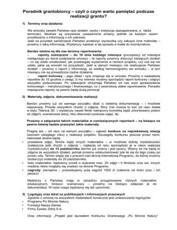 Poradnik grantobiorcy – czyli o czym warto pamiętać podczas realizacji grantu? 1) Terminy oraz działania We wniosku zawarli Państwo opis działań, osoby i instytucje zaangażowane, a także terminarz. Możliwe są oczywiście uzasadnione zmiany, jednak za każdym razem prosilibyśmy o informację o ich zakresie. Jeśli na przykład zamierzacie Państwo przełożyć wycieczkę czy zakupić inne materiały – prosimy o taką informację. Wystarczy napisać w tej sprawie e-maila do koordynatora. Bardzo istotne są dla nas terminy raportowania: – raporty miesięczne – do 10 dnia każdego miesiąca (począwszy od miesiąca następnego po dacie podpisania umowy) – te raporty powinny dotyczyć bieżących działań – co się udało zrealizować, jak przebiegały wydarzenia w ramach projektu, czy coś się nie udało, jakie są wnioski na przyszłość. Jeśli w danym miesiącu nie realizujecie Państwo działań – prosimy o raport z informacją, że według harmonogramu we wniosku – w tym miesiącu nie są prowadzone żadne działania, – raport końcowy – jego skład i opis znajduje się w umowie. Prosimy o nadesłanie raportów do 10 grudnia z uwagi, iż my również musimy sporządzić raport końcowy i zdążyć wszystko podsumować. Po wakacjach otrzymają Państwo od nas wzór sprawozdania końcowego – merytorycznego i finansowego, co z pewnością ułatwi raportowanie. Ponadto miesięczne raporty na pewno będą dużą pomocą! 2) Materiały, zdjęcia, dokumentowanie realizacji Bardzo prosimy już od samego początku dbać o rzetelną dokumentację – i możliwie najszerszą. Przede wszystkim chodzi o zdjęcia, filmy (nie muszą to być od razu dzieła w stylu Titanica 3D :) wystarczy nawet filmik nakręcony komórką bądź zmontowany potem ze zdjęć!), scenariusze lekcji, listy obecności podczas zajęć, itp. Prosimy o załączanie takich materiałów w comiesięcznych raportach – na bieżąco na pewno łatwiej będzie przesyłać takie materiały. • • • Pragnę też – od razu na samym początku – ogłosić konkurs na najciekawszą relację (wzorem ubiegłego roku) z realizacji projektu. Szczegóły konkursu jeszcze przed nami, natomiast istotne będą: przesłanie zdjęć, filmów bądź innych materiałów – w możliwie dobrej rozdzielczości (zwłaszcza jeśli chodzi o zdjęcia – najlepiej od razu sporządzać je w nieco większej rozdzielczości) do 15 października (termin już znamy i jest pewny. Wiemy że nie będą to zdjęcia ze wszystkich działań, jednak prosimy udokumentować tyle ile się do tego czasu po prostu uda. Termin wiąże się z pracami nad stroną internetową Programu, do której musimy dostarczyć materiały do 20 października, ilość materiałów: będziemy prosili o wybranie max. 20 zdjęć i 5 filmików oraz ew. innych mediów, które mogłyby się znaleźć na stronie Programu nagrody: pieniężne – przewidujemy pulę nagród 1500 zł (zależnie od ilości prac i ich jakości) Niektórzy z Państwa mają w zanadrzu przygotowanie różnych materiałów edukacyjnych, broszur, scenariuszy – prosimy na bieżąco załączać je do dokumentacji. W razie czego będziemy się też upominać. 3) Logotypy oraz tekst na publikacjach i informacjach prasowych Zgodnie z umową na wszystkich materiałach konieczne jest umieszczanie logotypów: • Programu Po Stronie Natury • Fundacji Nasza Ziemia • Firmy Żywiec Zdrój S.A. Oraz informacji: „Projekt jest laureatem Konkursu Grantowego „Po Stronie Natury” 2011/2012 organizowanego przez Fundację Nasza Ziemia. Grant ufundowała Firma Żywiec Zdrój S.A. Więcej na temat Konkursu: www.postronienatury.pl” Tyczy się to: stron internetowych, informacji prasowych, zakupu sprzętów (laptopy, projektory, kamery), zakładanych ogrodów (wtedy należy zadbać o niewielką tabliczkę w ogrodzie), wszelkich gadżetach (koszulki, kubki, itp.), folderach, ulotkach i innych publikacjach. Jeśli na jakichś materiałach nie ma możliwości umieszczenia tych informacji (bo są one małe), prosimy wówczas o zamieszczenia adresu www Programu. 4) Informacje o działaniach Będę się do Państwa zwracała z prośbą o napisanie króciutkich tekstów z realizowanych działań, które moglibyśmy również zamieszczać na naszej stronie – jako aktualności, aby informować i promować Państwa działania. Tak jak wstępnie się rozeznałam – będę prosiła mniej więcej o 4 takie „aktualności”, natomiast jeśli sami Państwo zechcą podsyłać informacje o ciekawych wydarzeniach, które moglibyśmy publikować na www.naszaziemia.pl i na koncie na Facebook'u Fundacji – to zapraszam gorąco :) 5) Finanse i budżet Myślę że to oczywista oczywistość, że należy realizować projekt zgodnie z budżetem :) Jednak może się tak zdarzyć, że coś się zmieni, coś będzie droższe, coś tańsze. Można dokonywać zmian i przesunięć w budżecie – jednak tutaj bardzo prosimy o przysłanie zapytania o taką możliwość. Odpowiadamy zawsze szybko i w 99% przypadków twierdząco, jednak Państwa prośba jest nam potrzebna potem do rozliczeń ze sponsorem. Jeśli na koniec projektu zostaną Państwu środki – to bardzo proszę o kontakt przed ich zwrotem na nasze konto! 6) Inne różności • • • bardzo Państwa proszę – w przypadku realizacji planów nasadzeń ogrodów, sadów, skalniaków, szpalerów drzew i innych dóbr tego rodzaju – o sadzenie gatunków rodzimych, polskich. To samo dotyczy rozdawania sadzonek czy też nasion. W szkółkach, centrach ogrodniczych zawsze są dostępne gatunki rodzime, a jeśli mieliby Państwo pytania czy trudności w tym zakresie – zapraszam do kontaktu, gdyby coś się zmieniało – adres (mailowy), nr telefonu, osoba koordynująca – bardzo proszę o kontakt i zapewne kolejna oczywista oczywistość – bardzo Państwa proszę o zadbanie o bezpieczeństwo uczestników wszystkich działań. Sporo jest ostatnio ró