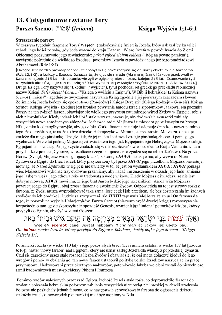 PYTANIA i ODPOWIEDZI do PARSZY SZEMOT 2 Mojż. 1;1-6;1: