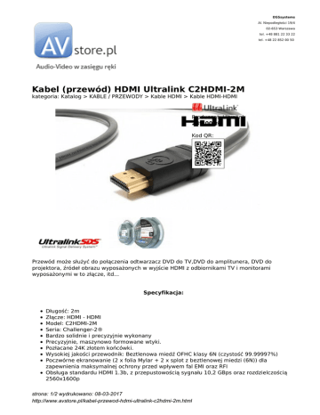 DSSsystems Al. Niepodległości 19/4 02-653 Warszawa tel. +48 881 22 33 22 tel. +48 22 852 00 50 Kabel (przewód) HDMI Ultralink C2HDMI-2M kategoria: Katalog > KABLE / PRZEWODY > Kable HDMI > Kable HDMI-HDMI Producent: Ultralink 289,00 zł Kod QR: Przewód może służyć do połączenia odtwarzacz DVD do TV,DVD do amplitunera, DVD do projektora, źródeł obrazu wyposażonych w wyjście HDMI z odbiornikami TV i monitorami wyposażonymi w to złącze, itd... Specyfikacja: Długość: 2m Złącze: HDMI - HDMI Model: C2HDMI-2M Seria: Challenger-2® Bardzo solidnie i precyzyjnie wykonany Precyzyjnie, maszynowo formowane wtyki. Pozłacane 24K złotem końcówki. Wysokiej jakości przewodnik: Beztlenowa miedź OFHC klasy 6N (czystość 99.99997%) Poczwórne ekranowanie (2 x folia Mylar + 2 x splot z beztlenowej miedzi (6N)) dla zapewnienia maksymalnej ochrony przed wpływem fal EMI oraz RFI Obsługa standardu HDMI 1.3b, z przepustowością sygnału 10,2 GBps oraz rozdzielczością 2560x1600p strona: 1/2 wydrukowano: 08-03-2017 http://www.avstore.pl/kabel-przewod-hdmi-ultralink-c2hdmi-2m.html Wspiera rozdzielczości 720p i 1080p Obsługuje sygnał video wysokiej rozdzielczości o 48-bitowej głębi koloru. Bardzo wytrzymała powłoka zewnętrzna. Izolacja: Spieniony polietylen Jest to oryginalny przewód marki Ultralink, pochodzący bezpośrednio od polskiego dystrybutora. Przewód dostępny jest w innych długościach: 0.5m (200zł) | 1m (241zł) | 2m (289zł) | 3m (298zł) | 4m (479zł) | 5m (531zł) | Wszystkie podane ceny (zawierają podatek VAT 23%). Klientów zainteresowanych większymi zakupami lub współpracą prosimy o kontakt: (22) 852 00 50, lub [email protected] Wszystkie loga oraz znaki firmowe wykorzystane w opisach na stronie AVstore.pl . należą do ich prawnych właścicieli i mają wyłącznie charakter informacyjny strona: 2/2 wydrukowano: 08-03-2017 http://www.avstore.pl/kabel-przewod-hdmi-ultralink-c2hdmi-2m.html
