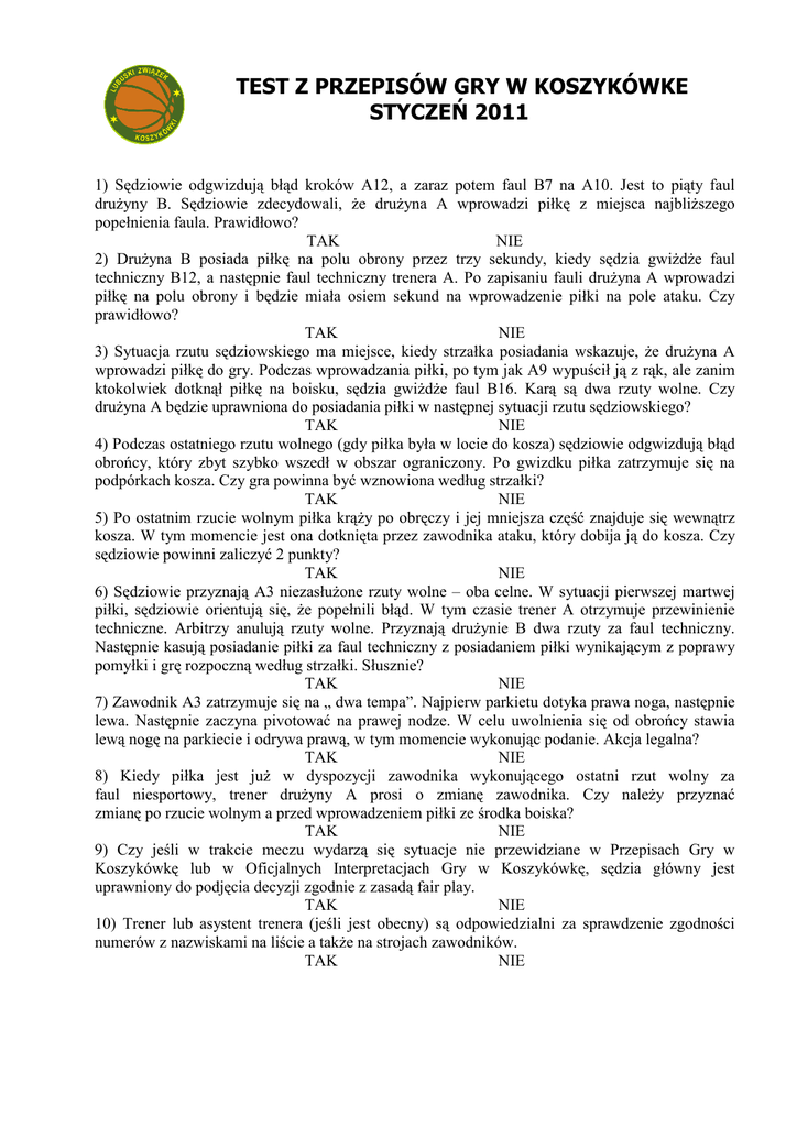 TEST Z PRZEPISÓW GRY W KOSZYKÓWKE STYCZEŃ 2011 1) Sędziowie odgwizdują błąd kroków A12, a zaraz potem faul B7 na A10. Jest to piąty faul druŜyny B. Sędziowie zdecydowali, Ŝe druŜyna A wprowadzi piłkę z miejsca najbliŜszego popełnienia faula. Prawidłowo? TAK NIE 2) DruŜyna B posiada piłkę na polu obrony przez trzy sekundy, kiedy sędzia gwiŜdŜe faul techniczny B12, a następnie faul techniczny trenera A. Po zapisaniu fauli druŜyna A wprowadzi piłkę na polu obrony i będzie miała osiem sekund na wprowadzenie piłki na pole ataku. Czy prawidłowo? TAK NIE 3) Sytuacja rzutu sędziowskiego ma miejsce, kiedy strzałka posiadania wskazuje, Ŝe druŜyna A wprowadzi piłkę do gry. Podczas wprowadzania piłki, po tym jak A9 wypuścił ją z rąk, ale zanim ktokolwiek dotknął piłkę na boisku, sędzia gwiŜdŜe faul B16. Karą są dwa rzuty wolne. Czy druŜyna A będzie uprawniona do posiadania piłki w następnej sytuacji rzutu sędziowskiego? TAK NIE 4) Podczas ostatniego rzutu wolnego (gdy piłka była w locie do kosza) sędziowie odgwizdują błąd obrońcy, który zbyt szybko wszedł w obszar ograniczony. Po gwizdku piłka zatrzymuje się na podpórkach kosza. Czy gra powinna być wznowiona według strzałki? TAK NIE 5) Po ostatnim rzucie wolnym piłka krąŜy po obręczy i jej mniejsza część znajduje się wewnątrz kosza. W tym momencie jest ona dotknięta przez zawodnika ataku, który dobija ją do kosza. Czy sędziowie powinni zaliczyć 2 punkty? TAK NIE 6) Sędziowie przyznają A3 niezasłuŜone rzuty wolne – oba celne. W sytuacji pierwszej martwej piłki, sędziowie orientują się, Ŝe popełnili błąd. W tym czasie trener A otrzymuje przewinienie techniczne. Arbitrzy anulują rzuty wolne. Przyznają druŜynie B dwa rzuty za faul techniczny. Następnie kasują posiadanie piłki za faul techniczny z posiadaniem piłki wynikającym z poprawy pomyłki i grę rozpoczną według strzałki. Słusznie? TAK NIE 7) Zawodnik A3 zatrzymuje się na „ dwa tempa”. Najpierw parkietu dotyka prawa noga, następnie lewa. Następnie zaczyna pivotować na prawej nodze. W celu uwolnienia się od obrońcy stawia lewą nogę na parkiecie i odrywa prawą, w tym momencie wykonując podanie. Akcja legalna? TAK NIE 8) Kiedy piłka jest juŜ w dyspozycji zawodnika wykonującego ostatni rzut wolny za faul niesportowy, trener druŜyny A prosi o zmianę zawodnika. Czy naleŜy przyznać zmianę po rzucie wolnym a przed wprowadzeniem piłki ze środka boiska? TAK NIE 9) Czy jeśli w trakcie meczu wydarzą się sytuacje nie przewidziane w Przepisach Gry w Koszykówkę lub w Oficjalnych Interpretacjach Gry w Koszykówkę, sędzia główny jest uprawniony do podjęcia decyzji zgodnie z zasadą fair play. TAK NIE 10) Trener lub asystent trenera (jeśli jest obecny) są odpowiedzialni za sprawdzenie zgodności numerów z nazwiskami na liście a takŜe na strojach zawodników. TAK NIE