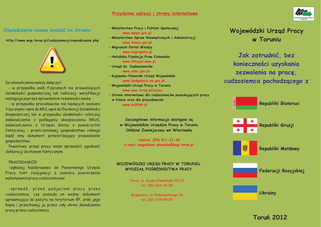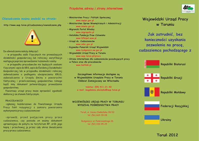 Przydatne adresy i strony internetowe Oświadczenie można znaleźć na stronie: http://www.wup.torun.pl/cudzoziemcy/oswiadczenie.php Do oświadczenia należy dołączyć: - w przypadku osób fizycznych nie prowadzących działalności gospodarczej lub rolniczej: weryfikacja następuje poprzez sprawdzenie tożsamości osoby - w przypadku pracodawców nie będących osobami fizycznymi: wpis do KRS, wpis do Ewidencji Działalności Gospodarczej lub w przypadku działalności rolniczej zaświadczenie o podleganiu ubezpieczeniu KRUS, zaświadczenie z Urzędu Gminy o powierzchni faktycznej i przeliczeniowej gospodarstwa rolnego bądź inny dokument potwierdzający prowadzenie gospodarstwa. Powiatowy urząd pracy może sprawdzić zgodność deklaracji ze stanem faktycznym. PRACODAWCO! -zgłaszaj każdorazowo do Powiatowego Urzędu Pracy fakt rezygnacji z zamiaru powierzenia wykonywania pracy cudzoziemcowi -sprawdź, przed podjęciem pracy przez cudzoziemca, czy posiada on ważny dokument uprawniający do pobytu na terytorium RP, zrób jego kopię i przechowuj ją przez cały okres świadczenia pracy przez cudzoziemca. • Ministerstwo Pracy i Polityki Społecznej www.mpips.gov.pl • Ministerstwo Spraw Wewnętrznych i Administracji www.mswia.gov.pl • Migrancki Portal Wiedzy www.migrapolis.pl • Helsińska Fundacja Praw Człowieka www.hfhrpol.waw.pl • Urząd ds. Cudzoziemców www.udsc.gov.pl • Kujawsko-Pomorski Urząd Wojewódzki www.bydgoszcz.uw.gov.pl • Wojewódzki Urząd Pracy w Toruniu www.wup.torun.pl/praca • Strona internetowa dla cudzoziemców poszukujących pracy w Polsce oraz dla pracodawców www.kultlink.pl Szczegółowe informacje dostępne są w Wojewódzkim Urzędzie Pracy w Toruniu Oddział Zamiejscowy we Włocławku telefon: (54) 411-21-40 e-mail: [email protected] WOJEWÓDZKI URZĄD PRACY W TORUNIU WYDZIAŁ POŚREDNICTWA PRACY Wojewódzki Urząd Pracy w Toruniu Jak zatrudnić, bez konieczności uzyskania zezwolenia na pracę, cudzoziemca pochodzącego z Republiki Białorusi Republiki Gruzji Republiki Mołdowy Federacji Rosyjskiej Toruń, ul. Szosa Chełmińska 30/32 tel. (56) 669-39-08 Bydgoszcz, ul. Paderewskiego 26 tel. (52) 339-95-25 Ukrainy Toruń 2012 Uproszczona procedura zatrudnienia w Polsce obywateli Białorusi, Gruzji, Mołdowy, Rosji i Ukrainy. Pracodawca może zatrudnić cudzoziemca w okresie nie przekraczającym 6 miesięcy w ciągu kolejnych 12 miesięcy liczonych od pierwszego wjazdu cudzoziemca. W tym celu dokonuje rejestracji oświadczenia o zamiarze powierzenia wykonywania pracy cudzoziemcowi w powiatowym urzędzie pracy, właściwym ze względu na siedzibę lub miejsce zamieszkania składającego oświadczenie. Oświadczenie można pobrać w każdym powiatowym urzędzie pracy. Dokument ten nie jest umową o pracę lecz oświadczeniem potwierdzającym gotowość powierzenia pracy cudzoziemcowi, z podaniem nazwy zawodu, miejsca pracy, daty rozpoczęcia i okresu wykonywania pracy, proponowanego wynagrodzenia, rodzaju umowy, na podstawie której praca będzie wykonywana. Ponadto powierzający pracę zobowiązany jest złożyć oświadczenie o zapoznaniu się z przepisami dotyczącymi zatrudnienia cudzoziemców oraz, że nie ma możliwości zaspokojenia potrzeb kadrowych w oparciu o lokalny rynek pracy. Procedura rejestracji odbywa się w trakcie jednorazowej wizyty w powiatowym urzędzie pracy i jest bezpłatna. Powiatowy urząd pracy umieszcza na oświadczeniu adnotację o rejestracji. Oryginał oświadczenia pracodawca powinien przekazać cudzoziemcowi. Zarejestrowane oświadczenie stanowi podstawę do uzyskania przez cudzoziemca wizy pobytowej w celu wykonywania pracy w polskiej placówce dyplomatyczno-konsularnej w kraju jego stałego pobytu . Ważne informacje traktowanie osób wykonujących pracę, w tym ze względu na narodowość lub obywatelstwo. • Pracodawca może powierzyć pracę cudzoziemcowi • Wystawianie oświadczenia niezgodnego z rzeczywistym na podstawie umowy o pracę (lub pracę nakładczą) lub umów zamiarem może być potraktowane jako udział w wyłudzaniu cywilnoprawnych (agencyjnej, zlecenia lub innej umowy wizy i karane na podstawie przepisów Kodeksu karnego. o świadczenie usług do której stosuje się przepisy dotyczące • zlecenia). w sposób ciągły (pełne 6 miesięcy) lub w kilku okresach • Pracodawca, który zatrudnia cudzoziemca jest zobowiązany krótszych uwarunkowanych potrzebą pracodawcy. do jego zgłoszenia w terminie 7 dni od rozpoczęcia pracy • do ZUS oraz comiesięcznego odprowadzania składek pracodawcy, niemniej na nowym pracodawcy spoczywa w należnej wysokości. o b o w i ąz e k d o d at k o w e j re j e s t racj i o ś w i ad cz e ni a, • Podmiot powierzający wykonywanie pracy na podstawie a cudzoziemiec musi uzyskać odpowiedni dokument umowy o pracę lub umów cywilnoprawnych jest zobowiązany umożliwiający dalszy, legalny pobyt. Również przesunięcie do wypełniania obowiązków płatnika. Szczególnie dotyczy w czasie rzeczywistego okresu zatrudnienia z przyczyn to obliczania, pobierania i wpłacania zaliczek na podatek niezależnych od pracodawcy i pracownika skutkuje ponownym dochodowy lub zryczałtowanego podatku dochodowego, złożeniem oświadczenia przez pracodawcę i uzyskaniem przez na zasadach określonych w ustawie z 26 lipca 1991 r. o podatku cudzoziemca dokumentu umożliwiającego dalszy, legalny dochodowym od osób fizycznych (Dz. U. z 2000 r., Nr 14, poz. pobyt. 176 z późn. zm.), z uwzględnieniem postanowień właściwej Podstawa prawna umowy o unikaniu podwójnego opodatkowania, której stroną •Art. 90 ust. 4 ustawy z dnia 20 kwietnia 2004 r. o promocji jest Rzeczpospolita Polska. zatrudnienia i instytucjach rynku pracy (Dz. U. z 2008 r., Nr 69 • poz. 415 z późn. zm.) W przypadku zamiaru powierzenia cudzoziemcowi pracy Okres dopuszczalnego zatrudnienia można wykorzystać W trakcie pobytu w Polsce dopuszczalna jest zmiana w okresie przekraczającym 6 mies