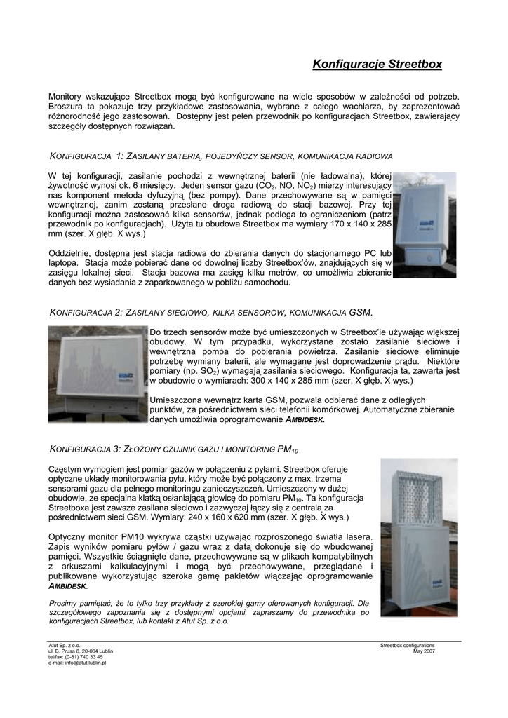 AM Konfiguracje Streetbox Monitory wskazujące Streetbox mogą być konfigurowane na wiele sposobów w zależności od potrzeb. Broszura ta pokazuje trzy przykładowe zastosowania, wybrane z całego wachlarza, by zaprezentować różnorodność jego zastosowań. Dostępny jest pełen przewodnik po konfiguracjach Streetbox, zawierający szczegóły dostępnych rozwiązań. KONFIGURACJA 1: ZASILANY BATERIĄ, POJEDYŃCZY SENSOR, KOMUNIKACJA RADIOWA W tej konfiguracji, zasilanie pochodzi z wewnętrznej baterii (nie ładowalna), której żywotność wynosi ok. 6 miesięcy. Jeden sensor gazu (CO2, NO, NO2) mierzy interesujący nas komponent metoda dyfuzyjną (bez pompy). Dane przechowywane są w pamięci wewnętrznej, zanim zostaną przesłane droga radiową do stacji bazowej. Przy tej konfiguracji można zastosować kilka sensorów, jednak podlega to ograniczeniom (patrz przewodnik po konfiguracjach). Użyta tu obudowa Streetbox ma wymiary 170 x 140 x 285 mm (szer. X głęb. X wys.) Oddzielnie, dostępna jest stacja radiowa do zbierania danych do stacjonarnego PC lub laptopa. Stacja może pobierać dane od dowolnej liczby Streetbox’ów, znajdujących się w zasięgu lokalnej sieci. Stacja bazowa ma zasięg kilku metrów, co umożliwia zbieranie danych bez wysiadania z zaparkowanego w pobliżu samochodu. KONFIGURACJA 2: ZASILANY SIECIOWO, KILKA SENSORÓW, KOMUNIKACJA GSM. Do trzech sensorów może być umieszczonych w Streetbox’ie używając większej obudowy. W tym przypadku, wykorzystane zostało zasilanie sieciowe i wewnętrzna pompa do pobierania powietrza. Zasilanie sieciowe eliminuje potrzebę wymiany baterii, ale wymagane jest doprowadzenie prądu. Niektóre pomiary (np. SO2) wymagają zasilania sieciowego. Konfiguracja ta, zawarta jest w obudowie o wymiarach: 300 x 140 x 285 mm (szer. X głęb. X wys.) Umieszczona wewnątrz karta GSM, pozwala odbierać dane z odległych punktów, za pośrednictwem sieci telefonii komórkowej. Automatyczne zbieranie danych umożliwia oprogramowanie AMBIDESK. KONFIGURACJA 3: ZŁOŻONY CZUJNIK GAZU I MONITORING PM10 Częstym wymogiem jest pomiar gazów w połączeniu z pyłami. Streetbox oferuje optyczne układy monitorowania pyłu, który może być połączony z max. trzema sensorami gazu dla pełnego monitoringu zanieczyszczeń. Umieszczony w dużej obudowie, ze specjalna klatką osłaniającą głowicę do pomiaru PM10. Ta konfiguracja Streetboxa jest zawsze zasilana sieciowo i zazwyczaj łączy się z centralą za pośrednictwem sieci GSM. Wymiary: 240 x 160 x 620 mm (szer. X głęb. X wys.) Optyczny monitor PM10 wykrywa cząstki używając rozproszonego światła lasera. Zapis wyników pomiaru pyłów / gazu wraz z datą dokonuje się do wbudowanej pamięci. Wszystkie ściągnięte dane, przechowywane są w plikach kompatybilnych z arkuszami kalkulacyjnymi i mogą być przechowywane, przeglądane i publikowane wykorzystując szeroka gamę pakietów włączając oprogramowanie AMBIDESK. Prosimy pamiętać, że to tylko trzy przykłady z szerokiej gamy oferowanych konfiguracji. Dla szczegółowego zapoznania się z dostępnymi opcjami, zapraszamy do przewodnika po konfiguracjach Streetbox, lub kontakt z Atut Sp. z o.o. Atut Sp. z o.o. ul. B. Prusa 8, 20-064 Lublin tel/fax: (0-81) 740 33 45 e-mail: [email protected] Streetbox configurations May 2007