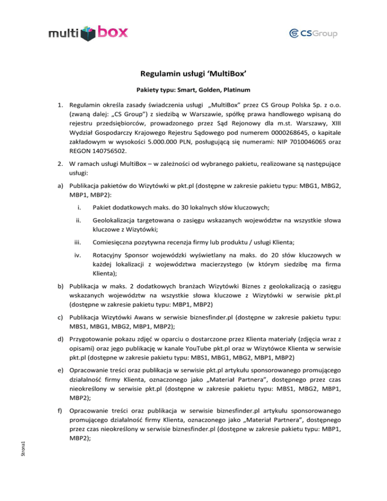 Regulamin usługi ‘MultiBox’ Pakiety typu: Smart, Golden, Platinum 1. Regulamin określa zasady świadczenia usługi „MultiBox” przez CS Group Polska Sp. z o.o. (zwaną dalej: „CS Group”) z siedzibą w Warszawie, spółkę prawa handlowego wpisaną do rejestru przedsiębiorców, prowadzonego przez Sąd Rejonowy dla m.st. Warszawy, XIII Wydział Gospodarczy Krajowego Rejestru Sądowego pod numerem 0000268645, o kapitale zakładowym w wysokości 5.000.000 PLN, posługującą się numerami: NIP 7010046065 oraz REGON 140756502. 2. W ramach usługi MultiBox – w zależności od wybranego pakietu, realizowane są następujące usługi: a) Publikacja pakietów do Wizytówki w pkt.pl (dostępne w zakresie pakietu typu: MBG1, MBG2, MBP1, MBP2): i. Pakiet dodatkowych maks. do 30 lokalnych słów kluczowych; ii. Geolokalizacja targetowana o zasięgu wskazanych województw na wszystkie słowa kluczowe z Wizytówki; iii. Comiesięczna pozytywna recenzja firmy lub produktu / usługi Klienta; iv. Rotacyjny Sponsor wojewódzki wyświetlany na maks. do 20 słów kluczowych w każdej lokalizacji z województwa macierzystego (w którym siedzibę ma firma Klienta); b) Publikacja w maks. 2 dodatkowych branżach Wizytówki Biznes z geolokalizacją o zasięgu wskazanych województw na wszystkie słowa kluczowe z Wizytówki w serwisie pkt.pl (dostępne w zakresie pakietu typu: MBP1, MBP2) c) Publikacja Wizytówki Awans w serwisie biznesfinder.pl (dostępne w zakresie pakietu typu: MBS1, MBG1, MBG2, MBP1, MBP2); d) Przygotowanie pokazu zdjęć w oparciu o dostarczone przez Klienta materiały (zdjęcia wraz z opisami) oraz jego publikację w kanale YouTube pkt.pl oraz w Wizytówce Klienta w serwisie pkt.pl (dostępne w zakresie pakietu typu: MBS1, MBG1, MBG2, MBP1, MBP2) e) Opracowanie treści oraz publikacja w serwisie pkt.pl artykułu sponsorowanego promującego działalność firmy Klienta, oznaczonego jako „Materiał Partnera”, dostępnego przez czas nieokreślony w serwisie pkt.pl (dostępne w zakresie pakietu typu: MBS1, MBG2, MBP1, MBP2); Strona1 f) Opracowanie treści oraz publikacja w serwisie biznesfinder.pl artykułu sponsorowanego promującego działalność firmy Klienta, oznaczonego jako „Materiał Partnera”, dostępnego przez czas nieokreślony w serwisie biznesfinder.pl (dostępne w zakresie pakietu typu: MBP1, MBP2); g) Opracowanie treści oraz publikacja w serwisie pkt.pl artykułu eksperckiego promującego działalność firmy Klienta z logo firmy, oznaczonego jako „Materiał Partnera”, dostępnego przez czas nieokreślony w serwisie pkt.pl (dostępne w zakresie pakietu typu: MBP2); h) Przygotowanie szablonowej kreacji e-mailingowej oraz zrealizowanie jednorazowej wysyłki szablonowego pakietu mailingowego do grupy maksymalnie 5000 odbiorców wybranych przez CS Group na podstawie kryterium geograficznego, gdzie lokalizacja siedziby Klienta stanowi podstawę doboru odbiorców (dostępne w zakresie pakietu typu: MBS1, MBG1, MBG2, MBP1, MBP2); i) Przygotowanie kreacji Double Billboard (750x200px) oraz zrealizowanie kampanii display w modelu CPM na maks. do 10000 odsłon w sieci CS Group (serwisy pkt.pl, biznesfinder.pl, wertykale tematyczne) – obie w zasięgu wskazanych województw lub ogólnopolskim; domyślnie przyjmuje się opcję zasięgu ogólnopolskiego (dostępne w zakresie pakietu typu: MBG2, MBP1, MBP2); j) Przygotowanie kreacji Billboard na Smartfony (320x80px) oraz zrealizowanie kampanii display w modelu CPM na maks. do 1000 odsłon w wersji mobilnej serwisu pkt.pl wyświetlanej na urządzeniach mobilnych w rozdzielczości od 320 do 767px w zasięgu wskazanych województw lub ogólnopolskim; domyślnie przyjmuje się opcję zasięgu ogólnopolskiego (dostępne w zakresie pakietu typu: MBP2); k) Publikacja treści oraz galerii zdjęć z Wizytówki pkt.pl na stronach FanPage dedykowanej firmie Klienta w serwisie społecznościowym Facebook (dostępne w zakresie pakietu typu: MBG1, MBG2, MBP1, MBP2), przy czym; l) i. Domyślnie CS Group zakłada FanPage dla firmy Klienta i przekazuje Klientowi dostęp administracyjny na wskazany przez niego adres e-mail, którym Klient loguje się do prywatnego konta w serwisie Facebook, przenosząc tym samym prawa administratora; ii. W przypadku otrzymania przez CS Group od Klienta praw administratora do FanPage Klienta, CS Group dokona instalacji aplikacji umożliwiającej publikację wskazanych elementów Wizytówki Biznes bezpośrednio na stronie FanPage Klienta; Założenie profilu dedykowanego firmie Klienta wraz z jedną publikacją we wskazanym serwisie społecznościowym zgodnie ze specyfikacją danego pakietu (dostępne w zakresie pakietu typu: MBP1, MBP2) razem z przekazaniem Klientowi dostępu administracyjnego. Strona2 3. W ramach realizacji poszczególnych składowych usługi MultiBox, o których mowa w puncie 2, możliwe są do wyboru przez Klienta inne zamienne elementy zamiast danej składowej pakietu zgodnie ze wskazaniami w specyfikacji pakietów. W przypadku zaznaczenia w specyfikacji wyboru danego zamiennika – realizowane będą zamiennie wybrane elementy. 4. Do treści przygotowanego przez CS Group artykułu eksperckiego lub sponsorowanego, o którym mowa w punkcie 2e-f-g. powyżej Klient ma prawo zgłoszenia nie więcej niż dwóch poprawek. W przypadku braku zgłoszonych uwag w terminie 7 dni kalendarzowych od dnia przesłania przez CS Group projektu artykułu do akceptacji, CS Group uzna, że Klient wyraził akceptację domyślną i dokona publikacji artykułu we wskazanym serwisie - pkt.pl lub biznesfinder.pl. 5. Wysyłka szablonowego pakietu mailingowego, o którym mowa w punkcie 2h. powyżej zrealizowana zostanie w terminie nie dłuższym niż 60 dni kalendarzowych od daty publikacji Wizytówki w serwisie pkt.pl, o której mowa w punkcie 2h. Kreacja reklamy e-mailingowej kierować będzie odbiorcę mailingu do Wizytówki w serwisie pkt.pl. Klient otrzyma drogą elektroniczną raport potwierdzający r