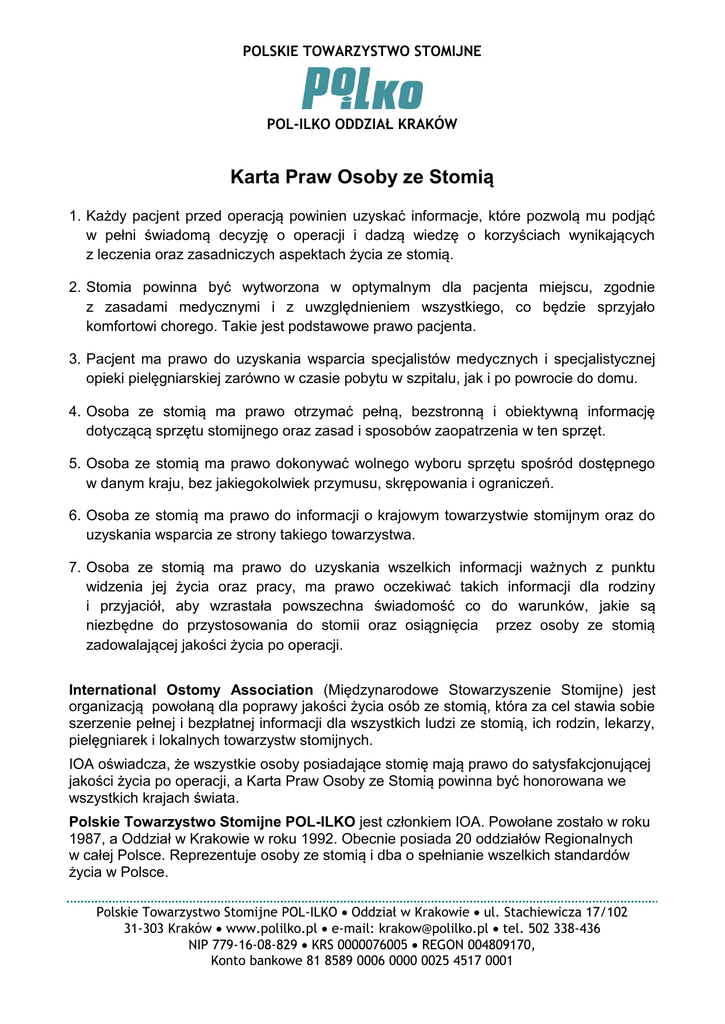 POLSKIE TOWARZYSTWO STOMIJNE POL-ILKO ODDZIAŁ KRAKÓW Karta Praw Osoby ze Stomią 1. Każdy pacjent przed operacją powinien uzyskać informacje, które pozwolą mu podjąć w pełni świadomą decyzję o operacji i dadzą wiedzę o korzyściach wynikających z leczenia oraz zasadniczych aspektach życia ze stomią. 2. Stomia powinna być wytworzona w optymalnym dla pacjenta miejscu, zgodnie z zasadami medycznymi i z uwzględnieniem wszystkiego, co będzie sprzyjało komfortowi chorego. Takie jest podstawowe prawo pacjenta. 3. Pacjent ma prawo do uzyskania wsparcia specjalistów medycznych i specjalistycznej opieki pielęgniarskiej zarówno w czasie pobytu w szpitalu, jak i po powrocie do domu. 4. Osoba ze stomią ma prawo otrzymać pełną, bezstronną i obiektywną informację dotyczącą sprzętu stomijnego oraz zasad i sposobów zaopatrzenia w ten sprzęt. 5. Osoba ze stomią ma prawo dokonywać wolnego wyboru sprzętu spośród dostępnego w danym kraju, bez jakiegokolwiek przymusu, skrępowania i ograniczeń. 6. Osoba ze stomią ma prawo do informacji o krajowym towarzystwie stomijnym oraz do uzyskania wsparcia ze strony takiego towarzystwa. 7. Osoba ze stomią ma prawo do uzyskania wszelkich informacji ważnych z punktu widzenia jej życia oraz pracy, ma prawo oczekiwać takich informacji dla rodziny i przyjaciół, aby wzrastała powszechna świadomość co do warunków, jakie są niezbędne do przystosowania do stomii oraz osiągnięcia przez osoby ze stomią zadowalającej jakości życia po operacji. International Ostomy Association (Międzynarodowe Stowarzyszenie Stomijne) jest organizacją powołaną dla poprawy jakości życia osób ze stomią, która za cel stawia sobie szerzenie pełnej i bezpłatnej informacji dla wszystkich ludzi ze stomią, ich rodzin, lekarzy, pielęgniarek i lokalnych towarzystw stomijnych. IOA oświadcza, że wszystkie osoby posiadające stomię mają prawo do satysfakcjonującej jakości życia po operacji, a Karta Praw Osoby ze Stomią powinna być honorowana we wszystkich krajach świata. Polskie Towarzystwo Stomijne POL-ILKO jest członkiem IOA. Powołane zostało w roku 1987, a Oddział w Krakowie w roku 1992. Obecnie posiada 20 oddziałów Regionalnych w całej Polsce. Reprezentuje osoby ze stomią i dba o spełnianie wszelkich standardów życia w Polsce. Polskie Towarzystwo Stomijne POL-ILKO Oddział w Krakowie ul. Stachiewicza 17/102 31-303 Kraków www.polilko.pl e-mail: [email protected] tel. 502 338-436 NIP 779-16-08-829 KRS 0000076005 REGON 004809170, Konto bankowe 81 8589 0006 0000 0025 4517 0001