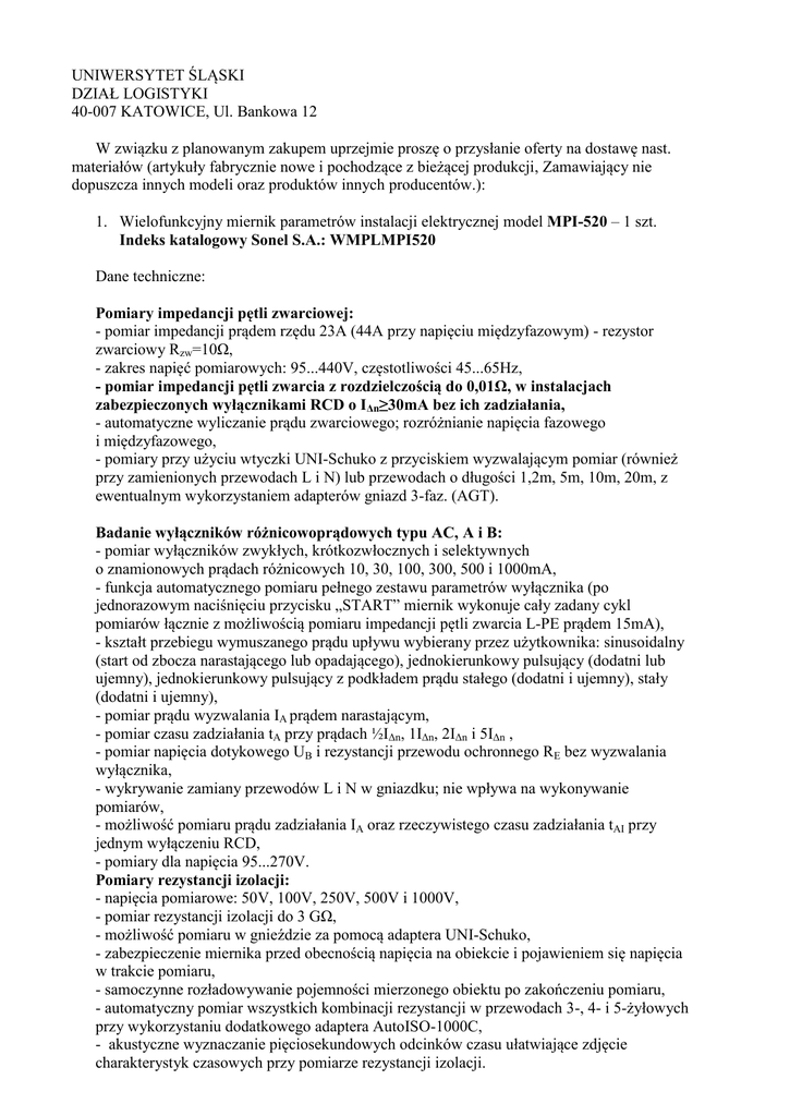 UNIWERSYTET ŚLĄSKI DZIAŁ LOGISTYKI 40-007 KATOWICE, Ul. Bankowa 12 W związku z planowanym zakupem uprzejmie proszę o przysłanie oferty na dostawę nast. materiałów (artykuły fabrycznie nowe i pochodzące z bieżącej produkcji, Zamawiający nie dopuszcza innych modeli oraz produktów innych producentów.): 1. Wielofunkcyjny miernik parametrów instalacji elektrycznej model MPI-520 – 1 szt. Indeks katalogowy Sonel S.A.: WMPLMPI520 Dane techniczne: Pomiary impedancji pętli zwarciowej: - pomiar impedancji prądem rzędu 23A (44A przy napięciu międzyfazowym) - rezystor zwarciowy Rzw=10Ω, - zakres napięć pomiarowych: 95...440V, częstotliwości 45...65Hz, - pomiar impedancji pętli zwarcia z rozdzielczością do 0,01Ω, w instalacjach zabezpieczonych wyłącznikami RCD o IΔn≥30mA bez ich zadziałania, - automatyczne wyliczanie prądu zwarciowego; rozróżnianie napięcia fazowego i międzyfazowego, - pomiary przy użyciu wtyczki UNI-Schuko z przyciskiem wyzwalającym pomiar (również przy zamienionych przewodach L i N) lub przewodach o długości 1,2m, 5m, 10m, 20m, z ewentualnym wykorzystaniem adapterów gniazd 3-faz. (AGT). Badanie wyłączników różnicowoprądowych typu AC, A i B: - pomiar wyłączników zwykłych, krótkozwłocznych i selektywnych o znamionowych prądach różnicowych 10, 30, 100, 300, 500 i 1000mA, - funkcja automatycznego pomiaru pełnego zestawu parametrów wyłącznika (po jednorazowym naciśnięciu przycisku „START” miernik wykonuje cały zadany cykl pomiarów łącznie z możliwością pomiaru impedancji pętli zwarcia L-PE prądem 15mA), - kształt przebiegu wymuszanego prądu upływu wybierany przez użytkownika: sinusoidalny (start od zbocza narastającego lub opadającego), jednokierunkowy pulsujący (dodatni lub ujemny), jednokierunkowy pulsujący z podkładem prądu stałego (dodatni i ujemny), stały (dodatni i ujemny), - pomiar prądu wyzwalania IA prądem narastającym, - pomiar czasu zadziałania tA przy prądach ½IΔn, 1IΔn, 2IΔn i 5IΔn , - pomiar napięcia dotykowego UB i rezystancji przewodu ochronnego RE bez wyzwalania wyłącznika, - wykrywanie zamiany przewodów L i N w gniazdku; nie wpływa na wykonywanie pomiarów, - możliwość pomiaru prądu zadziałania IA oraz rzeczywistego czasu zadziałania tAI przy jednym wyłączeniu RCD, - pomiary dla napięcia 95...270V. Pomiary rezystancji izolacji: - napięcia pomiarowe: 50V, 100V, 250V, 500V i 1000V, - pomiar rezystancji izolacji do 3 GΩ, - możliwość pomiaru w gnieździe za pomocą adaptera UNI-Schuko, - zabezpieczenie miernika przed obecnością napięcia na obiekcie i pojawieniem się napięcia w trakcie pomiaru, - samoczynne rozładowywanie pojemności mierzonego obiektu po zakończeniu pomiaru, - automatyczny pomiar wszystkich kombinacji rezystancji w przewodach 3-, 4- i 5-żyłowych przy wykorzystaniu dodatkowego adaptera AutoISO-1000C, - akustyczne wyznaczanie pięciosekundowych odcinków czasu ułatwiające zdjęcie charakterystyk czasowych przy pomiarze rezystancji izolacji. Niskonapięciowy pomiar rezystancji połączeń ochronnych i wyrównawczych: - pomiar ciągłości przewodu ochronnego prądem ≥200 mA w dwóch kierunkach, - pomiar małym prądem z sygnalizacją akustyczną, - autokalibracja przewodów pomiarowych - możliwość stosowania przewodów dowolnej długości. Pomiary rezystancji uziemienia: - pomiar metodą techniczną 3- przewodową z 2 elektrodami pomocniczymi, - wewnętrzne źródło napięcia o częstotliwości odpowiedniej dla sieci 50/60Hz. Szybkie sprawdzanie poprawności podłączenia przewodu ochronnego PE za pomocą elektrody dotykowej. Pomiar napięcia, częstotliwości oraz - przy użyciu dodatkowych cęgów - prądu przemiennego, cosφ oraz mocy (czynnej, biernej, pozornej). Sprawdzanie kolejności faz. Pamięć 990 rekordów (57500 pojedynczych wyników), wyjście USB do komputera PC. Zasilanie z baterii lub akumulatora (opcja). Przyrząd spełnia wymagania normy PN-EN 61557. Bezpieczeństwo elektryczne: - rodzaj izolacji: podwójna, zgodnie z PN-EN 61010-1 i IEC 61557 - kategoria pomiarowa: IV 300V wg PN-EN 61010-1 - stopień ochrony obudowy wg PN-EN 60529: IP54 Pozostałe dane techniczne: - zasilanie miernika: baterie alkaliczne LR14 (4 szt.) lub akumulator Ni-MH (opcja) 1. Oferta powinna zawierać: – ceny jednostkowe, – wartość brutto ogółem obejmującą koszty artykułów oraz ich dostarczenia do siedziby zamawiającego, – termin dostawy ( wyrażony jako ilość dni od daty podpisania umowy do dostawy) – długość gwarancji, – warunki płatności, – numer NIP, – podpis osoby upoważnionej (wymienionej w KRS lub zaświadczeniu o wpisie do ewidencji działalności gospodarczej). Uwaga: Warunkiem akceptacji oferty jest zaoferowanie płatności przelewem po realizacji dostawy, w terminie minimum 14 dni. W przypadu otrzymania od Państwa oferty z najniższą ceną, do stworzenia z Państwem ewentualnej umowy na dostawę w/w materiałów niezbędne będą dokumenty: 2. Aktualny odpis z KRS albo zaświadczenie o wpisie do ewidencji działalności gospodarczej zawierające w szczególności przedmiot działalności oraz sposób reprezentacji firmy. W wypadku odpisu dokumentu wymienionego w pkt. 2. datowanego wcześniej niż 6 miesięcy przed podpisaniem umowy osoba upoważniona winna zaświadczyć aktualność danych zawartych w odpisie na dzień poświadczenia. Ofertę wraz z dokumentami należy przesłać mailem do dnia 11.03.2011 r. do godziny 14.00 na adres mailowy osoby odpowiedzialnej: [email protected] dot. wniosku 24203 z poważaniem Leszek walczak