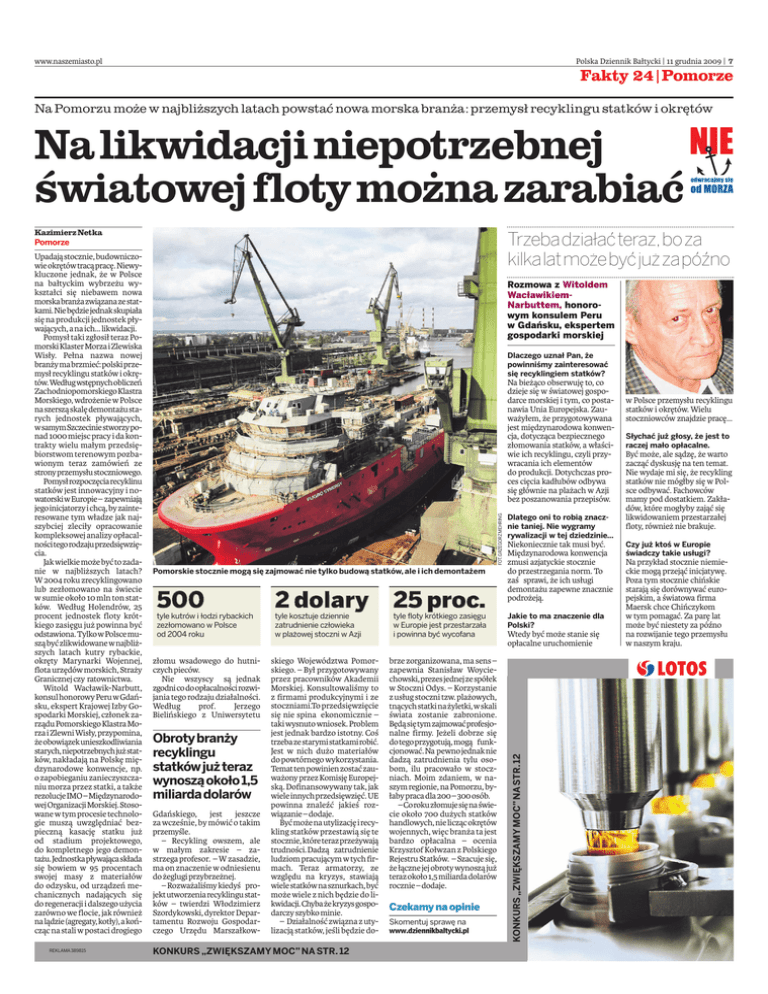 Polska Dziennik Bałtycki | 11 grudnia 2009 | 7 www.naszemiasto.pl Fakty 24|Pomorze Na Pomorzu może w najbliższych latach powstać nowa morska branża: przemysł recyklingu statków i okrętów Nalikwidacjiniepotrzebnej światowejflotymożnazarabiać Kazimierz Netka Pomorze REKLAMA389815 Trzebadziałaćteraz,boza kilkalatmożebyćjużzapóźno Rozmowa z Witoldem WacławikiemNarbuttem, honorowym konsulem Peru w Gdańsku, ekspertem gospodarki morskiej Dlaczego uznał Pan, że powinniśmy zainteresować się recyklingiem statków? Na bieżąco obserwuję to, co dzieje się w światowej gospodarce morskiej i tym, co postanawia Unia Europejska. Zauważyłem, że przygotowywana jest międzynarodowa konwencja, dotycząca bezpiecznego złomowania statków, a właściwie ich recyklingu, czyli przywracania ich elementów do produkcji. Dotychczas proces cięcia kadłubów odbywa się głównie na plażach w Azji bez poszanowania przepisów. Pomorskie stocznie mogą się zajmować nie tylko budową statków, ale i ich demontażem 500 2 dolary 25 proc. tyle kutrów i łodzi rybackich zezłomowano w Polsce od 2004 roku tyle kosztuje dziennie zatrudnienie człowieka w plażowej stoczni w Azji tyle floty krótkiego zasięgu w Europie jest przestarzała i powinna być wycofana złomu wsadowego do hutniczych pieców. Nie wszyscy są jednak zgodnicodoopłacalnościrozwijania tego rodzaju działalności. Według prof. Jerzego Bielińskiego z Uniwersytetu Obroty branży recyklingu statków już teraz wynoszą około 1,5 miliarda dolarów Gdańskiego, jest jeszcze za wcześnie, by mówić o takim przemyśle. – Recykling owszem, ale w małym zakresie – zastrzega profesor. – W zasadzie, ma on znaczenie w odniesienu do żeglugi przybrzeżnej. – Rozważaliśmy kiedyś projektutworzeniarecyklingustatków – twierdzi Włodzimierz Szordykowski, dyrektor Departamentu Rozwoju Gospodarczego Urzędu Marszałkow- skiego Województwa Pomorskiego. – Był przygotowywany przez pracowników Akademii Morskiej. Konsultowaliśmy to z firmami produkcyjnymi i ze stoczniami.To przedsięwzięcie się nie spina ekonomicznie – taki wysnuto wniosek. Problem jest jednak bardzo istotny. Coś trzebazestarymistatkamirobić. Jest w nich dużo materiałów do powtórnego wykorzystania. Temattenpowinienzostaćzauważony przez Komisję Europejską. Dofinansowywany tak, jak wiele innych przedsięwzięć. UE powinna znaleźć jakieś rozwiązanie – dodaje. Byćmożenautylizacjęirecykling statków przestawią się te stocznie,któreterazprzeżywają trudności.Dadzą zatrudnienie ludziom pracującym w tych firmach. Teraz armatorzy, ze względu na kryzys, stawiają wielestatkównasznurkach,być może wiele z nich będzie do likwidacji.Chybażekryzysgospodarczy szybko minie. – Działalność związna z utylizacją statków, jeśli będzie do- KONKURS „ZWIĘKSZAMY MOC” NA STR. 12 brze zorganizowana, ma sens – zapewnia Stanisław Woyciechowski,prezesjednejzespółek w Stoczni Odys. – Korzystanie z usług stoczni tzw. plażowych, tnącychstatkinażyletki,wskali świata zostanie zabronione. Będąsiętymzajmowaćprofesjonalne firmy. Jeżeli dobrze się dotegoprzygotują,mogą funkcjonować.Na pewnojednaknie dadzą zatrudnienia tylu osobom, ilu pracowało w stoczniach. Moim zdaniem, w naszym regionie, na Pomorzu, byłaby praca dla 200 – 300 osób. –Corokuzłomujesięnaświecie około 700 dużych statków handlowych, nie licząc okrętów wojennych, więc branża ta jest bardzo opłacalna – ocenia Krzysztof Kołwzan z Polskiego Rejestru Statków. – Szacuje się, że łączne jej obroty wynoszą już terazokoło1,5miliardadolarów rocznie – dodaje. Czekamy na opinie Skomentuj sprawę na www.dziennikbaltycki.pl Dlatego oni to robią znacznie taniej. Nie wygramy rywalizacji w tej dziedzinie... Niekoniecznie tak musi być. Międzynarodowa konwencja zmusi azjatyckie stocznie do przestrzegania norm. To zaś sprawi, że ich usługi demontażu zapewne znacznie podrożeją. Jakie to ma znaczenie dla Polski? Wtedy być może stanie się opłacalne uruchomienie KONKURS „ZWIĘKSZAMY MOC” NA STR. 12 FOT.GRZEGORZMEHRING Upadająstocznie,budowniczowieokrętówtracąpracę.Niewykluczone jednak, że w Polsce na bałtyckim wybrzeżu wykształci się niebawem nowa morskabranżazwiązanazestatkami.Niebędziejednakskupiała się na produkcji jednostek pływających, a na ich... likwidacji. Pomysł taki zgłosił teraz PomorskiKlasterMorzaiZlewiska Wisły. Pełna nazwa nowej branżymabrzmieć:polskiprzemysł recyklingu statków i okrętów.Wedługwstępnychobliczeń ZachodniopomorskiegoKlastra Morskiego, wdrożenie w Polsce naszersząskalędemontażustarych jednostek pływających, wsamymSzczeciniestworzyponad 1000 miejsc pracy i da kontrakty wielu małym przedsiębiorstwom terenowym pozbawionym teraz zamówień ze stronyprzemysłustoczniowego. Pomysłrozpoczęciarecyklinu statków jest innowacyjny i nowatorskiwEuropie– zapewniają jegoinicjatorzyichcą,byzainteresowane tym władze jak najszybciej zleciły opracowanie kompleksowej analizy opłacalnościtegorodzajuprzedsięwzięcia. Jak wielkie może być to zadanie w najbliższych latach? W 2004 roku zrecyklingowano lub zezłomowano na świecie w sumie około 10 mln ton statków. Według Holendrów, 25 procent jednostek floty krótkiego zasięgu już powinna być odstawiona. TylkowPolscemusząbyćzlikwidowanewnajbliższych latach kutry rybackie, okręty Marynarki Wojennej, flota urzędów morskich, Straży Granicznej czy ratownictwa. Witold Wacławik-Narbutt, konsulhonorowyPeruwGdańsku, ekspert Krajowej Izby Gospodarki Morskiej, członek zarządu Pomorskiego Klastra Morza i Zlewni Wisły, przypomina, żeobowiązekunieszkodliwiania starych,niepotrzebnychjużstatków, nakładają na Polskę międzynarodowe konwencje, np. o zapobieganiu zanieczyszczaniu morza przez statki, a także rezolucjeIMO–MiędzynarodowejOrganizacjiMorskiej.Stosowane w tym procesie technologie muszą uwzględn