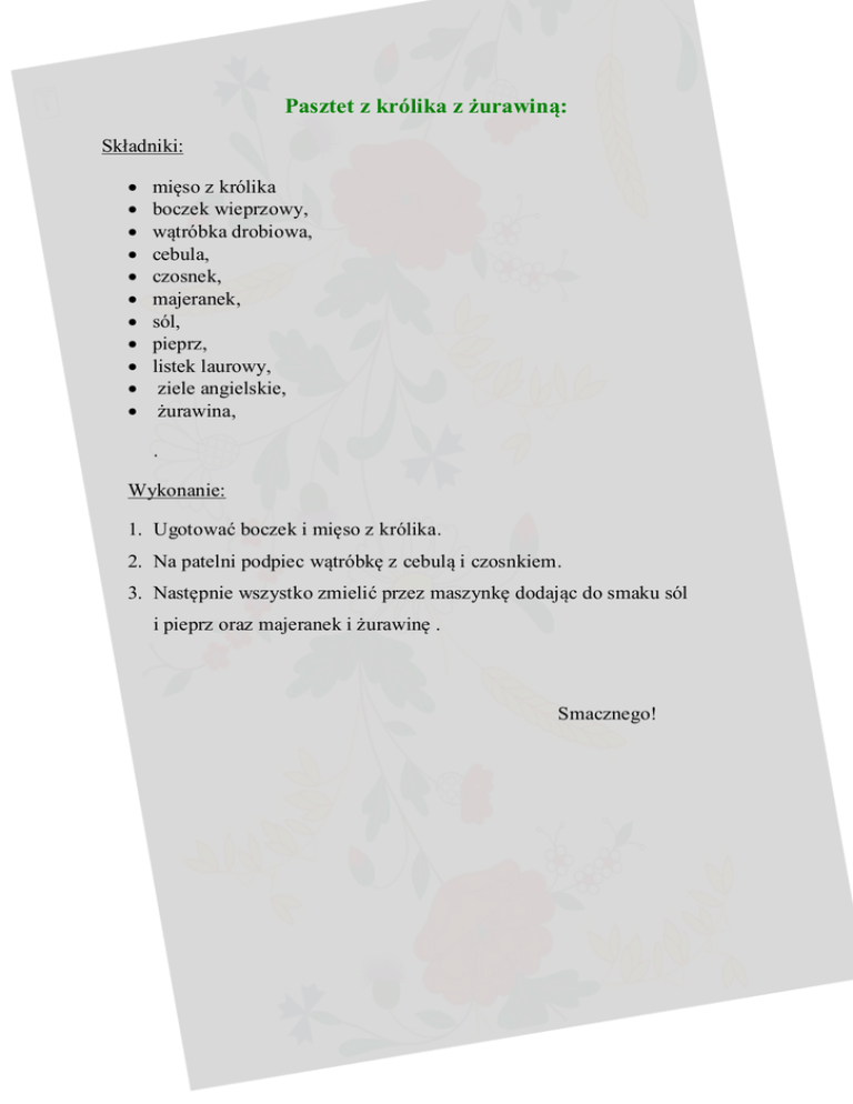 Pasztet z królika z żurawiną: Składniki: mięso z królika boczek wieprzowy, wątróbka drobiowa, cebula, czosnek, majeranek, sól, pieprz, listek laurowy, ziele angielskie, żurawina, . Wykonanie: 1. Ugotować boczek i mięso z królika. 2. Na patelni podpiec wątróbkę z cebulą i czosnkiem. 3. Następnie wszystko zmielić przez maszynkę dodając do smaku sól i pieprz oraz majeranek i żurawinę . Smacznego!