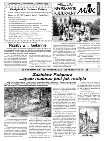 Owiêcimskie Centrum Kultury `````````````````````` `````````````````````` ```````````````````````````````` sk³ada serdeczne podziêkowania Fundatorom nagród Konkursu XXXVI Tygodnia Kultury Beskidzkiej. MIEJSKI INFORMA INFORMATTOR KUL TURALNY KULTURALNY Strona I r wydarzy³o siê r wydarzy³o siê r wydarzy³o siê r Nagrody ufundowali: - Przewodnicz¹cy Rady Miejskiej w Owiêcimiu - Prezydent Miasta Owiêcimia - Dyrektor Zarz¹du Budynków Mieszkalnych w Owiêcimiu - Dyrektor Przedsiêbiorstwa Wodoci¹gów i Kanalizacji w Owiêcimiu - Dyrektor Zak³adu Us³ug Komunalnych w Owiêcimiu - Dyrektor Miejskiego Zak³adu Energetyki Cieplnej w Owiêcimiu - ROWERLAND, Sprzeda¿ i naprawa rowerów, ul. Rowerowa 10, Owiêcim - ARAL, Stacja paliw, ul. Nideckiego 31, Owiêcim - FAKTORIA s.c., ul. Królowej Jadwigi 24, Owiêcim - RADIO CCM, ul. Chemików 1, Owiêcim - BASS, Salon audio-video, ul. Olszewskiego 14, Owiêcim ```````````````````````````````` VI Ogólnopolski Plener Malarski w Zatorze Rzeby w ... fontannie Przez ca³y tydzieñ by³ centrum ¿ycia plastycznego regionu. 30 malarzy, nieprofesjonalnych i zawodowców m. in. z Gdañska, Szczecina, Olsztyna, Ostrowa Wielkopolskiego, Ostródy, ale te¿ z pobliskiego Wodzis³awia l¹skiego, BielskaBia³ej i Owiêcimia, tworzy³o w Zatorze swoje prace. - Od 6 lat Ogólnopolski Plener Ma- czas nam mija naprawdê radonie polarski w Zatorze przyci¹ga wielu artystów. wiedzia³a pani Józefa Momot, komisarz Jest to nie tylko okazja do stworzenia no- pleneru. wych, ciekawych obrazów czy rzeb, ale I tym razem nie rozczarowa³ on ani te¿ mo¿liwoæ doskonalenia warsztatu artystów, ani, zawsze chêtnych do podtwórczego; co szczególnie dla artystów gl¹dania ich przy pracy widzów. nieprofesjonalnych jest bardzo wa¿ne. No - Od kilku lat, zawsze latem czekam i spotykamy siê w gronie przyjació³, wiêc na plener. Bardzo lubiê patrzeæ, jak po- r PREZENTACJE Uczestnicy VI Ogólnopolskiego Pleneru Malarskiego. Foto. P. Mordan wstaje obraz. A na dodatek artyci, któNa wielu obrazach uwieczniono odrzy przyje¿d¿aj¹ do Zatora to ludzie bar- chodz¹ce ju¿ w przesz³oæ malownicze dzo sympatyczni. Ciekawie opowiadaj¹ zak¹tki ziemi zatorskiej, jej zabytki, stare o swojej pracy, jej technikach; o tym, sk¹d domki, zabudowania gospodarcze, umieczerpi¹ inspiracjê, opowiadaj¹ te¿ o so- raj¹ce drzewa. bie. Z wieloma mo¿na porozmawiaæ zuPodoba³y siê te¿ wszystkim rzeby pe³nie zwyczajnie, o ¿yciu powiedzia³a wykonane w czasie pleneru, a wystawia15 letnia Ania, która od 4 lat obserwuje ne w ... zatorskiej fontannie. plenery. Plener zorganizowa³ Orodek KultuPodobnie jak inni mieszkañcy Zatory i Towarzystwo Mi³oników Ziemi ra, którzy przybyli na prezentacjê prac powsta³ych w³anie w ich miejscowoci. Zatorskiej. Gmina, której pomogli sponWielu na obrazach odnalaz³o siebie sa- sorzy sfinansowa³a ca³e przedsiêwziêcie. mych, bo artyci chêtnie portretowali swoich widzów i przechodniów. r PREZENTACJE EW r PREZENTACJE r Zdzis³aw Po³¹carz ...¿ycie malarza jest jak motyla Jednym z bardziej znanych w wiecie owiêcimskich plastyków jest Zdzis³aw Po³¹carz. Zaczyna³ swoj¹ przygodê ze sztuk¹ jako twórca nieprofesjonalny. Nadal zreszt¹ jest cz³onkiem grupy twórców Na Zamku, choæ jego twórczoæ ju¿ od dawna nosi znamiona profesjonalizmu. Artysta specjalizuje siê w pejza¿ach oraz uwiecznianiu zabytkowej architektury sakralnej i wieckiej. Pos³uguje siê g³ównie rysunkiem i akwarel¹. Rzadziej olejem. Droga rozwoju jego osobowoci jest doæ d³uga i ciekawa. Od realistycznych rysunków przez pastelowe, impresjonistyczne akwarele, po twórczoæ bardziej ekspresyjn¹, o wiêkszym zró¿nicowaniu barwy, a w ostatnim okresie podejmowania prób z pogranicza abstrakcji. Zdzis³aw Po³¹carz jest twórc¹ bardzo aktywnym. Uczestniczy w wielu plenerach, nierzadko w roli ich komisarza. Czêsto wystawia swoje prace równie¿ za granic¹, zw³aszcza w Niemczech. Jest te¿ laureatem wielu nagród, zarówno artystycznych jak i za upowszechnianie kultury polskiej, w tym nagród pañstwowych. Znamienne jest jednak, ¿e u siebie, w Owiêcimiu jest ma³o dostrzegany, szczególnie przez w³adze miejskie. Tegoroczny kalendarz artysty zawiera 13 plenerów, 8 wystaw krajowych i 2 zagraniczne. Miejmy nadziejê, ¿e jego najnowsze dokonania bêdziemy mogli zobaczyæ te¿ w Owiêcimiu. W oczekiwaniu na wystawê prac Po³¹carza postanowi³em sprawdziæ, co u niego s³ychaæ, co robi, co tworzy. W tym roku ju¿ wystawia³ swoje prace w krakowskiej galerii Pod or³em, krotoszyñskiej galerii Refektarz aby zaraz potem wróciæ do Krakowa, tym razem do galerii Przewóz. Teraz jego akwarele mo¿na zobaczyæ w Chrzanowie w Miejskiej Bibliotece Publicznej. Jest to osiemdziesi¹ta wystawa indywidualna tego artysty. Jego prace s¹ te¿ teraz prezentowane w krakowskiej galerii Na piêterku W tym roku artysta zamierza jeszcze zaprezentowaæ swoje dzie³a w Czechach: we wrzeniu w Brnie i w padzierniku w Popradzie. Potem wróci do Polski. Jego wystawy mo¿na bêdzie zobaczyæ m. in. w Mys³owicach w galerii Podwórze, w Krotoszynie w galerii Refektarz, w Olsztynie w galerii Na zamku Bardzo wa¿nym elementem w jego ¿yciu s¹ plenery. W lutym Zdzis³aw Po³¹carz uczestniczy³ w plenerze zimowym w Krotoszynie, a w marcu w plenerze pt. Uroki podziemi Wieliczki. Teraz przebywa na kolejnym plenerze pt. Uroki Zebrzydowic. - Do koñca roku wezmê udzia³ jeszcze w dziesiêciu plenerach w ró¿nych miejscowociach w Polsce. Bêdê m. in. w Lipnicy Dolnej ko³o Winicza, Kazimierzu Dolnym, Niemczy, Jastarni i Szczytnie powiedzia³ artysta. Sezon to zaiste pracowity. Warto dodaæ, ¿e w ubieg³ym roku Zdzis³aw Po³¹carz wyda³ tomik poetycki pt. Taniec z fraszkami. Jedn¹ z nich mo¿na chyba uznaæ za motto jego twórczoci: ¿ycie malarza jest jak motyla/ gdy chwyta pêdzel, to p³ótno zapyla. Henryk Bieniasz Strona II MIEJSKI INFORMA INFORMATTOR KUL TURALNY KULTURALNY