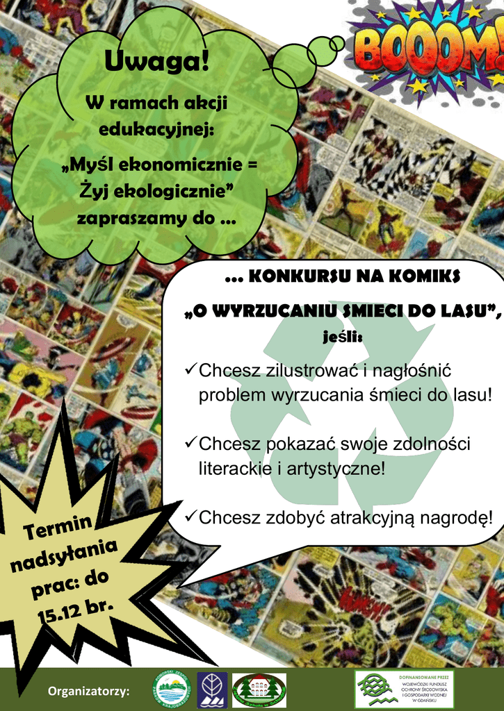 Uwaga! W ramach akcji edukacyjnej: „Myśl ekonomicznie = Żyj ekologicznie” zapraszamy do … … KONKURSU NA KOMIKS „O WYRZUCANIU SMIECI DO LASU”, jeśli: Chcesz zilustrować i nagłośnić problem wyrzucania śmieci do lasu! Chcesz pokazać swoje zdolności literackie i artystyczne! Chcesz zdobyć atrakcyjną nagrodę! Organizatorzy: