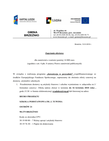GMINA BRZEŹNIO ul. Wspólna 44 98-275 Brzeźnio; pow. sieradzki tel. (0-43) 820-30-26, fax. (0-43) 820-36-71 www.brzeznio.pl ; e-mail: [email protected] Brzeźnio, 13.IV.2010 r. Zapytanie ofertowe dla zamówień o wartości poniŜej 14 000 euro (zgodnie z art. 4 pkt. 8 ustawy Prawo zamówień publicznych) W związku z realizacją programu „Inwestycja w przyszłość” współfinansowanego ze środków Europejskiego Funduszu Społecznego, zapraszamy do złoŜenia oferty cenowej na dostawę artykułów szkolnych. 1. Przedmiotem dostawy są artykuły biurowe i szkolne wymienione w załączniku nr.1/ formularz cenowy/. Ofertę naleŜy złoŜyć w terminie do 16 kwietnia 2010 roku , godz.15.30 w formie elektronicznej/ [email protected] lub listownej na adres: BIURO PROJEKTU SZKOŁA PODSTAWOWA IM. J. TUWIMA OSTRÓW 21 98-275 BRZEŹNIO Kody ze słownika CPV: 30 19 00 00 – 7 RóŜny sprzęt i artykuły biurowe 30 19 76 30 – 1 Papier do drukowania 2. Oferta powinna zawierać propozycje cenowe na wszystkie pomoce. Brak propozycji cenowej na którykolwiek składnik moŜe powodować odrzucenie oferty bez jej merytorycznego rozpatrzenia. 3. Kryterium wyboru ofert : cena Sposób oceny ofert: C(cena oferty) = najniŜsza cena łączna spośród złoŜonych ofert: cena łączna oferty badanej x 100 pkt. Zamawiający wybierze ofertę cenową dostawcy odpowiadającą wszystkim wymogom postawionym przez niego dla prawidłowej realizacji zamówienia. Zamawiający wybierze ofertę Dostawcy, który zaoferuje najkorzystniejszą wartość ogółem oferty. 4. Miejsce dostawy: BIURO PROJEKTU SZKOŁA PODSTAWOWA IM. JULIANA TUWIMA OSTRÓW 21 98-275 BRZEŹNIO 5. Warunki płatności: Przelew na rachunek bankowy Wykonawcy wskazany w fakturze w terminie do 15 dni od daty otrzymania prawidłowo wystawionej faktury. 6. Termin związania ofertą cenową wynosi 30 dni od dnia otwarcia ofert przez Zamawiającego. 7. O wynikach postępowania jego uczestnicy zostaną poinformowani drogą faxową lub e-mailową w ciągu dwóch dni od dnia rozstrzygnięcia. Przed podpisaniem umowy do podmiotu wybranego w wyniku rozstrzygnięcia postępowania zostanie skierowane zlecenie realizacji zamówienia. 8. Zamówienie do wybranego oferenta zostanie podpisana bezpośrednio po zakończeniu oceny i wyborze najkorzystniejszej oferty. 9. Wszystkie pomoce muszą posiadać atesty i instrukcję w języku polskim. 10. Czas realizacji zamówienia nie dłuŜszy niŜ 14 dni. 11. Wszelkie informacje moŜna uzyskać u Pani Ewy Dobruchowskiej nr. telefon 043/820 30 23 Wójt Gminy /-/ mgr Dorota Kubiak Załącznik nr 1 Formularz cenowy w postępowaniu na dostawę artykułów biurowych i szkolnych L.P 1 2 3 4 5 6 7 8 NAZWA Plecak uczniowski(materiał wodoodporny, usztywniany) Nośnik pamięci 2GB Piórnik z wyposaŜeniem (duŜy – wyposaŜenie: 12 mazaków, długopis, ołówek, gumka, linijka, temperówka) Piórnik z kredkami Bambino 9 szt w twardej oprawie (średni) Etui z 3 długopisami(typu Zenith) Zestaw 10 szt. długopisów kolorowych Ŝelowych Teczka laminowana z gumką + zestaw3 szt. długopisów kolorowych Ŝelowych Teczka kartonowa pokryta okleiną i folią polipropylenową, zamykana na gumkę. Posiada 3 boczne skrzydła. Format A4. Szerokość grzbietu 35 mm. SZTUKI CENA JEDNOSTOWA BRUTTO 1 1 1 1 1 1 15 7 Łączna wartość WARTOŚĆ BRUTTO