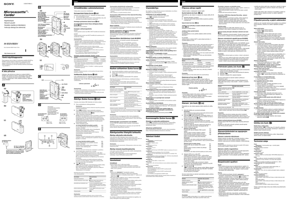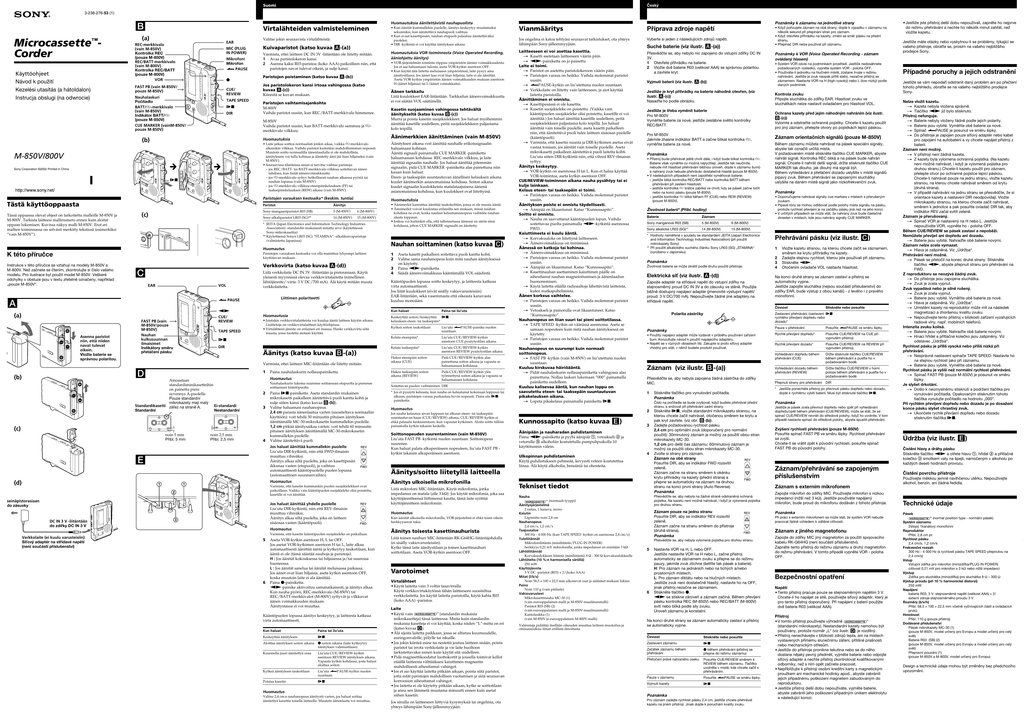 Suomi Český 3-238-276-53 (1) Huomautuksia äänitettävistä nauhapuolista B Microcassette™Corder Käyttöohjeet Návod k použití Kezelési utasítás (a hátoldalon) Instrucja obslugi (na odwrocie) Virtalähteiden valmisteleminen (a) EAR REC-merkkivalo (vain M-850V) Kontrolka REC (pouze M-850V) REC/BATT-merkkivalo (vain M-800V) Kontrolka REC/BATT (pouze M-800V) VOR MIC (PLUG IN POWER) Mikrofoni Mikrofon > PAUSE z FAST PB (vain M-850V/ pouze M-850V) CUE/ REVIEW Nauhalaskuri Počitadlo BATT/E-merkkivalo (vain M-850V) Indikátor BATT/E (pouze M-850V) CUE MARKER (vainM-850V/ pouze M-850V) TAPE SPEED Tx DIR Kuivaparistot (katso kuvaa A-(a)) Varmista, ettei laitteen DC IN 3V -liitäntään ole liitetty mitään. 1 Avaa paristolokeron kansi. 2 Asenna kaksi R03-paristoa (koko AAA) paikoilleen niin, että paristojen navat tulevat oikein, ja sulje kansi. Paristojen poistaminen (katso kuvaa A-(b)) Jos paristolokeron kansi irtoaa vahingossa (katso kuvaa A-(c)) Kiinnitä se kuvan mukaan. Paristojen vaihtamisajankohta M-800V Vaihda paristot uusiin, kun REC/BATT-merkkivalo himmenee. M-850V Vaihda paristot uusiin, kun BATT-merkkivalo sammuu ja Emerkkivalo vilkkuu. (b) • Laite jatkaa soittoa normaalisti jonkin aikaa, vaikka E-merkkivalo alkaisikin vilkkua. Vaihda paristot kuitenkin mahdollisimman nopeasti. Muutoin soitto normaalilla äänenlaadulla ei ole mahdollista, äänitykseen voi tulla kohinaa ja äänitetty ääni jää liian hiljaiseksi (vain M-850V). • Seuraavissa tilanteissa sinun ei tarvitse vaihtaa paristoja: – jos REC/BATT- tai BATT-merkkivalo vilkkuu soitettavan äänen tahdissa, kun lisäät äänenvoimakkuutta – jos E-merkkivalo syttyy hetkellisesti nauhan alkaessa pyöriä tai nauhan lopussa (vain M-850V) – jos E-merkkivalo vilkkuu eteenpäinkelauksen (FF) tai taaksepäinkelauksen (REW) aikana (vain M-850V). Sony Corporation ©2002 Printed in China Tx Tästä käyttöoppaasta (c) (a) Asenna paristot niin, että niiden navat tulevat oikein. Vložte baterie se správnou polaritou. FAST PB (vain M-850V/pouze M-850V) Nauhan kulkusuunnan ilmaisimet Indikátory směru přetáčení pásku nN CUE/ REVIEW TAPE SPEED Äänityksen aikana voit äänittää nauhalle erikoissignaalin haluamaasi kohtaan. Äänitä signaali painamalla CUE MARKER -painiketta haluamassasi kohdassa. REC-merkkivalo vilkkuu, ja laite äänittää signaalin nauhalle. Jos haluat äänittää pitemmän signaalin, pidä CUE MARKER -painiketta alas painettuna niin kauan kuin haluat. Eteen- ja taaksepäin suuntautuvan äänellisen kelauksen aikana kuulet äänimerkin asianomaisissa kohdissa. Soiton aikana kuulet signaalin kuulokkeista matalataajuisena äänenä asianomaisissa kohdissa, kun kuulokkeet ovat liitettyinä. 14 (M-850V) 6 (M-800V) 15 (M-800V) Liitä verkkolaite DC IN 3V -liitäntään ja pistorasiaan. Käytä yleisesti myynnissä olevaa verkkovirtalaitetta (nimellinen lähtöjännite/-virta: 3 V DC/700 mA). Älä käytä mitään muuta verkkolaitetta. Liittimen polariteetti Nauhan soittaminen (katso kuvaa C) 1 2 3 4 Aseta kasetti paikalleen soitettava puoli kantta kohti. Valitse sama nauhanopeus kuin mitä nauhan äänityksessä on käytetty. Paina nN-painiketta. Säädä äänenvoimakkuus kääntämällä VOL-säädintä. Kääntöpuolen lopussa soitto keskeytyy, ja laitteesta katkeaa virta automaattisesti. Jos liität kuulokkeet (eivät sisälly vakiovarusteisiin) EAR-liitäntään, sekä vasemmasta että oikeasta kanavasta kuuluu monoääni. Kun haluat Huomautusia • Joistakin verkkovirtalaitteista voi kuulua ääntä laitteen käytön aikana. Lisätietoja on verkkovirtalaitteen käyttöohjeissa. • Virtalähteen jännite on erilainen eri maissa. Hanki verkkovirta siitä maasta, jossa tuotetta aiotaan käyttää. Paina tai liu’uta Keskeyttää soiton/keskeyttää Tx kelauksen eteen- tai taaksepäin* Kytkeä soiton taukotilaan Liu’uta >PAUSE-painike nuolen suuntaan. Kelata eteenpäin* Liu’uta CUE/REVIEW-kytkin asentoon CUE pysäytystilan aikana. DIR Kelata taaksepäin* Liu’uta CUE/REVIEW-kytkin asentoon REVIEW pysäytystilan aikana. Hakea eteenpäin soiton aikana (CUE) Pidä CUE/REVIEW-kytkin alas painettuna soiton aikana ja vapauta se haluamassasi kohdassa. Hakea taaksepäin soiton aikana (REVIEW) Pidä CUE/REVIEW-kytkin ylös työnnettynä soiton aikana ja vapauta se haluamassasi kohdassa. Äänitys (katso kuvaa B-(a)) 1 Ainoastaan standardiminikasetteihin on painettu pieni syvennys A-puolelle. Pouze standardní mikrokazety mají malý Standardikasetti zářez na straně A. Ei-standardi Standardní Nestandardní noin 2,5 mm Přibl. 2,5 mm Paina nauhalaskurin nollauspainiketta. Huomautus Nauhalaskurin lukema suurenee soittaessasi etupuolta ja pienenee soittaessasi kääntöpuolta. 2 3 (c) 4 Paina Tx-painiketta. Aseta standardin mukainen mikrokasetti paikalleen äänitettävä puoli kantta kohti ja sulje sitten kansi (katso kuvaa B-(b)). Valitse haluamasi nauhanopeus. 2,4 cm parasta äänenlaatua varten (suositeltava normaaliin käyttöön): voit tehdä 30 minuutin pituisen äänityksen äänittämällä MC-30-mikrokasetin kummallekin puolelle. 1,2 cm pitkää äänitysaikaa varten: voit tehdä 60 minuutin pituisen äänityksen äänittämällä MC-30-mikrokasetin kummallekin puolelle. Valitse äänitettävä puoli. Jos haluat äänittää kummallekin puolelle Liu’uta DIR-kytkintä, niin että FWD-ilmaisin muuttuu vihreäksi. Äänitys alkaa siltä puolelta, joka on kasettipesän ikkunaa vasten (etupuoli), ja vaihtuu automaattisesti kääntöpuolelle puolen lopussa (automaattinen suunnanvaihto). E Huomautus (d) seinäpistorasiaan do zásuvky Jos haluat äänittää yhdelle puolelle Liu’uta DIR-kytkintä, niin että REV-ilmaisin muuttuu vihreäksi. Äänitys alkaa siltä puolelta, joka on laitteen sisäosaa vasten (kääntöpuoli). DC IN 3 V -liitäntään do zdířky DC IN 3 V Huomautus Varmista, että kasetin kääntöpuolen suojakieleke on paikallaan. 5 6 Aseta VOR-kytkin asentoon H, 