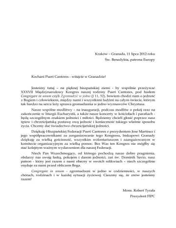 Kraków – Granada, 11 lipca 2012 roku Św. Benedykta, patrona Europy Kochani Pueri Cantores - witajcie w Granadzie! Jesteśmy tutaj – na pięknej hiszpańskiej ziemi - by wspólnie przeżywać XXXVII Międzynarodowy Kongres naszej rodziny Pueri Cantores, pod hasłem Congregare in unum czyli Zgromadzić w jedno (J 11, 52), bowiem chodzi nam o jedność z Bogiem i człowiekiem, między nami i wszystkimi ludźmi na całym świecie, którym tak bardzo na sercu leży sprawa gromadzenia w jedno wyznawców Chrystusa. Nasze wspólne modlitwy – na inauguracji, podczas modlitw o pokój oraz na zakończenie w liturgii Eucharystii, a także nasze koncerty w kościołach i parafiach będą szczególnym znakiem jedności i miłości. Będziemy chcieli głosić poprzez nasz śpiew i chrześcijańską postawę ową jedność i konieczność takiego właśnie sposobu życia. Chcemy dać świadectwo chrześcijańskiej jedności. Dziękuję Hiszpańskiej Federacji Pueri Cantores z prezydentem Jose Martinez i jego współpracownikami za zorganizowanie tego Kongresu, biskupowi Granady dziękuję za wielką gościnność, wszystkim wolontariuszom i zaangażowanym w komitecie organizacyjnym za wielką pomoc. Bez Was ten Kongres nie mógłby się stać kolejnym ważnym wydarzeniem dla naszej Federacji. Niech Pan Wszechmogący, od którego pochodzą nasze dobre pragnienia, obdarzy nas swoją łaską, pokojem i darem jedności, zaś św. Dominik Savio, nasz patron - który jest razem z nami obecny w swoich relikwiach – niech szczególnie oręduje za nami przed obliczem Boga. Congregare in unum - zgromadzeni w jedno w codzienności, w naszych chórach, rodzinach i w każdej sytuacji życiowej. Cieszmy się, że znów jesteśmy razem! Mons. Robert Tyrała Prezydent FIPC