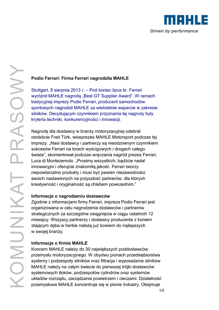 KOMUNIKAT PRASOWY Podio Ferrari: Firma Ferrari nagrodziła MAHLE Stuttgart, 8 sierpnia 2013 r. – Pod koniec lipca br. Ferrari wyróżnił MAHLE nagrodą „Best GT Supplier Award”. W ramach tradycyjnej imprezy Podio Ferrari, producent samochodów sportowych nagrodził MAHLE za wieloletnie wsparcie w zakresie silników. Decydującym czynnikiem przyznania tej nagrody były kryteria techniki, konkurencyjności i innowacji. Nagrodę dla dostawcy w branży motoryzacyjnej odebrał osobiście Fred Türk, wiceprezes MAHLE Motorsport podczas tej imprezy. „Nasi dostawcy i partnerzy są nieodzownym czynnikiem sukcesów Ferrari na torach wyścigowych i drogach całego świata”, skomentował podczas wręczania nagród prezes Ferrari, Luca di Montezemolo. „Prosimy wszystkich, bądźcie nadal innowacyjni i oferujcie znakomitą jakość. Ferrari tworzy niepowtarzalne produkty i musi być pewien niezawodności swoich nastawionych na przyszłość partnerów, dla których kreatywność i oryginalność są chlebem powszednim.” Informacje o nagrodzeniu dostawców Zgodnie z informacjami firmy Ferrari, impreza Podio Ferrari jest organizowana w celu nagrodzenia dostawców i partnerów strategicznych za szczególne osiągnięcia w ciągu ostatnich 12 miesięcy. Wszyscy partnerzy i dostawcy producenta z koniem stającym dęba w herbie należą już bowiem do najlepszych w swojej branży. Informacje o firmie MAHLE Koncern MAHLE należy do 30 największych poddostawców przemysłu motoryzacyjnego. W obydwu pionach przedsiębiorstwa systemy i podzespoły silników oraz filtracja i wyposażenie silników MAHLE należy na całym świecie do pierwszej trójki dostawców systemowych tłoków, podzespołów cylindrów oraz systemów układów rozrządu, zarządzania powietrzem i cieczami. Działalność przemysłowa MAHLE koncentruje się w pionie Industry. Obejmuje 1/2 on zakresy dużych silników, filtrów przemysłowych oraz układów chłodzenia i klimatyzacji. Pion Aftermarket obsługuje wolny handel częściami zamiennymi, dostarczając mu produkty MAHLE w jakości OEM. W roku 2012 MAHLE osiągnął obroty na poziomie prawie 6,2 mln. euro, zatrudniając ok. 48 000 pracowników w ponad 100 zakładach produkcyjnych i 7 centrach badawczorozwojowych. Kontakt dla dziennikarzy: MAHLE International GmbH Pamela Berner Corporate Communications/Public Relations Pragstraße 26 – 46 70376 Stuttgart Niemcy telefon: +49 711 501–13185 faks: +49 711 501–4413185 e–mail: [email protected] 2/2