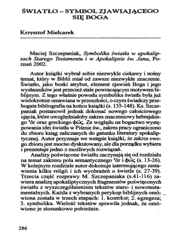 ŚWIATŁO-SYMBOLZJAWIAJ~CEGO SIĘBOGA Krzysztof Mielcarek Maciej Szczepaniak, Symbolika światła w apokalipsach Starego Testamentu i w Apokalipsie św. Jana, Poznań 2002. Autor książki wybrał sobie niezwykle ciekawy i nośny temat, który w Biblii miał od zawsze niezwykłe znaczenie. Światło, jako boski atrybut, element zjawień Boga i jego wysłanników jest przecież stale powracającym motywem biblijnym. Z tego właśnie powodu symbolika światła była już wielokrotnie omawiana w przeszłości, o czym świadczy przebogata bibliografia na końcu książki (s. 135-148). Ks. Szczepaniale postanowił jednak dokonać nowego całościowego ujęcia, które uwzględniałoby zakres znaczeniowy hebrajskiego 'or oraz greckiego <j>Gx;. Ze względu na bogactwo wystę powania idei światła w Piśmie św., zakres pracy ograniczono do zbioru ksiąg zaliczanych do gatunku literatury apokaliptycznej. Autor przyznaje we wstępie książki, że zakres owego zbioru jest mocno dyskutowany, ale dla porządku wybiera i prezentuje jedno z możliwych rozwiązań. Analizy poświęcone światłu zaczynają się od rozdziału na temat zakresu pola semantycmego 'or i <ł>Gx; (s. 13-26). W kolejnym rozdziale autor dokonuje interesującego zestawienia kilku religii i ich wyobrażeń o świetle (s. 27-39). Trzecia część rozprawy M. Szczepaniaka (s.41-116) zawiera analizę apokaliptycmych fragmentów poświęconych światłu z wyszczególnieniem tekstów staro- i nowotestamentalnych. Każda z wybranych perykop biblijnych omó: _ wiona została w trzech etapach: l. kontekst; 2. egzegeza; 3. symbolika. Wielość tekstów sprawiła jednak, że omówiono je stosunkowo pobieżnie. 286 Piąty rozdział książki (117-128) ma odmienny charakter i został poświęcony nowym elementom symboliki światła w Apokalipsie św. Jana Swoim układem przypomina nieco rozszerzoną formę refleksji ostatniego kroku poptZednich rozdziałów, czyli omówienia symboliki światła. Autor stara się rozważyć symbolikę światła w Ap w odniesieniu do wcześniejszego dziedzictwa biblijnego na ten temat oraz w powią zaniu z funkcją symboliki światła w religiach takich jak hinduizm, mazdaizm, a także religie Egiptu i Grecji. Ostatnim przyczynkiem autora jest niewielki ekskurs (129-131 ), będący próbą zastosowania metody historii oddziaływania (Wirkungsgeschichte) symboliki światła na przykładzie architektury bazyliki Vezelay. Z pewnością wiele treści, które zawarte zostały w książ ce M. Szczepaniaka, godna jest zauważenia. Autor nie uniknął jednak pewnych niedociągnięć wpływających na obniżeńie wartości opracowania. Obowiązkiem recenzenta jest zwrócić na nie uwagę. Mimo że praca ma charakter naukowy, autor nie pokusił się o własne tłumaczenie poszczególnych perykop, lecz skorzystał z powszechnie dostępnej wersji tekstowej Biblii Tysiąclecia. Ciekawe skądinąd zestawienia poglądów na temat światła w innych religiach domagają się pytania o kryterium doboru "specyficznych religii", jak nazywa je autor. Innymi słowy należy zapytać, dlaczego właśnie te religie i zawarte w nich przekonania na temat światła miałyby stanowić najlepszy materiał porównawczy? Wartość prowadzonych analiz obniża również fakt, że tylko niektóre terminy oznaczające światło w danej religii zostały przytoczone w brzmieniu oryginalnym. Nie wiadomo zatem, czy między tekstami Starego i Nowego Testamentu a wspomńianymi wierzeniami istniejąjakieś związki etymologiczne lub leksykalne, czy też jedynie treściowe. Wreszcie, poważnym mankamentem jest niezwykle oszczędne zakończenie pracy (s. 133n). Czytełnik chcący pobieżnie przejrzeć książkę, by dowiedzieć się czegoś o jej treści daremnie szukałby szerszego podsumowania w zakończeniu. Zmuszony jest sięgnąć do poszczególnych roz- 287 działów, lub wręcz uważnie studiować poszczególne paragrafy, by przekonać się, co było przedmiotem badań autora i jakie są jego naukowe osiągnięcia. Wydana w Poznaniu (UAM) pracanaukowa ks. M. Szcze.. paniaka może stanowić pomoc w zapoznawaniu się z tematem światła w Biblii. Zainteresują sięnią z pewnością znawcy apokaliptyki i studenci biblistyki, ale ze względu na znaczenie symboliki światła mogą po nią sięgnąć także np.liturgiści czy religioznawcy. 288