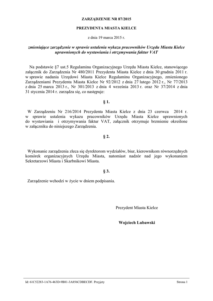 ZARZĄDZENIE NR 87/2015 PREZYDENTA MIASTA KIELCE z dnia 19 marca 2015 r. zmieniające zarządzenie w sprawie ustalenia wykazu pracowników Urzędu Miasta Kielce uprawnionych do wystawiania i otrzymywania faktur VAT Na podstawie §7 ust.5 Regulaminu Organizacyjnego Urzędu Miasta Kielce, stanowiącego załącznik do Zarządzenia Nr 480/2011 Prezydenta Miasta Kielce z dnia 30 grudnia 2011 r. w sprawie nadania Urzędowi Miasta Kielce Regulaminu Organizacyjnego, zmienionego Zarządzeniami Prezydenta Miasta Kielce Nr 92/2012 z dnia 27 lutego 2012 r., Nr 77/2013 z dnia 25 marca 2013 r., Nr 301/2013 z dnia 4 września 2013 r. oraz Nr 37/2014 z dnia 31 stycznia 2014 r. zarządza się, co następuje: § 1. W Zarządzeniu Nr 216/2014 Prezydenta Miasta Kielce z dnia 23 czerwca 2014 r. w sprawie ustalenia wykazu pracowników Urzędu Miasta Kielce uprawnionych do wystawiania i otrzymywania faktur VAT, załącznik otrzymuje brzmienie określone w załączniku do niniejszego Zarządzenia. § 2. Wykonanie zarządzenia zleca się dyrektorom wydziałów, biur, kierownikom równorzędnych komórek organizacyjnych Urzędu Miasta, natomiast nadzór nad jego wykonaniem Sekretarzowi Miasta i Skarbnikowi Miasta. § 3. Zarządzenie wchodzi w życie w dniem podpisania. Prezydent Miasta Kielce Wojciech Lubawski Id: 61C52283-1A76-463D-9B81-3A856CDBECDF. Przyjety Strona 1 Załącznik do Zarządzenia Nr 81/2015 z dnia 16 marca 2015 r zmieniającego zarządzenie w sprawie ustalenia wykazu pracowników Urzędu Miasta Kielce uprawnionych do wystawiania i otrzymywania faktur VAT Wykaz pracowników Urzędu i otrzymywania faktur VAT: 1. 2. 3. 4. 5. 6. 7. 8. 9. 10. 11. 12. 13. 14. 15. 16. 17. 18. 19. 20. 21. 22. 23. 24. 25. 26. 27. 28. 29. 30. 31. 32. 33. 34. 35. 36. 37. 38. 39. 40. 41. 42. Miasta Kielce uprawnionych do wystawiania Balicka Wioletta Baran Henryka Bąk Marcin Bęben Marianna Bidzińska Katarzyna Boberek Władysław Boroń Aneta Borowiecki Dariusz Bożek-Łyś Ewa Bruzda Witold Bukała Jerzy Ciołak Iwona Ciulęba Anna Chojnacka Adela Cybula Ewa Czaplarska Mariola Czarnecka Aneta Daranowski Michał Dąbrowska-Nogaj Grażyna Dębińska Bogumiła Dobrowolska Dorota Durlik Edyta Dusza-Ciechanowska Anna Filosek Sławomir Franki Iwona Gała Małgorzata Garbarczyk Renata Gierczak Bartłomiej Gładki Monika Głowacka Katarzyna Grabowska Urszula Grudziecki Andrzej Grzegorczyk Edyta Guzik Jolanta Hajdorowicz Artur Illg – Hadała Danuta Iwanowska Edyta Janicka Alina Janicka Bożena Janus Edward Jończyk Iwona Juszczyk Dorota Id: 61C52283-1A76-463D-9B81-3A856CDBECDF. Przyjety Strona 2 43. 44. 45. 46. 47. 48. 49. 50. 51. 52. 53. 54. 55. 56. 57. 58. 59. 60. 61. 62. 63. 64. 65. 66. 67. 68. 69. 70. 71. 72. 73. 74. 75. 76. 77. 78. 79. 80. 81. 82. 83. 84. 85. 86. 87. 88. 89. 90. 91. 92. 93. Juszczyk Małgorzata Kaleta Magdalena Kalita Agata Kałuża Lidia Kamińska Beata Kamińska Jolanta Kapusta-Habrowska Elżbieta Karpińska Barbara Kędra Andrzej Kiniorska Teresa Klimczak Renata Kołodziejczyk Wojciech Korczyńska Elżbieta Korus Magdalena Kosek Anna Kosowska Magdalena Kozłowska-Surowiec Katarzyna Krężel Tamara Kubiec Bożena Kundera Anna Kułagowska - Obzejta Zofia Kupińska-Pakuła Katarzyna Kuta Piotr Kuźmuk Krystyna Kwiatkowska Karolina Lagierska Anita Lasocka Dorota Lesiak Monika Libudzic Maciej Lisiecka-Markiewicz Patrycja Łęk–Nocula Ewa Łysek Monika Małecki Piotr Maksalon Anna Marud Izabela Milcarz Magdalena Mołas Piotr Muciek Ryszard Najgeburska Grażyna Nowak-Opuchlik Agnieszka Nowek Dorota Obara Barbara Ociepa Elżbieta Orłoś Monika Oziębły Bernard Pamuła Iwona Papuda Krzysztof Pastuszko Mieczysław Pocztowska Justyna Polak Dorota Pietrzyk Filip Id: 61C52283-1A76-463D-9B81-3A856CDBECDF. Przyjety Strona 3 94. 95. 96. 97. 98. 99. 100. 101. 102. 103. 104. 105. 106. 107. 108. 109. 110. 111. 112. 113. 114. 115. 116. 117. 118. 119. 120. 121. 122. 123. 124. 125. 126. 127. 128. 129. 130. 131. 132. 133. 134. 135. 136. 137. 138. 139. 140. 141. 142. 143. 144. Pietrzyk Jan Piotrowska Beata Przybylski Krzysztof Radlak Alicja Rakowska Jadwiga Ratuska Joanna Relidzyńska Katarzyna Remi-Krawczyk Anna Rębosz Beata Rolka Małgorzata Rogaliński Adam Różycki Michał Rzepińska Jadwiga Sabat Iwona Salwa Dariusz Samczyńska Edyta Semaniak Piotr Skrobacka Jadwiga Skrobot Aneta Sobczyk Anna Staroń Karol Staszewska Małgorzata Stelmaszczyk Iwona Stemplowska Izabela Stępień Grażyna Struzik Teresa Syposz Mirosława Szałas Barbara Szcześniak Helena Szczęsna Alicja Szpilska Renata Szproch Ireneusz Szymonek Agnieszka Szwarc-Zyzik Magdalena Śmiech Jarosław Telka Katarzyna Tworogowski Krzysztof Wesołowska Katarzyna Węglińska Elżbieta Wijas Agata Włoch Andrzej Wojtaszek Iwona Wójcicka Jagoda Zaborowska Justyna Zadara Anna Zalewska-Jarosz Olga Zawadzka Barbara Zboch Tomasz Ziętal Grażyna Zwierzchowska Małgorzata Zygmunt-Masternak Iwona Id: 61C52283-1A76-463D-9B81-3A856CDBECDF. Przyjety Strona 4