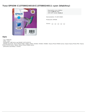 Tusz EPSON C13T08024010/C13T08024011 cyan (błękitny) Poprzednia cena: 0,00 zł Cena: 0,00 zł netto 23% VAT, brutto: 0,00 zł Kod produktu: TU.367.038/3 Producent: EPSON Ocena: Opis - Typ: T080240 - Kolor: cyan - Wydajność: 890 stron wg ISO/IEC 24711/24712 - Modele drukarek: Stylus Photo R265 / R285 / R360 / RX560 / RX585 / RX685 / Stylus Photo PX650 series / Epson Stylus Photo P50 / Stylus Photo PX700 series / Epson Stylus Photo PX800 series - Jednostka sprzedaży 1 sztuka Powered by TCPDF (www.tcpdf.org)