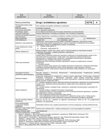 Rok akademicki: Nazwa przedmiotu Tłumaczenie nazwy na jęz. angielski Kierunek studiów Koordynator przedmiotu Prowadzący zajęcia Jednostka realizująca Wydział, dla którego przedmiot jest realizowany Status przedmiotu Cykl dydaktyczny Założenia i cele przedmiotu Formy dydaktyczne, liczba godzin Metody dydaktyczne Pełny opis przedmiotu Wymagania formalne (przedmioty wprowadzające) Założenia wstępne Efekty kształcenia Sposób weryfikacji efektów kształcenia Grupa przedmiotów: Numer katalogowy: Drogi i architektura ogrodowa ECTS 4 Park roadways and garden architecture construction architektura krajobrazu dr inż. Agnieszka Gawłowska dr inż. Marzena Suchocka oraz inne osoby zatrudnione na umowę zlecenie Wydział Ogrodnictwa i Architektury Krajobrazu, Kat. Architektury Krajobrazu Wydział Ogrodnictwa i Architektury Krajobrazu, Katedra Architektury Krajobrazu a) przedmiot kierunkowy b) stopień pierwszy, rok II c) niestacjonarne semestr letni Jęz. wykładowy: polski i Organizacja i harmonogram budowy obiektu architektury krajobrazu. Opanowanie wiedzy dotyczącej zasad budowy dróg parkowych i wyboru nawierzchni. Podstawowe formy budowli ogrodowych, zasady ich projektowania, budowy i konserwacji. a) Wykład; liczba godzin 15 b) Ćwiczenia, liczba godzin 30 Metody podające: wykład, opis, pokaz, praca z zalecaną literaturą, indywidualne projekty studenckie, konsultacje – projekty budowlane i wykonawcze • Tematyka wykładów: Zasady wyboru właściwej nawierzchni parkowej w zależności od przewidywanego rodzaju ruchu, warunków terenowo-gruntowych, rzeźby terenu oraz założonych walorów plastycznych. Zaznajomienie z rodzajami dróg i nawierzchni, przekrojami konstrukcyjnymi, sposobami odwodnienia oraz zasadami ich budowy i konserwacji. Podstawowe formy konstrukcji (budowli) ogrodowych, zasady ich projektowania, budowy i konserwacji. • Tematyka ćwiczeń: Projekty budowlane dróg i placów oraz projekty wykonawcze nawierzchni i wybranych elementów architektury ogrodowej (zbiorniki wodne, schody ogrodowe, meble ogrodowe, elementy wyposażenia terenu). Wykonywanie wybranych elementów małej architektury na ćwiczeniach terenowych. Rysunek odręczny i techniczny. Budownictwo i materiałoznawstwo. Projektowanie obiektów architektury krajobrazu. Znajomość podstawowych umiejętności z zakresu rysunku odręcznego i technicznego, znajomość materiałów budowlanych i elementarna znajomość statyki budowli (konstrukcji) budowli ogrodowych, umiejętność posługiwania się rzutem cechowanym, znajomość budowy geologicznej i genezy gruntów. Znajomość CAD-u. 01 – posiada umiejętność wyboru właściwej nawierzchni parkowej w zależności od przewidywanego rodzaju ruchu, warunków terenowo-gruntowych, rzeźby terenu oraz założonych walorów plastycznych 02 – posiada wiedzę o rodzajach dróg i nawierzchni, przekrojach konstrukcyjnych, sposobach ich odwodnienia 03 – posiada wiedzę o zasadach ich budowy i konserwacji 04 – dysponuje wiedzą na temat podstawowych form konstrukcji (budowli) ogrodowych, zasadach ich projektowania, budowy i konserwacji 05 - umie przygotować projekt budowlany dróg i placów 06 – umie zaprojektować konstrukcję nawierzchni w zależności od typu ruchu i rodzaju gruntu 07 – umie przygotować projekt wykonawczy wybranych elementów architektury ogrodowej Efekt 01, 02, 03 i 04 – kolokwia na zajęciach ćwiczeniowych. Efekt 05, 06 i 07 przygotowanie projektów i ich prezentacja Forma dokumentacji osiągniętych efektów Zestawienie imienne ocen, projekty prezentowane w formie analogowej i cyfrowej (elektronicznej) kształcenia Elementy i wagi mające wpływ Średnia ocen: kolokwia 30% + średnia arytmetyczna z ocen poszczególnych projektów na ocenę końcową Miejsce realizacji zajęć sala dydaktyczna Literatura podstawowa i uzupełniająca: 1. Bolek S., Majdecki L.: Album nawierzchni wewnątrz osiedlowych i ogrodowych. BPBK Stolica, Warszawa 1973 2. Edel R.: Odwodnienie dróg. WKŁ, Warszawa 2000 3. Grzybowska W., Smukalski K.: Nawierzchnie drogowe ulepszone. Wyd. Politechniki Krakowskiej, Kraków 1983 4. Helberg T.: Ogrody wodne. Oficyna Wydawnicza Delta, Warszawa 1995 5. Kalabińska M., Piłat J.: Technologia materiałów i nawierzchni drogowych. PWN, Warszawa 1985 6. Neufert E.: Podręcznik projektowania architektoniczno-budowlanego. Arkady, Warszawa 1995 7. Stelmaszyk F.J.: Roboty ziemne i drogi gruntowe. PWRiL, Warszawa 1969 8. Wiłun Z.: Zarys geotechniki. WKŁ, Warszawa 1987 UWAGI: Wskaźniki ilościowe charakteryzujące moduł/przedmiot Szacunkowa sumaryczna liczba godzin pracy studenta (kontaktowych i pracy własnej) niezbędna dla osiągnięcia zakładanych efektów kształcenia - na tej podstawie należy wypełnić pole ECTS2: Łączna liczba punktów ECTS, którą student uzyskuje na zajęciach wymagających bezpośredniego udziału nauczycieli akademickich: Łączna liczba punktów ECTS, którą student uzyskuje w ramach zajęć o charakterze praktycznym, takich jak zajęcia laboratoryjne, projektowe, itp.: 75 h 2 ECTS 2 ECTS Tabela zgodności kierunkowych efektów kształcenia efektami przedmiotu Nr /symbol efektu 01 02 03 04 05 Wymienione w wierszu efekty kształcenia: Odniesienie do efektów dla programu kształcenia na kierunku posiada umiejętność wyboru właściwej nawierzchni parkowej w zależności od przewidywanego rodzaju ruchu, warunków terenowo-gruntowych, rzeźby terenu oraz założonych walorów plastycznych posiada wiedzę o rodzajach dróg i nawierzchni, przekrojach konstrukcyjnych, sposobach ich odwodnienia posiada wiedzę o zasadach ich budowy i konserwacji AK_W02, AK_W09, AK_W10 dysponuje wiedzą na temat podstawowych form konstrukcji (budowli) ogrodowych, zasadach ich projektowania, budowy i konserwacji umie przygotować projekt budowlany dróg i placów AK_W09, AK_W13 AK_W09 AK_W09, AK_W13 AK_U01, AK_U02, AK_03, AK_U07, AK_U09 06 07 umie zaprojektować konstrukcję nawierzchni w za