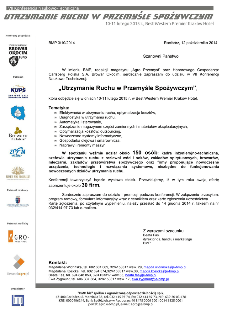 BMP 3/10/2014 Racibórz, 12 października 2014 Szanowni Państwo W imieniu BMP, redakcji magazynu „Agro Przemysł” oraz Honorowego Gospodarza: Carlsberg Polska S.A. Browar Okocim, serdecznie zapraszam do udziału w VII Konferencji Naukowo-Technicznej: „Utrzymanie Ruchu w Przemyśle Spożywczym”, która odbędzie się w dniach 10-11 lutego 2015 r. w Best Western Premier Kraków Hotel. Tematyka: • • • • • • • • Efektywność w utrzymaniu ruchu, optymalizacja kosztów, Diagnostyka w utrzymaniu ruchu, Automatyka i sterowanie, Zarządzanie magazynem części zamiennych i materiałów eksploatacyjnych, Optymalizacja kosztów: outsourcing, Nowoczesne systemy informatyczne, Gospodarka olejowa i smarownicza, Naprawy i remonty maszyn. W spotkaniu weźmie udział około 150 osób: kadra inżynieryjno-techniczna, szefowie utrzymania ruchu z rozlewni wód i soków, zakładów spirytusowych, browarów, mleczarni, zakładów przetwórstwa spożywczego oraz firmy proponujące nowoczesne urządzenia, technologie i rozwiązania systemowe, niezbędne do funkcjonowania nowoczesnych działów utrzymania ruchu. Konferencji towarzyszyć będzie wystawa stoisk. Przewidujemy, iż w tym roku swoją ofertę zaprezentuje około 30 firm. Serdecznie zapraszam do udziału i promocji podczas konferencji. W załączeniu przesyłam: program ramowy, formularz informacyjny wraz z cennikiem oraz kartę zgłoszenia uczestnictwa. Kartę zgłoszenia, po czytelnym wypełnieniu, należy przesłać do 14 grudnia 2014 r. faksem na nr 032/414 97 73 lub e-mailem. Z wyrazami szacunku Beata Fas dyrektor ds. handlu i marketingu BMP’ Kontakt: Magdalena Widrińska, tel. 602 601 089, 32/4153317 wew. 29, [email protected] Magdalena Kozicka, tel. 602 694 574,32/4153317 wew.38, [email protected] Beata Fas, tel. 694 848 853, 32/4153317 wew.33, [email protected] Ewa Zygmunt, tel. 606 337 384, 32/4153317 wew. 17, [email protected] FORMULARZ INFORMACYJNY I. Sponsor – oferta obejmuje: 1. 2. 3. 4. 5. 6. 7. 8. 9. Przyznanie tytułu sponsora konferencji „Utrzymanie Ruchu w Przemyśle Spożywczym”. Prezentację firmy do 30 min (istnieje możliwość podziału referatu na 2 części). Pokrycie kosztów udziału dla 3 osób z firmy (wyżywienie, materiały, zakwaterowanie 1 doba konferencyjna). Wyeksponowanie na zaproszeniach, plakatach, transparentach i pismach oraz w obiektach, w których będzie przebiegać impreza nazwy firmy i logo jako sponsora konferencji. Eksponowanie firmy podczas całej imprezy: wybór miejsca w sali wystawienniczej, prezentacja w atrakcyjnym miejscu programu. Udostępnienie powierzchni wystawienniczej do 6 m2 (zabudowa własna firmy). Reklamę A4 w magazynie „Agro Przemysł” 1/2015. Zamieszczenie informacji o firmie w materiałach konferencyjnych (1 strona B5, wersja czarno-biała). Baner na stronie www.kierunekagro.pl na okres 1 miesiąca. Koszt promocji: 18 000 zł II. Partner – oferta obejmuje: 1. 2. 3. 4. 5. 6. 7. 8. 9. Przyznanie tytułu partnera konferencji „Utrzymanie Ruchu w Przemyśle Spożywczym”. Prezentację firmy do 20 min. Pokrycie kosztów udziału dla 2 osób z firmy (wyżywienie, materiały, zakwaterowanie 1 doba). Wyeksponowanie na zaproszeniach, plakatach, transparentach i pismach oraz w obiektach, w których będzie przebiegać impreza nazwy firmy i logo jako partnera. Eksponowanie firmy podczas całej imprezy: wybór miejsca w hali wystawienniczej, prezentacja w atrakcyjnym miejscu programu Udostępnienie powierzchni wystawienniczej do 4 m2 (zabudowa własna firmy). Reklamę A4 w magazynie „Agro Przemysł” 1/2015. Zamieszczenie informacji o firmie w materiałach konferencyjnych (1 strona B5, wersja czarno-biała). Baner na stronie www.kierunekagro.pl na okres 1 miesiąca. Koszt promocji: 14 000 zł III. Inne formy promocji: a) PAKIET I (stoisko + prezentacja + reklama): 1. Powierzchnia wystawiennicza 2 m2 (zabudowa własna). 2. Prezentacja firmy do 15 min. 3. Reklama A4 w magazynie „Agro Przemysł” 1/2015. 4. Zamieszczenie informacji o firmie w materiałach konferencyjnych (1 strona B5, wersja czarno-biała). Koszt: 6 900 zł b) PAKIET II (prezentacja + reklama): 1. Prezentacja firmy do 15 min. 2. Zamieszczenie informacji o firmie w materiałach konferencyjnych (1 strona B5, wersja czarno-biała). 3. Reklama A4 w magazynie „Agro Przemysł” 1/2015. Koszt: 4 800 zł c) PAKIET III (prezentacja): 1. Prezentacja firmy do 15 min. 2. Zamieszczenie informacji o firmie w materiałach konferencyjnych (1 strona B5, wersja czarno-biała). Koszt: 2 900 zł d) PAKIET IV (stoisko + reklama): 1. Powierzchnia wystawiennicza 2 m2 (zabudowa własna). 2. Reklama A4 w magazynie „Agro Przemysł” 1/2015. 3. Zamieszczenie informacji o firmie w materiałach konferencyjnych (1 strona B5, wersja czarno-biała). Koszt: 4 300 zł e) PAKIET V (stoisko): 1. Powierzchnia wystawiennicza 2 m2 (zabudowa własna). 2. Zamieszczenie informacji o firmie w materiałach konferencyjnych (1 strona B5, wersja czarno-biała). Koszt: 2 600 zł f) PAKIET VI (baner): 1. Powierzchnia na wystawienie banera reklamowego w części wystawienniczej (organizator zapewnia jedynie powierzchnię wystawienniczą – szerokość do 1,5 m). 2. Zamieszczenie informacji o firmie w materiałach konferencyjnych (1 strona B5, wersja czarno-biała). Koszt: 1 500 zł IV. Promocja w materiałach konferencyjnych: a) wpis w materiałach konferencyjnych (cz/b, 1xB5): 200 zł b) dystrybucja materiałów reklamowych (maksymalnie 1 sztuka) firmy poprzez umieszczenie ich w materiałach konferencyjnych (max. 1A4): 800 zł V. Koszty uczestnictwa: - dla 1 osoby przy wykupieniu ww. pakietów (wyżywienie, materiały konferencyjne, udział w imprezach towarzyszących): 890 zł - dla 1 osoby bez pakietu (wyżywienie, materiały konferencyjne, udział w imprezach towarzyszących): 1 300 zł VI. Zakwaterowanie (wg kolejności zgłoszeń, doba hotelowa zgodnie z regulaminem hotelu, parking we własnym zakresie) Best Western Premie