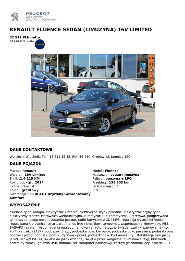 RENAULT FLUENCE SEDAN (LIMUZYNA) 16V LIMITED 32 512 PLN netto 39 990 PLN brutto DANE KONTAKTOWE Wojciech, Wiechnik, Tel.: 15 811 32 42, RiA, 39-410, Grębów, ul. Jamnica 160 DANE POJAZDU Marka : Renault Wersja : 16V Limited Silnik :1.6 115 KM Rok produkcji : 2014 Liczba drzwi : 4 Kolor : grafitowy Gwarancja : PEUGEOT Używany Gwarantowany Komfort Model : Fluence Nadwozie : sedan (limuzyna) Paliwo : benzyna + LPG Przebieg : 138 603 km Liczba miejsc : 5 VIN : WYPOSAŻENIE dzielona tylna kanapa, elektryczne lusterka, elektryczne szyby przednie, elektryczne szyby tylne, elektryczny starter, kierownica wielofunkcyjna, klimatyzacja: automatyczna 2-strefowa, podgrzewana tylna szyba, podgrzewane lusterka boczne, radio fabryczne z CD i MP3, regulacja wysokości fotela, regulowana kierownica, smartcard / hands free / smartkey, tempomat, wspomaganie kierownicy, ABS, BAS/AFU - system wspomagania nagłego hamowania, automatyczne światła, czujniki parkowania - tył, kontrola trakcji (ASR), poduszek: 6 szt., poduszka pow. kierowcy, poduszka pow. pasażera, poduszki pow. boczne - przód, poduszki pow. kurtynowe - przód, poduszki pow. kurtynowe - tył, stabilizacja toru jazdy (ESP), uchwyt ISOFIX, światła do jazdy dziennej, światła przeciwmgielne, aluminiowe felgi, bluetooth, centralny zamek, gniazdo USB, immobiliser, komputer pokładowy, zestaw głośnomówiący, światła LED WYPOSAŻENIE DODATKOWE bezwypadkowy, gwarancja, książka serwisowa, możliwa zamiana, serwisowany w ASO, stan bardzo dobry OPIS POJAZDU RiA Autoryzowany Dealer Peugeot Stalowa Wola - Warszawa - Grudziądz Eksponowany pojazd w Stalowa Wola/Jamnica pon-pt 9-18 sb 9-14 tel.: 15 811 32 42 RENAULT FLUENCE LIMITED 1,6 16V BENZYNA + GAZ INSTALACJA GAZOWA SEKWENCYJNA BUTLA W MIEJSCU KOŁA ZAPASOWEGO Salon Polska 1 właściciel Możliwość oględzin pojazdu w dowolnym naszym oddziale po uprzednim ustaleniu. Pełna gwarancja na pojazd 12 miesięcy Peugeot Używany Gwarantowany do wykorzystania w całej sieci Peugeot/Citroen Dlaczego warto nam zaufać? Jesteśmy Autoryzowanym Dealerem PEUGEOT, liderem sprzedaży aut w programie PEUGEOT UŻYWANY GWARANTOWANY Drobiazgowo sprawdziliśmy stan techniczny i prawny samochodu Każde auto ma gwarantowany przebieg Zawsze wystawiamy faktury na pełną wartość pojazdu Możliwość wykonania jazdy próbnej przez zakupem oraz wgłądu w dokumentację pojazdu Każdy samochód posiada ważną polisę OC oraz aktualne badania techniczne Auta zostały przygotowane do rejestracji Jeśli pojazd nie posiada gwarancji fabrycznej - udzielamy nawet 36 miesięcznej GWARANCJI Oferujemy pełną paletę dodatkowych produktów: LE.ASING w ofercie większość firm lea.singowych od 1 procent wpłaty wstępnej bez zbędnych formalności do 84 miesięcy formalności w max. 24 godziny, włącznie z rejestracją na miejscu również nowe działalności finansowanie także bez BIK i KRD w promocyjnej cenie DAS - opieka prawna KRE.DYT zawsze najciekawsze oferty finansowania do 100 procent wartości pojazdu do 8 lat formalności nawet w 15 minut również nowe działalności i zatrudnieni za granicą finansowanie również bez BIK i KRD UBEZP.IECZENIA specjalne pakiety dealerskie promocyjne pakiety od 2,99 procent konkurencyjne ceny, pełny pakiet od 999,dodatkowe zniżki dla stałych klientów Samochód sprzedawany w programie PEUGEOT Używany Gwarantowany KOMFORT: Gwarancja Umowna 6 Miesięcy Certyfikat Jakości Pojazdu Dekra Opieka Peugeot Assitance Specjalna Oferta Ubezpieczeniowa Specjalna Oferta Finansowania Zakupu Dowiedz się więcej na : http://www.UzywanyGwarantowany.pl QR CODE DLA OGŁOSZENIA W SERWISIE UZYWANYGWARANTOWANY.PL Powered by TCPDF (www.tcpdf.org)