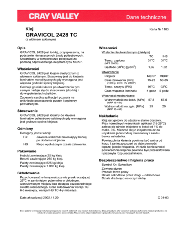 Klej Karta Nr 1103 GRAVICOL 2428 TC (z włóknem szklanym) Opis GRAVICOL 2428 jest to klej, przyspieszony, na podstawie nienasyconych żywic poliestrowych. Utwardzany w temperaturze pokojowej za pomocą odpowiedniego inicjatora typu MEKP. Właściwości GRAVICOL 2428 jest klejem elastycznym z włóknem szklanym. Stosowany jest do klejenia laminatów monolitycznych gdy wymagana jest większa grubość spoiny klejowej. Cechuje go niski skurcz po utwardzeniu tym samym nadaje się do stosowania jako klej i do wypełnianiach ubytków. Zapewnia szybką aplikację i pozwala na uniknięcie powstawania pustek i pęcherzy powietrznych. Stosowanie GRAVICOL 2428 jest idealny do klejenia laminatów poliestrowo-szklanych gdy wymagana jest grubsza spoina klejowa. Odmiany Dostępny jest w wersji: TC: Zawiera wskaźnik zmieniający barwę po dodaniu inicjatora IHB Klej o wydłużonym czasie żelowania. Pakowanie Hoboki zawierające 25 kg kleju Beczki zawierające 250 kg kleju Palety zawierające 825 kg kleju Palety zawierające 1.000 kg kleju Składowanie Przechowywać w temperaturze nie przekraczającej 25oC w zamkniętym pojemniku w chłodnym, wentylowanym miejscu bez dostępu bezpośredniego światła słonecznego. Czas składowania wersja TC 6-ć miesięcy, wersja IHB TC 4-y miesiące. Data aktualizacji 2002.11.20 Własności W stanie nieutwardzonym (ciekłym) TC Temp. zapłonu 31oC IHB 31oC (NFT 30050) Gęstość (20oC) [g/cm3] Utwardzanie Inicjator Czas żelowania [min] o 1,32 1,32 MEKP 15-23 MEKP 50-65 98oC 4 godz 92oC 5 godz 57,5 57,5 29 29 (1000 g; 23 C; 1% MEKP) Temp. szczytu (PIK) Czas wiązania laminatu Własności mechaniczne Wytrzymałość na ścisk. [MPa] (NFP 15-451) Wytrzymałość na zgin. [MPa] (NFP 15-451) Nakładanie Klej jest gotowy do użycia w stanie dostawy. Przy normalnych warunkach aplikacji (15-25oC) zaleca się użycie inicjatora w ilości od 1% do maks. 3%. Mieszać klej z inicjatorem aż do uzyskania jednorodnej mieszaniny i zaniku barwy wskaźnika. Powierzchnia klejenia powinna być wolna od kurzu i zanieczyszczeń co daje pewność lepszej jakości wiązania. W razie konieczności powierzchnia klejenia powinna być przeszlifowana i przemyta rozpuszczalnikiem. Bezpieczeństwo i higiena pracy Symbol Xn: Szkodliwy Zawiera styren Produkt łatwo palny Działa szkodliwie przez drogi – oddechowe Działa drażniąco na oczy i skórę C 01-03 Dane podane w niniejszej instrukcji opierają się na naszych badaniach oraz naszym doświadczeniu. Służą one jedynie jako wskazówki podczas użytkowania naszych produktów, nie należy ich uważać za granice stosowalności. Nie ponosimy odpowiedzialności w przypadku naruszenia praw należących do osób trzecich.