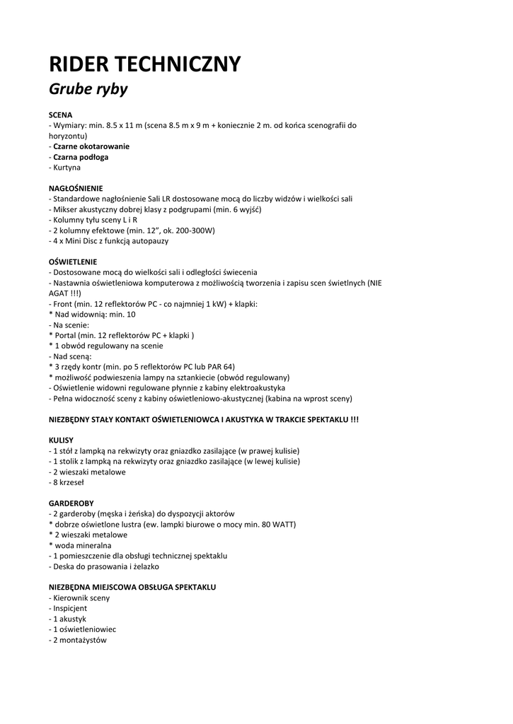 RIDER TECHNICZNY Grube ryby SCENA - Wymiary: min. 8.5 x 11 m (scena 8.5 m x 9 m + koniecznie 2 m. od końca scenografii do horyzontu) - Czarne okotarowanie - Czarna podłoga - Kurtyna NAGŁOŚNIENIE - Standardowe nagłośnienie Sali LR dostosowane mocą do liczby widzów i wielkości sali - Mikser akustyczny dobrej klasy z podgrupami (min. 6 wyjść) - Kolumny tyłu sceny L i R - 2 kolumny efektowe (min. 12”, ok. 200-300W) - 4 x Mini Disc z funkcją autopauzy OŚWIETLENIE - Dostosowane mocą do wielkości sali i odległości świecenia - Nastawnia oświetleniowa komputerowa z możliwością tworzenia i zapisu scen świetlnych (NIE AGAT !!!) - Front (min. 12 reflektorów PC - co najmniej 1 kW) + klapki: * Nad widownią: min. 10 - Na scenie: * Portal (min. 12 reflektorów PC + klapki ) * 1 obwód regulowany na scenie - Nad sceną: * 3 rzędy kontr (min. po 5 reflektorów PC lub PAR 64) * możliwość podwieszenia lampy na sztankiecie (obwód regulowany) - Oświetlenie widowni regulowane płynnie z kabiny elektroakustyka - Pełna widoczność sceny z kabiny oświetleniowo-akustycznej (kabina na wprost sceny) NIEZBĘDNY STAŁY KONTAKT OŚWIETLENIOWCA I AKUSTYKA W TRAKCIE SPEKTAKLU !!! KULISY - 1 stół z lampką na rekwizyty oraz gniazdko zasilające (w prawej kulisie) - 1 stolik z lampką na rekwizyty oraz gniazdko zasilające (w lewej kulisie) - 2 wieszaki metalowe - 8 krzeseł GARDEROBY - 2 garderoby (męska i żeńska) do dyspozycji aktorów * dobrze oświetlone lustra (ew. lampki biurowe o mocy min. 80 WATT) * 2 wieszaki metalowe * woda mineralna - 1 pomieszczenie dla obsługi technicznej spektaklu - Deska do prasowania i żelazko NIEZBĘDNA MIEJSCOWA OBSŁUGA SPEKTAKLU - Kierownik sceny - Inspicjent - 1 akustyk - 1 oświetleniowiec - 2 montażystów Możliwość wwiezienia (jeśli scena jest na piętrze) lub wniesienia największych elementów scenografii: - Ścianka (3,30m x 2 m) ROZSTAWIENIE SCENOGRAFII Osoba kontaktowa w sprawach oświetlenia: Paweł Szymczyk tel. 0602 689 868 Osoba kontaktowa w sprawach nagłośnienia: Rafał Piotrowski tel. 0506 043 542 Pozostałe sprawy techniczne: Małgorzata Domańska tel. 0512 135 107 IMPRESARIAT TEATRU POLONIA I OCH-TEATRU Iwona Gradkowska, kom. 609 062 817 email: [email protected]