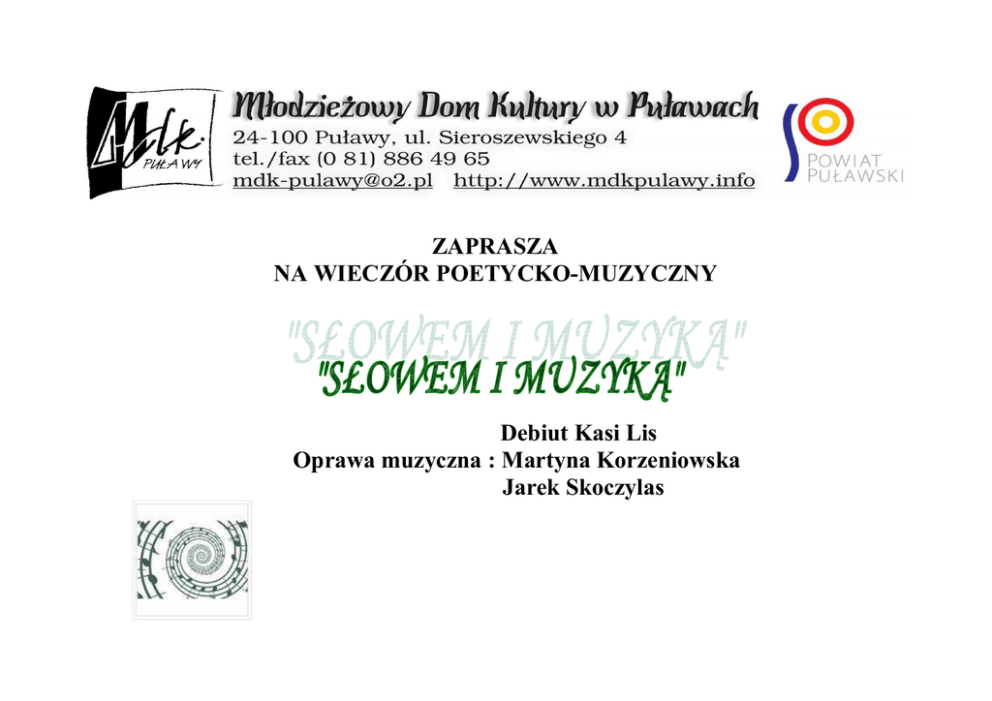 ZAPRASZA NA WIECZÓR POETYCKO-MUZYCZNY Debiut Kasi Lis Oprawa muzyczna : Martyna Korzeniowska Jarek Skoczylas
