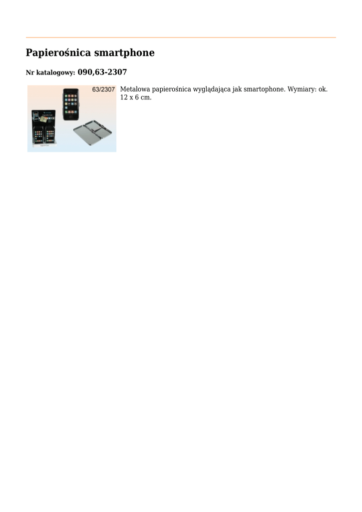Papierośnica smartphone Nr katalogowy: 090,63-2307 Metalowa papierośnica wyglądająca jak smartophone. Wymiary: ok. 12 x 6 cm.