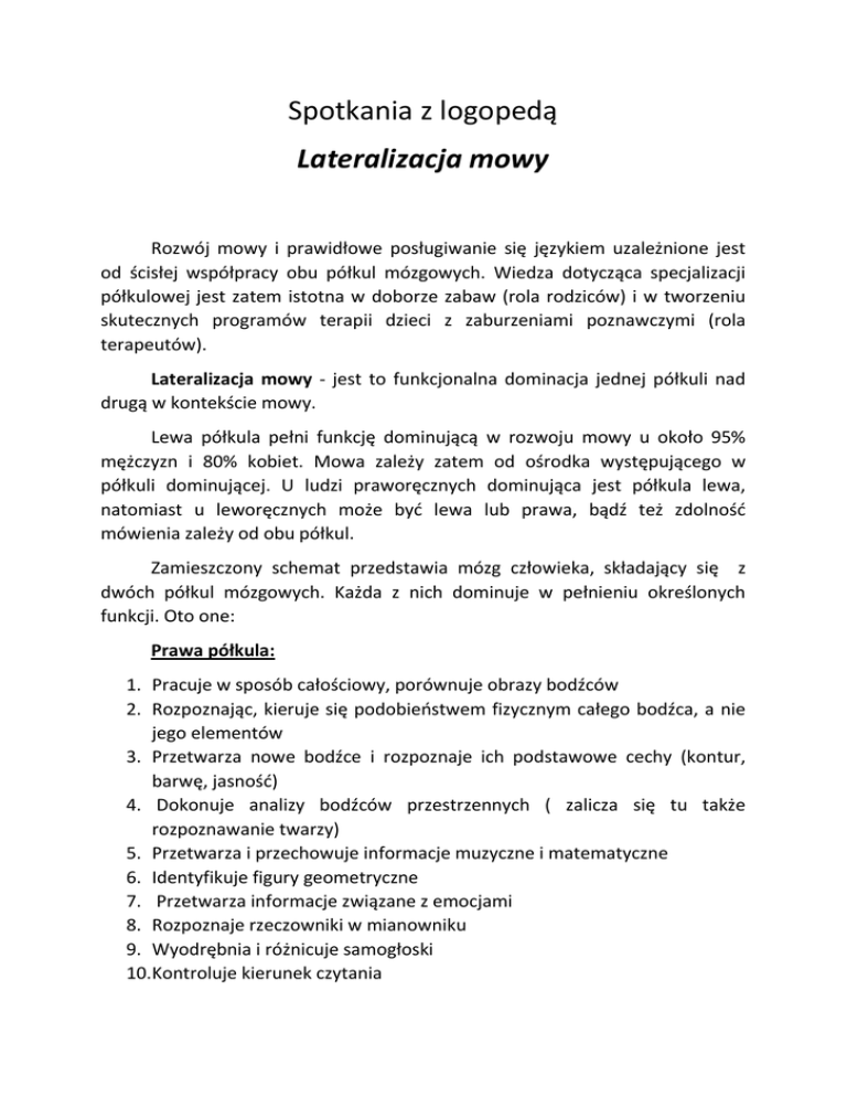 Spotkania z logopedą Lateralizacja mowy Rozwój mowy i prawidłowe posługiwanie się językiem uzależnione jest od ścisłej współpracy obu półkul mózgowych. Wiedza dotycząca specjalizacji półkulowej jest zatem istotna w doborze zabaw (rola rodziców) i w tworzeniu skutecznych programów terapii dzieci z zaburzeniami poznawczymi (rola terapeutów). Lateralizacja mowy - jest to funkcjonalna dominacja jednej półkuli nad drugą w kontekście mowy. Lewa półkula pełni funkcję dominującą w rozwoju mowy u około 95% mężczyzn i 80% kobiet. Mowa zależy zatem od ośrodka występującego w półkuli dominującej. U ludzi praworęcznych dominująca jest półkula lewa, natomiast u leworęcznych może być lewa lub prawa, bądź też zdolność mówienia zależy od obu półkul. Zamieszczony schemat przedstawia mózg człowieka, składający się z dwóch półkul mózgowych. Każda z nich dominuje w pełnieniu określonych funkcji. Oto one: Prawa półkula: 1. Pracuje w sposób całościowy, porównuje obrazy bodźców 2. Rozpoznając, kieruje się podobieństwem fizycznym całego bodźca, a nie jego elementów 3. Przetwarza nowe bodźce i rozpoznaje ich podstawowe cechy (kontur, barwę, jasność) 4. Dokonuje analizy bodźców przestrzennych ( zalicza się tu także rozpoznawanie twarzy) 5. Przetwarza i przechowuje informacje muzyczne i matematyczne 6. Identyfikuje figury geometryczne 7. Przetwarza informacje związane z emocjami 8. Rozpoznaje rzeczowniki w mianowniku 9. Wyodrębnia i różnicuje samogłoski 10.Kontroluje kierunek czytania 11.Kontroluje i pozwala rozumieć intonację, akcent i rytm, czyli prozodię mowy 12.Odpowiedzialna jest za rozumienie wypowiedzi oraz metafor. Lewa półkula: 1. Pracuje w sposób analityczny i relacyjny ( porównuje litery), układa informacje w sposób sekwencyjny 2. Rozpoznając bodźce, kieruje się związkami logicznymi 3. Przetwarza bodźce już znane 4. Odbiera, identyfikuje i różnicuje dźwięki mowy 5. Analizuje materiał związany z cichym czytaniem 6. Identyfikuje rymy 7. Dokonuje złożonych operacji słownych Jak synchronizować obie półkule mózgowe by kompensować niektóre zaburzenia i podnosić wydajność mózgu? Czyli co warunkuje zwiększanie liczby połączeń nerwowych między lewą a prawą półkulą w spoidle wielkim. Oto kilka wskazówek: 1. Dostarczanie dziecku odpowiednich bodźców językowych już na bardzo wczesnym etapie rozwoju (prawidłowa mowa, czytanie, śpiewanie, dźwięki miłe uszkom maluszka) 2. Zabawy na świeżym powietrzu (konstrukcje dla małych i dużych) 3. Wczesna nauka czytania (około 3 roku życia) 4. Rysowanie dowolne, malowanie, rysowanie po śladzie, labirynty 5. Historyjki obrazkowe 6. Układanki, puzzle 7. Zabawa klockami drewnianymi , Plus Plus, Jenga, Lego… 8. Włączenie elementów z pedagogiki Marii Montessori ( szczegóły w następnych artykułach) 9. Ćwiczenia umiejętności obracania figur w przestrzeni 10.Wprowadzenie elementów z Gimnastyki Mózgu P. Dennisona (szczegóły w następnych artykułach) 11. Rysowanie oburącz 12.Posługiwanie się drugą ręką niż zwykle 13.Zabawy plasteliną, modeliną, różnymi masami 14.Żonglowanie Bibliografia: Cieszyńska j.,Korendo M., 2008, Wczesna interwencja terapeutyczna Dryden G., Vos J., 2000, Rewolucja w uczeniu się Moir A., Jessel D.,2000, Płeć mózgu Joanna Bałazy Logopeda ogólny, surdologopeda glottodydaktyk ZSP Mroków