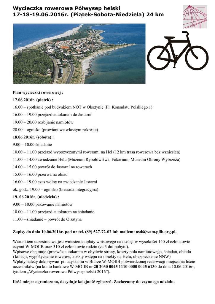 Wycieczka rowerowa Półwysep helski 17-18-19.06.2016r. (Piątek-Sobota-Niedziela) 24 km Plan wycieczki rowerowej : 17.06.2016r. (piątek) : 16.00 – spotkanie pod budynkiem NOT w Olsztynie (Pl. Konsulatu Polskiego 1) 16.00 – 19.00 przejazd autokarem do Jastarni 19.00 – 20.00 rozbijanie namiotów 20.00 – ognisko (prowiant we własnym zakresie) 18.06.2016r. (sobota) : 9.00 – 10.00 śniadanie 10.00 – 11.00 przejazd wypożyczonymi rowerami na Hel (12 km trasa rowerowa bez wzniesień) 11.00 – 14.00 zwiedzanie Helu (Muzeum Rybołówstwa, Fokarium, Muzeum Obrony Wybrzeża) 14.00 – 15.00 powrót do Jastarni na rowerach 15.00 – 16.00 przerwa na obiad 16.00 – 19.00 czas wolny na zwiedzanie Jastarni ok. godz. 19.00 – ognisko (biesiada integracyjna) 19. 06.2016r. (niedziela) : 9.00 – 10.00 pakowanie namiotów 10.00 – 11.00 przejazd autokarem na śniadanie 11.00 – śniadanie – powrót do Olsztyna Zapisy do dnia 10.06.2016r. pod nr tel. (89) 527-72-02 lub mailem: [email protected]. Warunkiem uczestnictwa jest wniesienie opłaty wpisowego na osobę: w wysokości 140 zł członkowie czynni W-MOIIB oraz 310 zł członkowie rodzin (za 3 dni pobytu). Wpisowe obejmuje (przewóz autokarem w obydwie strony, koszty pola namiotowego, śniadań, obiadu i kolacji, wypożyczenie rowerów, koszty wstępu na obiekty na Helu, ubezpieczenie NNW) Wpłaty należy dokonywać po uzyskaniu w Biurze W-MOIIB potwierdzonej rezerwacji miejsca na liście uczestników (na konto bankowe W-MOIIB nr 20 2030 0045 1110 0000 0045 6130 do dnia 10.06.2016r., tytułem „Wycieczka rowerowa Półwysep helski 2016”). Ilość miejsc ograniczona, decyduje kolejność zgłoszeń. Zachęcamy do czynnego udziału.