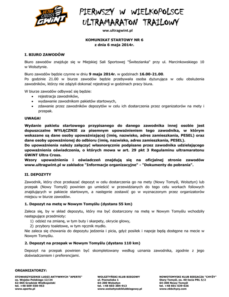 PIERWSZY W WIELKOPOLSCE ULTRAMARATON TRAILOWY ww.ultragwint.pl KOMUNIKAT STARTOWY NR 6 z dnia 6 maja 2014r. I. BIURO ZAWODÓW Biuro zawodów znajduje się w Miejskiej Sali Sportowej "Świtezianka" przy ul. Marcinkowskiego 10 w Wolsztynie. Biuro zawodów będzie czynne w dniu 9 maja 2014r. w godzinach 16.00-21.00. Po godzinie 21.00 w biurze zawodów będzie przebywała osoba dyżurująca w celu obsłużenia zawodników, którzy nie zdążyli dokonać rejestracji w godzinach pracy biura. W biurze zawodów odbywać się będzie: rejestracja zawodników, wydawanie zawodnikom pakietów startowych, zdawanie przez zawodników depozytów w celu ich dostarczenia przez organizatorów na mety i przepak. UWAGA! Wydanie pakietu startowego przypisanego do danego zawodnika innej osobie jest dopuszczalne WYŁĄCZNIE za pisemnym upoważnieniem tego zawodnika, w którym wskazane są dane osoby upoważniającej (imię, nazwisko, adres zamieszkania, PESEL) oraz dane osoby upoważnionej do odbioru (imię, nazwisko, adres zamieszkania, PESEL). Do upoważnienia należy załączyć własnoręcznie podpisane przez zawodnika udzielającego upoważnienia oświadczenia, o których mowa w art. 29 pkt 3 Regulaminu ultramaratonu GWiNT Ultra Cross. Wzory upoważnienia i oświadczeń znajdują się na oficjalnej stronie zawodów www.ultragwint.pl w zakładce "Informacje organizacyjne" - "Dokumenty do pobrania". II. DEPOZYTY Zawodnik, który chce przekazać depozyt w celu dostarczenia go na mety (Nowy Tomyśl, Wolsztyn) lub przepak (Nowy Tomyśl) powinien go umieścić w przewidzianych do tego celu workach foliowych znajdujących w pakiecie startowym, a następnie zostawić go w wyznaczonym przez organizatorów miejscu w biurze zawodów. 1. Depozyt na metę w Nowym Tomyślu (dystans 55 km) Zaleca się, by w skład depozytu, który ma być dostarczony na metę w Nowym Tomyślu wchodziły następujące przedmioty: 1) odzież na zmianę, w tym buty i skarpety, okrycie głowy, 2) przybory toaletowe, w tym ręcznik mydło. Nie zaleca się chowania do depozytu jedzenia i picia, gdyż posiłek i napoje będą dostępne na mecie w Nowym Tomyślu. 2. Depozyt na przepak w Nowym Tomyślu (dystans 110 km) Depozyt na przepak powinien być skompletowany według uznania zawodnika, zgodnie z jego doświadczeniem i preferencjami. ORGANIZATORZY: STOWARZYSZENIE LUDZI AKTYWNYCH "APERTE" os. Wojska Polskiego 12/24 62-065 Grodzisk Wielkopolski tel. +48 609-550-953 www.aperte.pl WOLSZTYŃSKI KLUB BIEGOWY ul. Poznańska 1 64-200 Wolsztyn tel. +48 603-384-913 www.wolsztynskiklubbiegowy.pl NOWOTOMYSKI KLUB BIEGACZA "CHYŻY" Stary Tomyśl, os. 40-lecia PRL 5/2 64-300 Nowy Tomyśl tel. +48 601-539-026 www.nkbchyzy.com PIERWSZY W WIELKOPOLSCE ULTRAMARATON TRAILOWY ww.ultragwint.pl UWAGA! 1) Pozostawienie depozytu jest możliwe tylko w dniu pracy biura zawodów, tj. 9 maja 2014r. W dniu startu depozyty nie będą odbierane. 2) W przypadku odbioru pakietu danego zawodnika przez inną osobę, zawodnik ten wraz z upoważnieniem i oświadczeniami, o których mowa w pkt I, przekazuje odbierającemu swój depozyt. Odbierający powinien umieścić depozyt w przewidzianych do tego celu workach foliowych znajdujących w pakiecie startowym zawodnika, który udzielił upoważnienia do odbioru pakietu startowego. III. PARKINGI Zawodnicy, którzy dojadą na zawody samochodami, mogą je zostawić na parkingach w: 1) Wolsztynie Parking bezpłatny zlokalizowany przy Miejskiej Sali Sportowej "Świtezianka" przy ul. Marcinkowskiego 10. 2) Grodzisku Wielkopolskim Parkingi bezpłatne zlokalizowane przy: ul. Rakoniewickiej - ok. 150 od miejsca startu (zalecany), ul. Bernarda - ok. 100 od miejsca startu, ul. Wypoczynkowej - ok. 250 od miejsca startu. IV. NOCLEG Bezpłatny nocleg dla zawodników znajduje się Miejskiej Sali Sportowej "Świtezianka" przy ul. Marcinkowskiego 10. Organizatorzy zapewniają wyłącznie miejsce do spania na podłodze. Materac/karrimatę oraz śpiwór każdy zawodnik korzystający z noclegu jest zobowiązany zapewnić sobie we własnym zakresie. Na terenie Miejskiej Sali Sportowej "Świtezianka" dostępne są prysznice i toalety. Możliwość przenocowania jest z 9 na 10 maja (piątek/sobota) i z 10 na 11 maja (sobota/niedziela). W niedzielę 11 maja najpóźniej do godziny 10.00 osoby korzystające z noclegu zobowiązane są opuścić Miejską Salę Sportową "Świtezianka". V. ŚNIADANIE Organizatorzy zapewniają zawodnikom darmowe śniadanie. Śniadanie dostępne jest dla zawodników, którzy zadeklarowali w rozesłanej im ankiecie zamiar skorzystania z porannego posiłku. Śniadanie w formie bufetu szwedzkiego dostępne będzie dnia 10 maja od godziny 02.00 na terenie Miejskiej Sali Sportowej "Świtezianka". VI. WYPOSAŻENIE ZAWODNIKA 1. Wyposażenie obowiązkowe Wyposażenie obowiązkowe zawodników na trasie zawodów obejmuje: 1) latarkę czołówkę, ORGANIZATORZY: STOWARZYSZENIE LUDZI AKTYWNYCH "APERTE" os. Wojska Polskiego 12/24 62-065 Grodzisk Wielkopolski tel. +48 609-550-953 www.aperte.pl WOLSZTYŃSKI KLUB BIEGOWY ul. Poznańska 1 64-200 Wolsztyn tel. +48 603-384-913 www.wolsztynskiklubbiegowy.pl NOWOTOMYSKI KLUB BIEGACZA "CHYŻY" Stary Tomyśl, os. 40-lecia PRL 5/2 64-300 Nowy Tomyśl tel. +48 601-539-026 www.nkbchyzy.com PIERWSZY W WIELKOPOLSCE ULTRAMARATON TRAILOWY ww.ultragwint.pl 2) telefon komórkowy, 3) 05, litra napoju na starcie (bidon, bukłak), 4) dokument tożsamości, 5) kubek wielorazowego użytku. Latarka czołówka i kubek wielorazowego użytku zostaną dostarczone zawodnikom w pakiecie startowym. 2. Wyposażenie zalecane Wyposażenie zalecane zawodnikom przez organizatorów obejmuje: 1) odzież chroniąca przed zimnem i deszczem, 2) apteczkę pierwszej pomocy (zalecane wyposażenie: plastry, środki opatrunkowe, środki przeciwbólowe, bandaż elastyczny, folia termoizolacyjna NRC), 3) prowiant na drogę. VI. ORGANIZACJA ZAWODÓW 1. Pomiar czasu Usługę elektronicznego pomiaru czasu na ultramaratonie GWiNT Ultra Cros