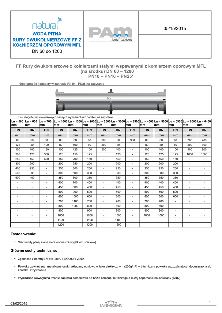 05/15/2015 WODA PITNA RURY DWUKOŁNIERZOWE FF Z KOŁNIERZEM OPOROWYM MFL DN 60 do 1200 FF Rury dwukołnierzowe z kołnierzami stałymi wspawanymi z kołnierzem oporowym MFL (na środku) DN 60 – 1200 PN10 – PN16 – PN25* *Dostępność kołnierzy w zakresie PN10 – PN25 na zapytanie Lu - długość rur kołnierzowych o innych wymiarach niż poniżej, na zapytanie. Lu = 500 Lu = 600 Lu = 700 Lu = 1000 Lu = 1500 Lu = 2000 Lu = 2500 Lu = 3000 Lu = 3500 Lu = 4000 Lu = 5000 Lu = 5900 Lu = 6000 Lu = 6400 mm mm mm mm mm mm mm mm mm mm mm mm mm mm DN DN DN DN DN DN DN DN DN DN DN DN DN DN mm mm mm mm mm mm mm mm mm mm mm mm mm mm 60 60 80 60 80 60 200 60 300 60 60 60 700 700 125 80 100 80 100 80 300 80 - 80 80 80 800 800 150 100 150 100 125 100 500 100 - 100 100 100 900 900 200 125 350 125 150 125 125 - 125 125 125 1000 1000 250 150 600 150 200 150 - 150 - 150 150 150 - - 300 200 - 200 250 200 - 200 - 200 200 200 - - 400 250 - 250 300 250 - 250 - 250 250 250 - - 500 300 - 300 500 300 - 300 - 300 300 300 - - 600 400 - 350 600 350 - 350 - 350 350 350 - - - - - 400 700 400 - 400 - 400 400 400 - - - - - 450 800 450 - 450 - 450 450 450 - - - - - 500 900 500 - 500 - 500 500 500 - - - - - 600 1000 600 - 600 - 600 600 600 - - - - - 700 1100 700 - 700 - 700 700 - - - - - - 800 1200 800 - 800 - 800 800 - - - - - - 900 900 - 900 - 900 900 - - - - - - 1000 1000 - 1000 - 1000 1000 - - - - - - 1100 1100 - 1100 - - - - - - - - - 1200 1200 - 1200 - - - - - - Zastosowanie: • Sieci wody pitnej i inne sieci wodne (za wyjątkiem ścieków) Główne cechy techniczne: • Zgodność z normą EN 545-2010 i ISO 2531-2009 • Powłoka zewnętrzna: metaliczny cynk nakładany ogniowo w łuku elektrycznym (200g/m²) + bitumiczna powłoka uszczelniająca, dopuszczona do kontaktu z żywnością • Wykładzina wewnętrzna trzonu: zaprawa cementowa na bazie cementu hutniczego o dużej odporności na siarczany (SRC) 03/02/2015 1