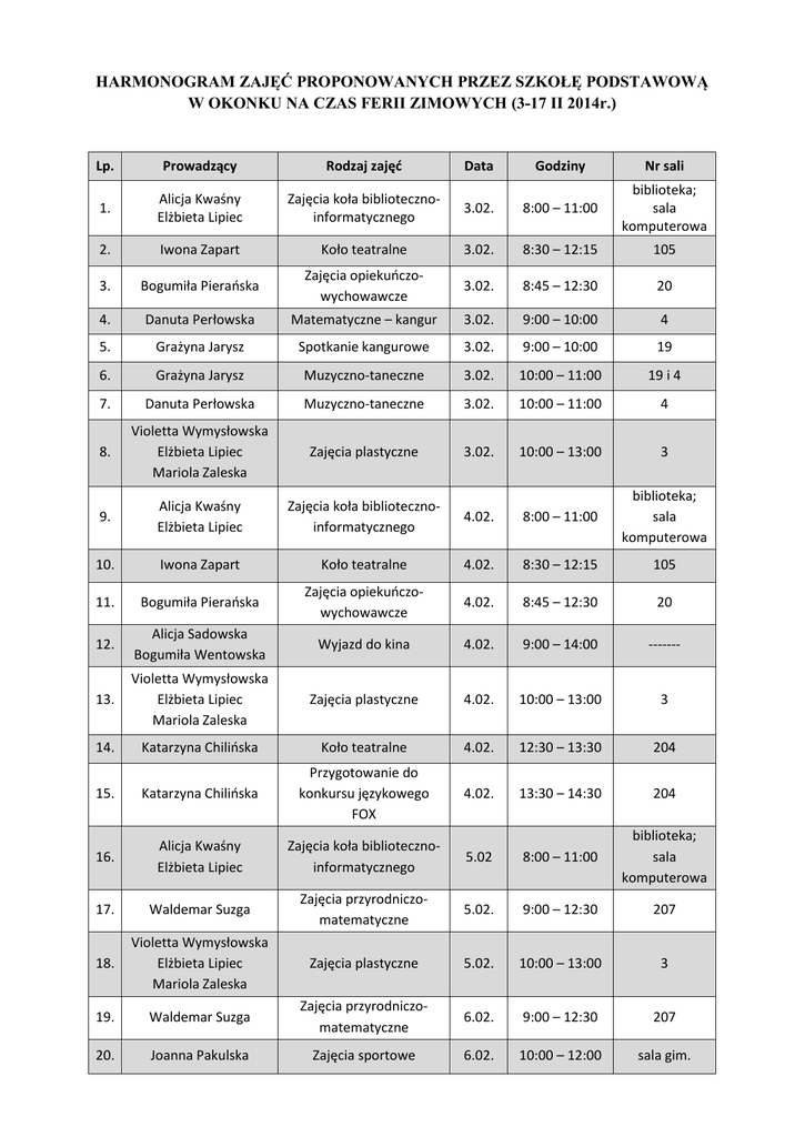 HARMONOGRAM ZAJĘĆ PROPONOWANYCH PRZEZ SZKOŁĘ PODSTAWOWĄ W OKONKU NA CZAS FERII ZIMOWYCH (3-17 II 2014r.) Lp. Prowadzący Rodzaj zajęć Data Godziny Nr sali 1. Alicja Kwaśny Elżbieta Lipiec Zajęcia koła bibliotecznoinformatycznego 3.02. 8:00 – 11:00 biblioteka; sala komputerowa 2. Iwona Zapart Koło teatralne 3.02. 8:30 – 12:15 105 3. Bogumiła Pierańska Zajęcia opiekuńczowychowawcze 3.02. 8:45 – 12:30 20 4. Danuta Perłowska Matematyczne – kangur 3.02. 9:00 – 10:00 4 5. Grażyna Jarysz Spotkanie kangurowe 3.02. 9:00 – 10:00 19 6. Grażyna Jarysz Muzyczno-taneczne 3.02. 10:00 – 11:00 19 i 4 7. Danuta Perłowska Muzyczno-taneczne 3.02. 10:00 – 11:00 4 8. Violetta Wymysłowska Elżbieta Lipiec Mariola Zaleska Zajęcia plastyczne 3.02. 10:00 – 13:00 3 9. Alicja Kwaśny Elżbieta Lipiec Zajęcia koła bibliotecznoinformatycznego 4.02. 8:00 – 11:00 biblioteka; sala komputerowa 10. Iwona Zapart Koło teatralne 4.02. 8:30 – 12:15 105 11. Bogumiła Pierańska Zajęcia opiekuńczowychowawcze 4.02. 8:45 – 12:30 20 12. Alicja Sadowska Bogumiła Wentowska Wyjazd do kina 4.02. 9:00 – 14:00 ------- 13. Violetta Wymysłowska Elżbieta Lipiec Mariola Zaleska Zajęcia plastyczne 4.02. 10:00 – 13:00 3 14. Katarzyna Chilińska Koło teatralne 4.02. 12:30 – 13:30 204 15. Katarzyna Chilińska Przygotowanie do konkursu językowego FOX 4.02. 13:30 – 14:30 204 16. Alicja Kwaśny Elżbieta Lipiec Zajęcia koła bibliotecznoinformatycznego 5.02 8:00 – 11:00 biblioteka; sala komputerowa 17. Waldemar Suzga Zajęcia przyrodniczomatematyczne 5.02. 9:00 – 12:30 207 18. Violetta Wymysłowska Elżbieta Lipiec Mariola Zaleska Zajęcia plastyczne 5.02. 10:00 – 13:00 3 19. Waldemar Suzga Zajęcia przyrodniczomatematyczne 6.02. 9:00 – 12:30 207 20. Joanna Pakulska Zajęcia sportowe 6.02. 10:00 – 12:00 sala gim. 21. Waldemar Suzga Zajęcia przyrodniczomatematyczne 7.02. 9:00 – 12:30 207 22. Katarzyna Pastusiak Edyta Soliwoda Zajęcia z projektu „eSzkoła Wielkopolska” 10.02. 10:00 – 12:15 zajęcia w terenie 23. Katarzyna Chilińska Koło teatralne 11.02. 10:00 – 11:00 204 24. Katarzyna Pastusiak Edyta Soliwoda Zajęcia z projektu „eSzkoła Wielkopolska” 11.02. 10:00 – 12:15 zajęcia w terenie 25. Katarzyna Chilińska Przygotowanie do konkursu językowego FOX 11.02. 11:00 – 12:00 204 26. Joanna Pakulska Zajęcia sportowe 13.02. 10:00 – 12:00 sala gim.