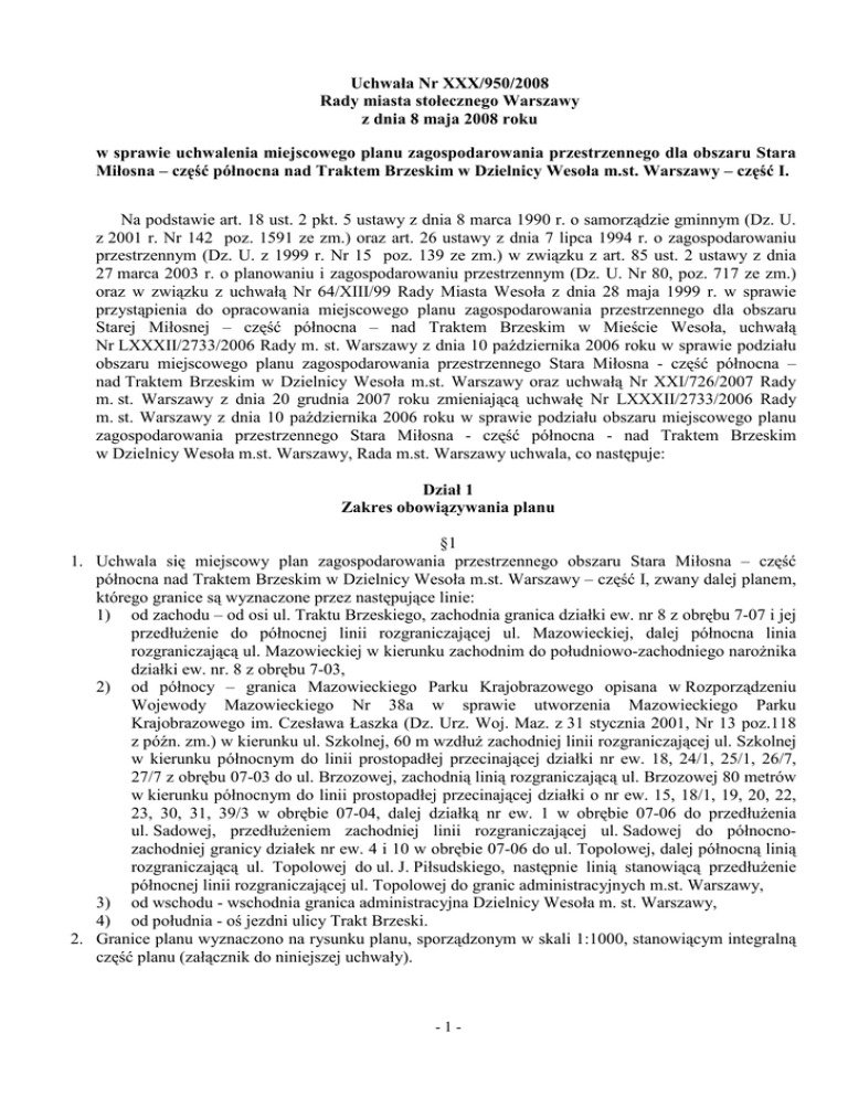 Uchwała Nr XXX/950/2008 Rady miasta stołecznego Warszawy z dnia 8 maja 2008 roku w sprawie uchwalenia miejscowego planu zagospodarowania przestrzennego dla obszaru Stara Miłosna – część północna nad Traktem Brzeskim w Dzielnicy Wesoła m.st. Warszawy – część I. Na podstawie art. 18 ust. 2 pkt. 5 ustawy z dnia 8 marca 1990 r. o samorządzie gminnym (Dz. U. z 2001 r. Nr 142 poz. 1591 ze zm.) oraz art. 26 ustawy z dnia 7 lipca 1994 r. o zagospodarowaniu przestrzennym (Dz. U. z 1999 r. Nr 15 poz. 139 ze zm.) w związku z art. 85 ust. 2 ustawy z dnia 27 marca 2003 r. o planowaniu i zagospodarowaniu przestrzennym (Dz. U. Nr 80, poz. 717 ze zm.) oraz w związku z uchwałą Nr 64/XIII/99 Rady Miasta Wesoła z dnia 28 maja 1999 r. w sprawie przystąpienia do opracowania miejscowego planu zagospodarowania przestrzennego dla obszaru Starej Miłosnej – część północna – nad Traktem Brzeskim w Mieście Wesoła, uchwałą Nr LXXXII/2733/2006 Rady m. st. Warszawy z dnia 10 października 2006 roku w sprawie podziału obszaru miejscowego planu zagospodarowania przestrzennego Stara Miłosna - część północna – nad Traktem Brzeskim w Dzielnicy Wesoła m.st. Warszawy oraz uchwałą Nr XXI/726/2007 Rady m. st. Warszawy z dnia 20 grudnia 2007 roku zmieniającą uchwałę Nr LXXXII/2733/2006 Rady m. st. Warszawy z dnia 10 października 2006 roku w sprawie podziału obszaru miejscowego planu zagospodarowania przestrzennego Stara Miłosna - część północna - nad Traktem Brzeskim w Dzielnicy Wesoła m.st. Warszawy, Rada m.st. Warszawy uchwala, co następuje: Dział 1 Zakres obowiązywania planu §1 1. Uchwala się miejscowy plan zagospodarowania przestrzennego obszaru Stara Miłosna – część północna nad Traktem Brzeskim w Dzielnicy Wesoła m.st. Warszawy – część I, zwany dalej planem, którego granice są wyznaczone przez następujące linie: 1) od zachodu – od osi ul. Traktu Brzeskiego, zachodnia granica działki ew. nr 8 z obrębu 7-07 i jej przedłuŜenie do północnej linii rozgraniczającej ul. Mazowieckiej, dalej północna linia rozgraniczającą ul. Mazowieckiej w kierunku zachodnim do południowo-zachodniego naroŜnika działki ew. nr. 8 z obrębu 7-03, 2) od północy – granica Mazowieckiego Parku Krajobrazowego opisana w Rozporządzeniu Wojewody Mazowieckiego Nr 38a w sprawie utworzenia Mazowieckiego Parku Krajobrazowego im. Czesława Łaszka (Dz. Urz. Woj. Maz. z 31 stycznia 2001, Nr 13 poz.118 z późn. zm.) w kierunku ul. Szkolnej, 60 m wzdłuŜ zachodniej linii rozgraniczającej ul. Szkolnej w kierunku północnym do linii prostopadłej przecinającej działki nr ew. 18, 24/1, 25/1, 26/7, 27/7 z obrębu 07-03 do ul. Brzozowej, zachodnią linią rozgraniczającą ul. Brzozowej 80 metrów w kierunku północnym do linii prostopadłej przecinającej działki o nr ew. 15, 18/1, 19, 20, 22, 23, 30, 31, 39/3 w obrębie 07-04, dalej działką nr ew. 1 w obrębie 07-06 do przedłuŜenia ul. Sadowej, przedłuŜeniem zachodniej linii rozgraniczającej ul. Sadowej do północnozachodniej granicy działek nr ew. 4 i 10 w obrębie 07-06 do ul. Topolowej, dalej północną linią rozgraniczającą ul. Topolowej do ul. J. Piłsudskiego, następnie linią stanowiącą przedłuŜenie północnej linii rozgraniczającej ul. Topolowej do granic administracyjnych m.st. Warszawy, 3) od wschodu - wschodnia granica administracyjna Dzielnicy Wesoła m. st. Warszawy, 4) od południa - oś jezdni ulicy Trakt Brzeski. 2. Granice planu wyznaczono na rysunku planu, sporządzonym w skali 1:1000, stanowiącym integralną część planu (załącznik do niniejszej uchwały). -1- §2 Celem planu jest umoŜliwienie wprowadzenia zabudowy mieszkaniowej i usługowej na obszarze objętym planem oraz ustalenie zasad zagospodarowania terenu ze szczególnym uwzględnieniem warunków ochrony środowiska, w tym: 1) kształtowania i utrzymania ładu przestrzennego w harmonii ze środowiskiem przyrodniczym, 2) łączenia zabudowy z terenami chronionymi, 3) zagospodarowania wolnych terenów, 4) komunikacji oraz uzbrojenia terenu. §3 1. Plan zawiera ustalenia dotyczące: 1) przeznaczenia terenów oraz linii rozgraniczających tereny o róŜnych funkcjach lub róŜnych zasadach zagospodarowania, 2) lokalnych warunków i zasad kształtowania zabudowy i zagospodarowania terenu, w tym: linii zabudowy, wysokości obiektów oraz linii rozgraniczających tereny, 3) szczególnych zasad i warunków zagospodarowania terenów, w tym zakazów zabudowy, wynikających z potrzeb ochrony środowiska przyrodniczego i prawidłowego gospodarowania zasobami przyrody, 4) zasad i warunków podziału terenów na działki budowlane, 5) tymczasowych sposobów zagospodarowania oraz uŜytkowania terenów, 6) stawki procentowej słuŜącej naliczeniu opłaty za wzrost wartości nieruchomości na skutek uchwalenia planu, 7) linii rozgraniczających ulic i dróg publicznych wraz z urządzeniami pomocniczymi, 8) zasad obsługi inŜynieryjnej obszarów w powiązaniu z siecią uzbrojenia dzielnicy i miasta st. Warszawy. 2. Plan zawiera ustalenia szczegółowe dla terenów oznaczonych na rysunku planu następującymi symbolami: 1) MN – tereny zabudowy mieszkaniowej jednorodzinnej, 2) MNL – tereny zabudowy mieszkaniowej jednorodzinnej na działkach leśnych, 3) U – tereny zabudowy usługowej, 4) MN/U – tereny zabudowy mieszkaniowej jednorodzinnej z wbudowanymi usługami, 5) KZ, KL, KD, KW, KS – tereny komunikacji (drogi, ulice i parkingi), 6) Z – tereny zieleni, 7) ZL – tereny leśne, 8) ZP – zieleń parkowa, 9) R – tereny rolne, 10) X – tereny wskazane do przekształceń na cele usług ponadlokalnych. 3. Na terenach, o których mowa w ust. 2 ustala się przeznaczenie podstawowe, a w uzasadnionych przypadkach ustala się takŜe przeznaczenie dopuszczalne oraz określa się właściwe dla tego przeznaczenia warunki zabudowy i zagospodarowania. §4 1. Następujące oznaczenia graficzne na rysunku planu są obowi