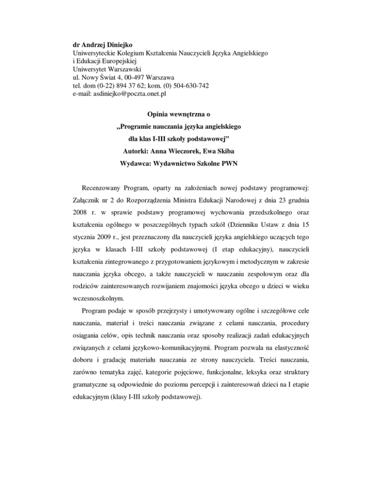 dr Andrzej Diniejko Uniwersyteckie Kolegium Kształcenia Nauczycieli Języka Angielskiego i Edukacji Europejskiej Uniwersytet Warszawski ul. Nowy Świat 4, 00-497 Warszawa tel. dom (0-22) 894 37 62; kom. (0) 504-630-742 e-mail: [email protected] Opinia wewnętrzna o „Programie nauczania języka angielskiego dla klas I-III szkoły podstawowej” Autorki: Anna Wieczorek, Ewa Skiba Wydawca: Wydawnictwo Szkolne PWN Recenzowany Program, oparty na załoŜeniach nowej podstawy programowej: Załącznik nr 2 do Rozporządzenia Ministra Edukacji Narodowej z dnia 23 grudnia 2008 r. w sprawie podstawy programowej wychowania przedszkolnego oraz kształcenia ogólnego w poszczególnych typach szkół (Dzienniku Ustaw z dnia 15 stycznia 2009 r., jest przeznaczony dla nauczycieli języka angielskiego uczących tego języka w klasach I-III szkoły podstawowej (I etap edukacyjny), nauczycieli kształcenia zintegrowanego z przygotowaniem językowym i metodycznym w zakresie nauczania języka obcego, a takŜe nauczycieli w nauczaniu zespołowym oraz dla rodziców zainteresowanych rozwijaniem znajomości języka obcego u dzieci w wieku wczesnoszkolnym. Program podaje w sposób przejrzysty i umotywowany ogólne i szczegółowe cele nauczania, materiał i treści nauczania związane z celami nauczania, procedury osiągania celów, opis technik nauczania oraz sposoby realizacji zadań edukacyjnych związanych z celami językowo-komunikacyjnymi. Program pozwala na elastyczność doboru i gradację materiału nauczania ze strony nauczyciela. Treści nauczania, zarówno tematyka zajęć, kategorie pojęciowe, funkcjonalne, leksyka oraz struktury gramatyczne są odpowiednie do poziomu percepcji i zainteresowań dzieci na I etapie edukacyjnym (klasy I-III szkoły podstawowej). 2 Koncepcja pedagogiczna leŜąca u podstaw recenzowanego Programu jest zgodna z ogólnoeuropejskimi tendencjami do wprowadzania nauki języka obcego w okresie wczesnoszkolnym, w tym z zaleceniami Rady Europy. Uczenie się języka obcego w okresie wczesnoszkolnym wymaga kształtowania sprawności rozumienia ze słuchu, zachęcania dzieci do mówienia w języku obcym bez stresu i przymusu, głównie przez naśladownictwo i zabawę, tj. wykorzystując naturalną ruchliwość i aktywność poznawczą dziecka, co sprzyja równieŜ rozwijaniu słownictwa i poprawności gramatycznej bez formalnej nauki reguł gramatycznych. Do głównych celów Program zalicza zapewnienie kontaktu z językiem obcym w formie zabawowej, zachęcanie dzieci do reagowania językowego, początkowo poprzez proste wypowiedzi ustne; „osłuchanie” i oswojenie dziecka z językiem obcym; uruchomienie naturalnego potencjału zdolności naśladowczych dziecka w celu ustnej nauki języka angielskiego; uwraŜliwienie dziecka na moŜliwość własnej komunikacji w innym języku niŜ ojczystym i wskazywanie mu płynących z tego korzyści; rozwijanie w uczniach poczucia własnej wartości oraz wiary we własne moŜliwości językowe; wzbudzanie i umacnianie motywacji do nauki języka obcego. Zakresy tematyczne treści nauczania obejmują rzeczywistość dobrze znaną dziecku, a więc „mój dom”, „moje zabawki”, „zwierzęta” itd., W klasie drugiej i trzeciej Autorki proponują spiralny układ treści nauczania, który pozwala na utrwalanie i pogłębianie poznanej tematyki poprzez stosowanie odpowiednich zwrotów i słownictwa oraz funkcji komunikacyjnych. Autorki Programu twierdzą, Ŝe w nauce języka obcego na poziomie wczesnoszkolnym powinno się całkowicie wyeliminować zjawisko niepowodzenia. Istotnie, w zintegrowanym kształceniu wczesnoszkolnym nauczyciel nie powinien oceniać swoich uczniów w kategoriach niepowodzenia dydaktycznego. KaŜdy uczeń rozwija się na miarę swoich moŜliwości i w odpowiednim dla siebie tempie, zatem ocena winna mieć charakter opisowy i dotyczyć nie tylko postępów w nauce, ale ogólnego poziomu rozwoju ucznia. Nauczyciel powinien kształtować kompetencję językową dzieci w zrozumiałych kontekstach sytuacyjnych, a nauka języka powinna odbywać się przy zastosowaniu podejścia wizualnego i wielosensorycznego. Autorki Programu proponują naukę przez zabawę dydaktyczną, która pozwala na kojarzenie przedmiotów, zjawisk i czynności ze słowem. Nauczanie gramatyki winno 3 odbywać się w sposób pośredni, gdyŜ w okresie wczesnoszkolnym dzieci uczą się na ogół nieanalitycznie w sposób automatyczny i holistyczny. Dlatego skutecznym podejściem do nauki języka jest metoda TPR (Total Physical Response), którą moŜna opisać wg formuły: zrozum, wykonaj, powiedz. Procedury osiągania celów obejmują swobodne korzystanie z róŜnych metod i technik nauczania języka obcego, odpowiednich do poziomu percepcji dzieci, a więc z metody TPR, komunikacyjnej, gier dydaktycznych, zabaw logicznych (zagadki, wykreślanie, krzyŜówki) i piosenek, wyszukiwania słów, dobieranie podpisów do ilustracji, pisanie po śladzie, projekty itp. Program zaleca integrację w zakresie tematyki i treści nauczania, a więc takŜe kształcenie kompetencji międzykulturowej (przygotowanie do odbioru dóbr kultury), kształcenie pojęć matematycznych, wiedzy o środowisku społecznym i przyrodniczym oraz kształcenie artystyczne i wychowanie fizyczne. Ponadto Autorki Programu proponują indywidualizację nauczania oraz wyrabianie nawyków samokształceniowych. WaŜnym elementem nauki języka jest nauka pisania. W okresie wczesnoszkolnym dzieci poznają język przede wszystkim w formie mówionej, ale stopniowo uczą się czytać i pisać, początkowo po śladzie, następnie uczą się literowania słów i przepisywania, podpisywania, uzupełniania luk i na końcu pisania krótkich tekstów. Program zawiera szczegółowy opis wewnątrzszkolnego systemu oceniania ucznia (karty osiągnięć). Opis ten jest zgodny z nową Podstawą programową. Autorki Programu zalecają wdraŜanie uczniów do regularnej samooceny („JuŜ umiem”). Recenzowa