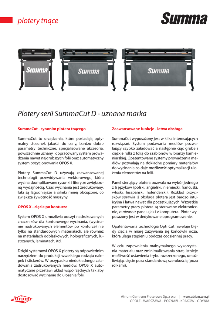 plotery tnące Plotery serii SummaCut D - uznana marka SummaCut - synonim plotera tnącego Zaawansowane funkcje - łatwa obsługa SummaCut to urządzenia, które posiadają optymalny stosunek jakości do ceny, bardzo dobre parametry techniczne, specjalizowane akcesoria, powszechnie uznany i dopracowany system prowadzenia nawet najgrubszych folii oraz automatyczny system pozycjonowania OPOS X. SummaCut wyposażony jest w kilka interesujących rozwiązań. System podawania mediów pozwalający szybko załadować a następnie ciąć grube i ciężkie rolki z folią do szablonów w branży kamieniarskiej. Opatentowane systemy prowadzenia mediów pozwalają na dokładne pomiary materiałów do wycinania co daje możliwość optymalizacji ułożenia elementów na folii. Plotery SummaCut D używają zaawansowanej technologii przewidywania wektorowego, która wycina skomplikowane rysunki i litery ze zwiększoną wydajnością. Czas wycinania jest zredukowany, łuki są łagodniejsze a silniki mniej obciążone, co zwiększa żywotność maszyny. OPOS X - cięcie po konturze System OPOS X umożliwia odczyt nadrukowanych znaczników dla konturowego wycinania, (wycinanie nadrukowanych elementów po konturze) nie tylko na standardowych materiałach, ale również na materiałach odblaskowych, holograficznych, lustrzanych, laminatach, itd. Dzięki systemowi OPOS X plotery są odpowiednim narzędziem do produkcji wszelkiego rodzaju nalepek i stickerów. W przypadku niedokładnego załadowania zadrukowanych mediów, OPOS X automatycznie przestawi układ współrzędnych tak aby dostosować wycinanie do ułożenia folii. Panel sterujący plotera pozwala na wybór jednego z 6 języków (polski, angielski, niemiecki, francuski, włoski, hiszpański, holenderski). Rozkład przycisków sprawia iż obsługa plotera jest bardzo intuicyjna i łatwa nawet dla początkujących. Wszystkie parametry pracy plotera są sterowane elektronicznie, zarówno z panelu jak i z komputera. Ploter wyposażony jest w dedykowane oprogramowanie. Opatentowana technologia Opti Cut niweluje błędy cięcia w miarę zużywania się końcówki noża, która ulega stępieniu podczas codziennej pracy. W celu zapewnienia maksymalnego wykorzystania materiału oraz zminimalizowania strat, istnieje możliwość ustawienia trybu rozszerzonego, umożliwiając cięcie poza standardową szerokością (poza rolkami). Atrium Centrum Ploterowe Sp. z o.o. | www.atrium.com.pl OPOLE - WARSZAWA - POZNAŃ - KRAKÓW - GDYNIA plotery tnące Parametry techniczne D 60R D 120R D 140R D 160R Min. szerokość mediów Max. szerokość mediów Max. szerokość cięcia Max. szerokość cięcia (t. rozszerzony) 120 mm 1270 mm 1200 mm 1230 mm 180 mm 1420 mm 1350 mm 1380 mm 180 mm 1640 mm 1575 mm 1605 mm 70 mm 670 mm 600 mm 630 mm Max. prędkość cięcia1131 mm/s Max. przyspieszenie3G Nacisk noża Powtarzalność Rozdzielczość mechaniczna Rozdzielczość adresowana 0 - 400 gram (regulacja co 5 gram) +/- 0.11 mm do 8 m 0.0127 mm 0.1 mm, 0.025 mm (z możliwością wyboru) InterfejsUSB, RS-232 Bufor pamięci 16 MB Wymiary urządzenia (szer.) Wymiary urządzenia (wys. x głęb.) 1000 mm 1600 mm 1120 x 680 mm 1750 mm 1980 mm Podstawa i koszopcjastandardstandardstandard Warunki pracy 15-35 °C, 35-80% RH © Atrium Centrum Ploterowe / Summa. Wszystkie prawa zastrzeżone. Znaki handlowe są własnością odpowiednich firm. Informacje zawarte w niniejszej publikacji mogą bez uprzedzenia ulec zmianie. Niniejsze ogłoszenie nie stanowi oferty handlowej w rozumieniu Kodeksu Cywilnego. Zdjęcia dostarcza Fotolia (www.fotolia.pl). 201504 PL