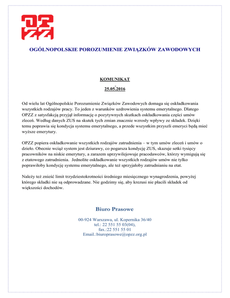 OGÓLNOPOLSKIE POROZUMIENIE ZWIĄZKÓW ZAWODOWYCH KOMUNIKAT 25.05.2016 Od wielu lat Ogólnopolskie Porozumienie Związków Zawodowych domaga się oskładkowania wszystkich rodzajów pracy. To jeden z warunków uzdrowienia systemu emerytalnego. Dlatego OPZZ z satysfakcją przyjął informację o pozytywnych skutkach oskładkowania części umów zleceń. Według danych ZUS na skutek tych zmian znacznie wzrosły wpływy ze składek. Dzięki temu poprawia się kondycja systemu emerytalnego, a przede wszystkim przyszli emeryci będą mieć wyższe emerytury. OPZZ popiera oskładkowanie wszystkich rodzajów zatrudnienia – w tym umów zleceń i umów o dzieło. Obecnie wciąż system jest dziurawy, co pogarsza kondycję ZUS, skazuje setki tysięcy pracowników na niskie emerytury, a zarazem uprzywilejowuje pracodawców, którzy wymigują się z etatowego zatrudnienia. Jednolite oskładkowanie wszystkich rodzajów umów nie tylko poprawiłoby kondycję systemu emerytalnego, ale też sprzyjałoby zatrudnianiu na etat. Należy też znieść limit trzydziestokrotności średniego miesięcznego wynagrodzenia, powyżej którego składki nie są odprowadzane. Nie godzimy się, aby krezusi nie płacili składek od większości dochodów. Biuro Prasowe 00-924 Warszawa, ul. Kopernika 36/40 tel.: 22 551 55 03(04), fax.:22 551 55 01 Email.:[email protected]