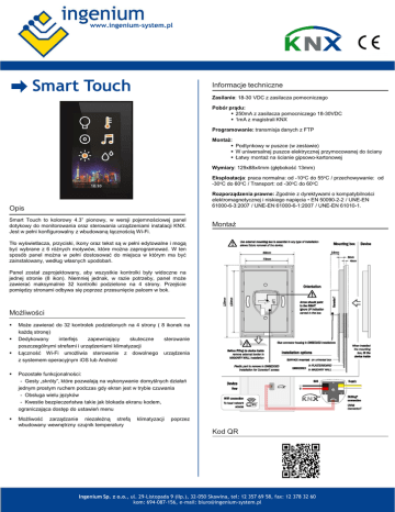 www.ingenium-system.pl Smart Touch Informacje techniczne Zasilanie: 18-30 VDC z zasilacza pomocniczego Pobór prądu: 250mA z zasilacza pomocniczego 18-30VDC 1mA z magistrali KNX Programowanie: transmisja danych z FTP Montaż: Podtynkowy w puszce (w zestawie) W uniwersalnej puszce elektrycznej przymocowanej do ściany Łatwy montaż na ścianie gipsowo-kartonowej Wymiary: 129x88x4mm (głębokość 13mm) Eksploatacja: praca normalna: od -10oC do 55oC / przechowywanie: od -30oC do 60oC / Transport: od -30oC do 60oC Rozporządzenia prawne: Zgodnie z dyrektywami o kompatybilności elektromagnetycznej i niskiego napięcia • EN 50090-2-2 / UNE-EN 61000-6-3:2007 / UNE-EN 61000-6-1:2007 / UNE-EN 61010-1. Opis Smart Touch to kolorowy 4.3” pionowy, w wersji pojemnościowej panel dotykowy do monitorowania oraz sterowania urządzeniami instalacji KNX. Jest w pełni konfigurowalny z wbudowaną łącznością Wi-Fi. Montaż Tło wyświetlacza, przyciski, ikony oraz tekst są w pełni edytowalne i mogą być wybrane z 6 różnych motywów, które można zaprogramować. W ten sposób panel można w pełni dostosować do miejsca w którym ma być zainstalowany, według własnych upodobań. Panel został zaprojektowany, aby wszystkie kontrolki były widoczne na jednej stronie (8 ikon). Niemniej jednak, w razie potrzeby, panel może zawierać maksymalnie 32 kontrolki podzielone na 4 strony. Przejście pomiędzy stronami odbywa się poprzez przesunięcie palcem w bok. Możliwości Może zawierać do 32 kontrolek podzielonych na 4 strony ( 8 ikonek na każdą stronę) Dedykowany interfejs zapewniający skuteczne sterowanie poszczególnymi strefami i urządzeniami klimatyzacji Łączność Wi-Fi umożliwia sterowanie z dowolnego urządzenia z systemem operacyjnym iOS lub Android Pozostałe funkcjonalności: - Gesty „skróty”, które pozwalają na wykonywanie domyślnych działań jednym prostym ruchem podczas gdy ekran jest w trybie czuwania - Obsługa wielu języków - Kwestie bezpieczeństwa takie jak blokada ekranu kodem, ograniczająca dostęp do ustawień menu Możliwość zarządzanie niezależną strefą wbudowany wewnętrzny czujnik temperatury klimatyzacji poprzez Kod QR Ingenium Sp. z o.o., ul. 29-Listopada 9 (IIp.), 32-050 Skawina, tel: 12 357 69 58, fax: 12 378 32 60 kom: 694-087-156, e-mail: [email protected]