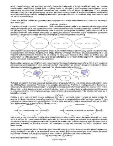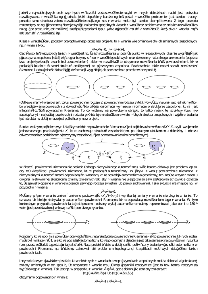Jedną z najważniejszych cech wspólnych większości zastosowań matematyki w innych dziedzinach nauki jest potrzeba rozwiązywania równań. Na ogół jednak, jeżeli dopuścimy bardzo ogólną postać równań, to problem ten jest bardzo trudny, ponadto sama struktura zbioru rozwiązań interesującego nas równania może być bardzo skomplikowana. Z tego powodu matematycy na ogół koncentrują swoje wysiłki na bardzo specjalnych klasach równań oraz problem znalezienia ich rozwiązań (co na ogół po prostu nie jest możliwe) zastępują pytaniami typu: jakie własności ma zbiór rozwiązań?, kiedy dwa równania mają taki sam zbiór rozwiązań? itp. Klasa równań leżąca u podstaw przygotowanego przez nas projektu to równania wielomianowe dwóch zmiennych zespolonych, np. równania typu: x2+y2+i=0, y2=x2+x+1. Cechą wspólną wszystkich takich równań jest to, że ich rozwiązania w pobliżu punktów nieosobliwych lokalnie wyglądają jak płaszczyzna zespolona. Jeżeli więc ograniczymy się do równań nieosobliwych oraz dokonamy naturalnego uzwarcenia (poprzez tzw. projektywizację, zwaną też urzutowieniem) zbiorów rozwiązań, to otrzymane rozwiązania będą powierzchniami, które posiadają lokalnie tę samą strukturę analityczną, co płaszczyzna zespolona. Powierzchnie takie noszą nazwę powierzchni Riemanna i z dokładnością do ciągłej deformacji wyglądają jak powierzchnie przedstawione poniżej. (Od lewej mamy kolejno sferę, torus, powierzchnię rodzaju 2, powierzchnie rodzaju 3 itd.). Powyższy rysunek jest jednak mylący, bo przedstawianie powierzchni z dokładnością do ciągłej deformacji wymazuje informację o strukturze zespolonej, która jest integralną częścią powierzchni Riemanna. To co widzimy na powyższym obrazku to tylko nośnik tej struktury (tzw. typ topologiczny) - na każdej powierzchni rodzaju g>0 istnieje nieskończenie wiele różnych struktur zespolonych i właśnie badaniu tych struktur w dużej mierze jest poświęcony nasz projekt. Bardzo ważnym pojęciem wyróżniającym niektóre powierzchnie Riemanna X jest pojęcie automorfizmu f:X→X, czyli wzajemnie jednoznacznego przekształcenia X, które zachowuje strukturę zespoloną (tzn. po lokalnym utożsamieniu dziedziny i obrazu odwzorowania z podzbiorem płaszczyzny zespolonej, f jest odwzorowaniem holomorficznym). Większość powierzchni Riemanna nie posiada żadnego nietrywialnego automorfizmu, więc bardzo ciekawy jest problem opisu, czy też klasyfikacji powierzchni Riemanna, które posiadają automorfizmy. W języku równań, powierzchnie Riemanna z nietrywialnymi automorfizmami odpowiadają równaniom, które posiadają automorfizm algebraiczny, tzn. można w tym równaniu dokonać nietrywialnej algebricznej zmiany zmiennych tak, aby równanie nie uległo zmianie (w zastosowaniach zwykle oznacza to, że zjawisko opisane równaniem posiada pewnego rodzaju symetrię lub prawo zachowania). Taka sytuacja ma miejsce np. w przypadku równania: y2=x2+x+1. Możemy w tym równaniu zmienić zmienne podstawiając (x',y')=(x,-y) i wyniku tej zmiany równanie nie ulegnie zmianie. To oznacza, że istnieje nietrywialny automorfizm powierzchni Riemanna, która odpowiada rozwiązaniom tego równania. W tym konkretnym przypadku powierzchnia ta jest torusem i opisany wyżej automorfizm możemy reprezentować jako obrót o 180 o wokół osi przedstawionej w lewej części poniższego rysunku. Pojęciem, które uogólnia powyższy przykład są tzw. hipereliptyczne powierzchnie Riemanna - są to powierzchnie, których rodzaj może być większy niż 1, ale które posiadają automorfizm, którego geometria działania jest taka sama jak na powyższym rysunku (tzn. przestrzeń orbit tego działania jest sferą). Nasz projekt będzie w dużej części poświęcony badaniu własności automorfizmów powierzchni Riemanna, np. będziemy zajmować się problemem topologicznej klasyfikacji możliwych działań na takich powierzchniach. Innym ciekawym zjawiskiem jest fakt, że w niektórych równaniach o współczynnikach zespolonych można dokonać algebraicznej zmiany zmiennych w ten sposób, że otrzymane równanie ma już współczynniki rzeczywiste (jest to tzw. forma rzeczywista wyjściowego równania). Tak jest np. w przypadku równania: x2+y2=i, gdzie dokonując zamiany zmiennych: (x',y')=(i√ix,i√iy) lub (x',y')=(√ix,√iy) otrzymamy odpowiednio równania: x2+y2=1 i x2+y2=-1. Istnienie tego typu zmiany zmiennych oznacza, że powierzchnia odpowiadająca zbiorowi rozwiązań tego równania ma symetrię (rozumianą jako antyholomorficzny automorfizm). W ten sposób badanie form rzeczywistych równań sprowadza się do badania symetrii odpowiadających im powierzchni Riemanna. W powyższym przykładzie zbiór rozwiązań równania jest sferą, a opisane podstawiania (a więc też otrzymane równania o współczynnikach rzeczywistych), odpowiadają jej dwóm symetriom: jednej która jest odbiciem lustrzanym względem płaszczyzny zawierającej równik, a druga jest odwzorowaniem antypodycznym. Zauważmy jeszcze, że punkty stałe tych symetrii (czyli równik w pierwszym i zbiór pusty w drugim przypadku) odpowiadają rzeczywistym rozwiązaniom otrzymanych form rzeczywistych. Innym ważnym problemem, którym będziemy się zajmować się w ramach naszego projektu jest problem klasyfikacji powierzchni Riemanna ustalonego rodzaju g. Okazuje się, że wszystkie takie powierzchnie można sparametryzować przy pomocy punktów bardzo porządnej przestrzeni Mg zwanej przestrzenią moduli. W ramach projektu będziemy zajmować się badaniami naturalnych podzbiorów S g, Rg, Hg tej przestrzeni zwanych miejscami osobliwymi, rzeczywistymi i hipereliptycznymi (z ang. singular, real and hyperelliptic loci), a parametryzującymi powierzchnie Riemanna, które odpowiednio: posiadają nietrywialny automorfizm, posiadają symetrię, bądź są hipereliptyczne. Ważnym elementem w konstrukcji przestrz