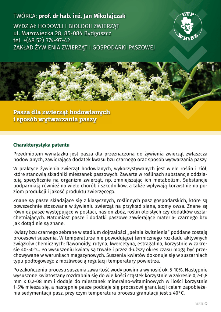 TWÓRCA: prof. dr hab. inż. Jan Mikołajczak WYDZIAŁ HODOWLI I BIOLOGII ZWIERZĄT ul. Mazowiecka 28, 85-084 Bydgoszcz tel. +(48 52) 374-97-42 ZAKŁAD ŻYWIENIA ZWIERZĄT I GOSPODARKI PASZOWEJ Pasza dla zwierząt hodowlanych i sposób wytwarzania paszy Charakterystyka patentu Przedmiotem wynalazku jest pasza dla przeznaczona do żywienia zwierząt zwłaszcza hodowlanych, zawierająca dodatek kwasu bzu czarnego oraz sposób wytwarzania paszy. W praktyce żywienia zwierząt hodowlanych, wykorzystywanych jest wiele roślin i ziół, które stanowią składniki mieszanek paszowych. Zawarte w roślinach substancje oddziałują specyficznie na organizm zwierząt, np. zmniejszając ich metabolizm, Substancje uodparniają również na wiele chorób i szkodników, a także wpływają korzystnie na poziom produkcji i jakość produktu zwierzęcego. Znane są pasze składające się z klasycznych, roślinnych pasz gospodarskich, które są powszechnie stosowane w żywieniu zwierząt na przykład siana, słomy owsa. Znane są również pasze występujące w postaci, nasion zbóż, roślin oleistych czy dodatków uszlachetniających. Natomiast pasze i dodatki paszowe zawierające materiał czarnego bzu jak dotąd nie są znane. Kwiaty bzu czarnego zebrane w stadium dojrzałości „pełnia kwitnienia” poddane zostają procesowi suszenia. W temperaturze nie powodującej termicznego rozkładu aktywnych związków chemicznych: flawonoidy, rutyna, kwercetyna, estragalina, korzystnie w zakresie 40-50°C. Po wysuszeniu kwiaty są trwałe i przez dłuższy okres czasu mogą być przechowywane w warunkach magazynowych. Suszenia kwiatów dokonuje się w suszarniach typu podłogowego z możliwością regulacji temperatury powietrza. Po zakończeniu procesu suszenia zawartość wody powinna wynosić ok. 5-10%. Następnie wysuszone kwiatostany rozdrabnia się do wielkości cząstek korzystnie w zakresie 0,2-0,8 mm x 0,2-08 mm i dodaje do mieszanek mineralno-witaminowych w ilości korzystnie 1-5% miesza się, a następnie pasze poddaje się procesowi granulacji celem zapobieżenia sedymentacji pasz, przy czym temperatura procesu granulacji jest ≤ 40°C. VERTE Projekt Współfinansowany ze środków Unii Europejskiej w ramach Europejskiego Funduszu Rozwoju Regionalnego Pasza dla zwierząt hodowlanych i sposób wytwarzania paszy KONTYNUACJA ZE STRONY 1. Przy przechowywaniu w warunkach magazynowych w optymalnej temperaturze i wilgotności mieszanka może być przechowywana w okresie do 1 roku. Zaletą przedstawionej paszy jest unikanie nadmiernej chemizacji w procesie żywienia zwierząt. Zamiast syntetycznych dodatków do pasz w rozwiązaniu wykorzystuje się naturalne dodatki, których skład chemiczny i oddziaływanie na organizm zwierzęcy zabezpiecza organizm zwłaszcza młodych zwierząt przed występowaniem szeregu schorzeń. Ponadto pasza wpływa na lepsze przyrosty masy ciała zwierząt i ogólne polepszenie stanu ich zdrowia. Zastosowanie w praktyce Pasza zawierająca dodatek kwiatu bzu czarnego może być zastosowana do żywienia zwierząt hodowlanych różnego gatunku. Potencjalnymi odbiorcami przedstawionego rozwiązania mogą być firmy zajmujące się produkcją i sprzedażą pasz dla zwierząt hodowlanych. Potencjalni odbiorcy Pasza może być produkowana przez firmy lub wytwórnie pasz specjalizujące się w mieszaniu, produkcji i sprzedaży pasz dla zwierząt gospodarskich. ul. Ks. A. Kordeckiego 20, 85-789 Bydgoszcz | wspolpraca.utp.edu.pl Bezpłatny materiał informacyjny