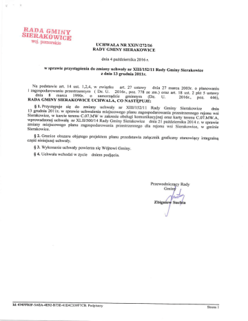 UCHWALA NR XXtV/272l16 RADY GMINY SIERAKOWICE dnia4 pu\dziemika 2016 r. w sprawie przystqpienia do zmiany uchwaty nrXllIlll2lll Rady Gminy Sierakowice z dnia 13 grudnia 20llr, Na podstawie art. 14 ust' 7,2,4, w zwiqzku art. 27 ustawy dnia 27 marca 2003r. o planowaniu ( Dz. U. 2016r., poz.77i ze zm) oraz arr.lg ust. 2 pkt 5 ustawy dnia 8 marca 1990r. o samorz4dzie gminnym (Dz. u. 2016r., poz. 446), RADA GMrNy STERAKOWTCE UCHWALA, CO NaSrfuru.rn, e dnia - $ 1. Prrystgpuje sig do zmiany 13 grudnia 2011r, w sprawie uchwaleni rejonu wsl sier-akowice, w karcie terenu c.07.Mw wprowadzonej uchwal4 nr ?l YY:}: zmiany miejscowego planu -'o-- i zagospodarowaniu przestrzennym Sierakowice. $ XLIVSO zagor lw try: gmlnle 2' Granice obszaru objgtego projektem planu przedstawia zalEcznik graficzny stanowi4cy integraln4 czgSi niniej szej uchwaly. g 3. Wykonanie uchwaty powierzasig W6jtowi Gminy. $ 4. Uchwata wchodzi w Zycie dniem podjgcia. ld: 47 4FFBZF - 5 AE A4E92-87 3E- 4 184C3 3 9F 7 CB, p o doi sa nv Strona I >Or z4-v Nh9 F. ,^ tc.i = *=F vx- vXri e'e ilah = "; J Y 9r'i giE :c: L,V J.y AC o $ &tJ E @ (/ (J Y e ;i q a a zAt_|CZNtK GRAFtczNY DO ucHWAtY NR Xxtv/272/1,6 z dnia 4 paidziernika 2016 roku 225/i SKATA L : it I I i \ t t 1 \ I t t t i I \ 1ai/l .LJl+ I I \ t I i I I i ! I I I t- I I 1 ! i t I \ t I I I It I I i tlldruk w skali 1:1000 1000 Uzasadnienie xfirlls2lll Rady Gminy z dnia 13 grudnia 20llr. ma na celu planowanego przez Gming zadania inweitycyjnego, polegaj4cego na ego centrum Kultury w sie zmiana ma dotyciyt gt6wnie- okreslenia nowych zasad ochrony Srodowiska, przyrody i krajobrazu naturalnego oiaz'wiznaczenia nowych parametr6w i wskaznik6w ksztaltowania zabudowy oraz zagospodarowania terenu dla planowanej zabudowy wraz z ustaleniem nowych zasad obslugi komunikacyjnej. Wnioskowany ter Wichrowe Wzg'tze im. F. Ceynowy orcz w bliskim s4siedztwie skrzyzowania ulic Kubusia puchatka, w Sierakowicach, d. na wprost budynku Szkoly podstawowej dze. Przewodniczqc Zbignl ld: 47 4YFB2F -5 AEA4E92-87 3E-4|E4C339F7CB. podpisany Shona I