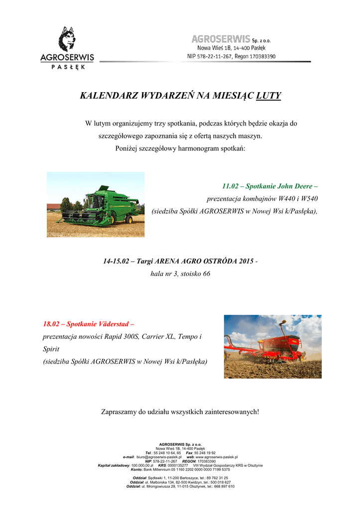 KALENDARZ WYDARZEŃ NA MIESIĄC LUTY W lutym organizujemy trzy spotkania, podczas których będzie okazja do szczegółowego zapoznania się z ofertą naszych maszyn. Poniżej szczegółowy harmonogram spotkań: 11.02 – Spotkanie John Deere – prezentacja kombajnów W440 i W540 (siedziba Spółki AGROSERWIS w Nowej Wsi k/Pasłęka), 14-15.02 – Targi ARENA AGRO OSTRÓDA 2015 hala nr 3, stoisko 66 18.02 – Spotkanie Väderstad – prezentacja nowości Rapid 300S, Carrier XL, Tempo i Spirit (siedziba Spółki AGROSERWIS w Nowej Wsi k/Pasłęka) Zapraszamy do udziału wszystkich zainteresowanych! AGROSERWIS Sp. z o.o. Nowa Wieś 1B, 14-400 Pasłęk Tel.: 55 248 10 64, 65 Fax: 55 248 19 92 e-mail: [email protected] web: www.agroserwis-paslek.pl NIP: 578-22-11-267 REGON: 170383390 Kapitał zakładowy: 100.000,00 zł KRS: 0000135277 VIII Wydział Gospodarczy KRS w Olsztynie Konto: Bank Millennium 05 1160 2202 0000 0000 7199 5375 Oddział: Sędławki 1, 11-200 Bartoszyce, tel.: 89 762 31 25 Oddział: ul. Malborska 134, 82-500 Kwidzyn, tel.: 500 018 627 Oddział: ul. Mrongowiusza 29, 11-015 Olsztynek, tel.: 668 897 610
