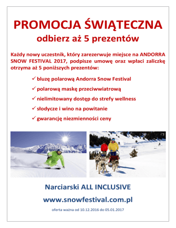 PROMOCJA ŚWIĄTECZNA odbierz aż 5 prezentów Każdy nowy uczestnik, który zarezerwuje miejsce na ANDORRA SNOW FESTIVAL 2017, podpisze umowę oraz wpłaci zaliczkę otrzyma aż 5 poniższych prezentów: bluzę polarową Andorra Snow Festival polarową maskę przeciwwiatrową nielimitowany dostęp do strefy wellness słodycze i wino na powitanie gwarancję niezmienności ceny Narciarski ALL INCLUSIVE www.snowfestival.com.pl oferta ważna od 10.12.2016 do 05.01.2017