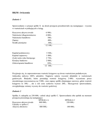 RKM- ćwiczenia Zadanie 1 Sprawozdanie z sytuacji spółki X na dzień przejęcia przedstawiało się następująco - wycena w wartościach wynikających z ksiąg. Rzeczowe aktywa trwałe Należności długoterminowe Należności handlowe Zapasy Środki pieniężne 6 900,4 000,500,400,300,12 100,- Kapitał podstawowy Kapitał zapasowy Zyski netto roku bieżącego Kredyty bankowe Zobowiązania handlowe 5 500,1 000,2 750,2 000,850,12 100,- Przyjmuje się, że zaprezentowane wartości księgowe są równe wartościom podatkowym. Jednostka nabywa 100% udziałów. Najpierw należy wycenić składniki w wartościach godziwych. Budynki, które posiadają wartość księgową 2 000,- wyceniono przez niezależnego rzeczoznawcę na 5 000,- oraz zapasy spółki obejmujące surowce, gdzie wartość księgowa to 300,- , ale a ich cena rynkowa wynosi 200,-. Skorygować sprawozdanie, uwzględniając zmiany wyceny do wartości godziwej. Zadanie 2 Spółka A zakupiła za 250 000,- całość akcji spółki C. Sprawozdania obu spółek na moment przejęcia prezentują się następująco: SPÓŁKA A SPÓŁKA C Rzeczowe aktywa trwałe 800 000,320 000,Udziały w spółce C ………… Aktywa obrotowe 400 000,180 000,- Razem Kapitał podstawowy Zyski zatrzymane Zysk (strata) Zobowiązania handlowe 900 000,350 000,- 200 000,120 000,- 200 000,- 180 000,- Razem Uzupełnić bilans jednostkowy spółki A po przejęciu, dokonać korekt na moment nabycia i sporządzić bilans skonsolidowany. Zadanie 3 Jednostka Dominująca D przejmuję, kupując udziały jednostki A. Jednostka A wykazała bilans na 31.12. 2013r. AKTYWA Środki trwałe - budynki Towary Należności PASYWA 200 000,160 000,180 000,- Razem aktywa 540 000,- Kapitał udziałowy Kapitał zapasowy Zysk netto 2011 r. Zobowiązania Razem pasywa 300 000,70 000,50 000,120 000,540 000,- Wyceniając składniki do wartości godziwej, ustalono, że wartość godziwa budynków to 350 000,Przejęcie jednostki nastąpiło w 90%. Cena nabycia to 400 000,-. Sporządzić bilans po zmianach do wartości godziwej. Dokonać korekt na moment nabycia i sporządzić bilans skonsolidowany. Bilans jednostki dominującej po wykupieniu udziałów prezentuje się następująco. AKTYWA Środki trwałe - budynki Inwest. Dług. Towary Rach. Bank. Razem aktywa Rozwiązanie: Obliczenia: PASYWA 500 000,400 000,150 000,130 000,1 180 000,- Kapitał własny : Kapitał podstawowy Kapitał zapasowy Kredyty bankowe Zobowiązania 500 000,160 000,400 000,120 000,- Razem pasywa 1 180 000- Bilans Jednostki A- zależnej po zmianach AKTYWA PASYWA Razem aktywa Razem pasywa Zestawienie korekt na moment nabycia i bilans skonsolidowany: Wyszczególnienie JD…… JA….. Korekty na moment nabycia DT CT Bilans skonsolidowany Razem Zadanie 4 Jednostka dominująca (wraz z udziałowcami mniejszościowymi- niekontrolujący) utworzyła w dniu 11.08. 2014r. jednostkę zależną. Kapitał podstawowy jednostki zależnej wyniósł 500.000 zł,( pozostałych kapitałów nie było). wszystkie udziały zostały opłacone gotówką i objęte w następujący sposób: - jednostka dominująca objęła 70% udziałów, - udziałowcy mniejszościowi ( niekontrolujący) objęli 30% udziałów. Cena nabycia udziałów w sprawozdaniu jednostki dominującej wynosi 350 000 zł Po przejęciu jednostka zależna wpracowała stratę 40 000,-, a jednostka dominująca zysk 100 000,-. Zestawienie korekt na 31.12 2014r. Wyszczególnienie JD…… JA….. Korekty moment nabycia DT Wartość firmy Rzeczowe aktywa trwałe 1050 000 450 000 Długot. Aktywa Finansowe Aktywa obrotowe 500 000 250 000 Kapitał podst. 1 000 000 500 000 Kapit. zapasowy 250 000 Razem na CT Korekty na moment 31.12. 2014r. DT CT Bilans skonsolidowany Zysk(strata) zatrzymane z lat ubiegłych Zysk(strata) netto Kapitał mniejszości ( niekontrolujący) 550 000 Zobow. i rezerw. 240 000 Razem Zadanie 5 Jednostka dominująca D nabyła w dniu 01.01.2014r.60% udziałów w jednostce zależnej A. Cena nabycia wyniosła 540 000. Aktywa netto na moment nabycia wyniosły 740 000,- w wartości księgowej. Według wartości godziwej 800 000,Wyszczególnienie Kapitał podstawowy Stan na moment nabycia 500 000,- Kapitał zapasowy 200 000,- Kapitał z aktualizacji wyceny Zysk (strata) netto 40 000,- W ciągu 2014r. od momentu nabycia jednostki wypracowały zyski JD= 100 000; JA= 50 000,-.. Zestawienie korekt na 31.12 2014r. Wyszczególnienie JD…… JA….. Korekty na moment nabycia DT Wartość firmy Rzeczowe aktywa trwałe 1000 000 650000 Długot. Aktywa Finansowe Aktywa obrotowe 660 000 300 000 Razem CT Korekty na moment 31.12. 2014r. DT CT Bilans skonsolidowany Kapitał podst. 1000 000 500 000 Kapit. zapasowy 500 000 200 000 0 Kapit. z aktu al. wyceny Zysk(strata) zatrzymane z lat ubiegłych Zysk(strata) netto Udziały niekontrolujące ( mniejszości) 600 000 Zobow. i rezerw. Razem 60 000 40 000 100000