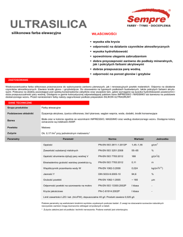 ULTRASILICA silikonowa farba elewacyjna WŁAŚCIWOŚCI wysoka siła krycia odporność na działanie czynników atmosferycznych wysoka hydrofobowość spowolnione uleganie zabrudzeniom dobra przyczepność ść zarówno do podłoży podło mineralnych, jak i pokrytych farbami akrylowymi dobrze przepuszcza parę ę wodną wodn odporność na porost glonów i grzybów ZASTOSOWANIE Wodorozcieńczalna czalna farba silikonowa przeznaczona do wykonywania zarówno zar pierwszych, jak i renowacyjnych powłok malarskich. Odporna na działanie czynników atmosferycznych. Zawiera środki glono- i grzybobójcze. grzybob Do stosowania na typowych podłożach ach budowlanych, także tak pokrytych farbami akrylowymi. Polecana na obiekty pozostające pod opieką ą konserwatorów konserwator zabytków oraz wszędzie tam, gdzie wymagane są wysoka hydrofobowość powierzchni i duża przepuszczalność pary wodnej. Dostępna w gamie kolorystycznej odpowiadającej odpowiadaj cej paletom barw IMPRESSIO i MASSIMO lub barwiona na podstawie dostarczonego wzoru. Przed naniesieniem farby należy ży zagruntować zagruntowa podłoże preparatem SILIKON ULTRAGRUNT. DANE TECHNICZNE Grupa produktów Farby elewacyjne Podstawowe składniki silikonowa biel tytanowa, węglan wapnia,, woda, dodatki, dodatki środki konserwujące Dyspersja akrylowa, żywica silikonowa, Barwa Biała iała oraz w kolorze zgodnie ze wzornikami IMPRESSIO, MASSIMO oraz według dostarczonego wzoru. Dostępne kolory oznaczone są indeksem ASSP. Powłoka Matowa Zużycie malowaniu Ok. 0,17 l/m2 przy jednokrotnym malowaniu* Parametry Parametr arametr Norma Wartość Jednostka Gęstość PN-EN ISO 2811-1:2012P 1, 1,45–1,55 g/cm3 Zawartość substancji nielotnych PN-EN ISO 3251:2008 55 55–65 % Gęstość strumienia dyfuzji pary wodnej V PN-EN ISO 7783:2012 188 g/(m2d) Ekwiwalentna kwiwalentna grubość warstwy powietrza sd PN-EN ISO 7783:2012 0,11 m Współczynnik przenikania wody W PN-EN 1062-3:2008 0,024 kg/(m2h0,5) Jasność Y DIN 5033-9:2005-10 94,6 % Grubość powłoki PN-EN 1062-1:2005 ~ 180 µm Odporność powłoki na szorowanie na mokro PN-EN ISO 13300:2002P I klasa - Krycie jakościowe PN-C-81914:2002P I klasa - Limit zawartości ści ci LZO: kat. (A/c/FW), dopuszczalne 40 g/l. Produkt zawiera 0,025 g/l. Podane parametry są ą wartoś wartościami średnimi wyników uzyskanych podczas badań.. Z uwagi na stosowanie surowców naturalnych rzeczywiste wartości ści mogą nieznacznie odbiegać od podanych w tabeli. * Zużycie zależne ne jest od podłoża podło i techniki nanoszenia. Podana wartość jest orientacyjna. KARTA TECHNICZNA – ULTRASILICA data aktualizacji: 04.11.2014 SPOSÓB UŻYCIA Podłoże Podłoże e powinno być czyste, nośne, zwarte, równe i odtłuszczone. Luźne ne ziarna i zanieczyszczenia oraz słabo związane powłoki starych farb emulsyjnych należy nale dokładnie usunąć. Wszelkie nierówności ści i ubytki należy nale uzupełnić odpowiednimi zaprawami wyrównują wnującymi (BUDOMONT ZT-620, BUDOMONT ZS-640). Powierzchnie zarażone zara grzybami i algami koniecznie zdezynfekować zdezynfekowa preparatem grzybo i algobójczym ALGHESIL. W przypadku nowych tynków tynk cementowych należy zachowaćć minimum dwutygodniowy okres ssezonowania. Gruntowanie Przed naniesieniem farby należy zagruntować podłoże preparatem SILIKON ULTRAGRUNT. ULTRAGRUNT Podłoża o podwyższonej chłonności ci gruntować dwukrotnie metodą „mokre na mokre”. Nanosić dwukrotnie wałkiem wałkiem, szczotką lub przez natrysk (w tym także metodą ą AIRLESS, parametry nanoszenia w tab tabeli). Po otwarciu opakowania należy nale zwrócić uwagę,, czy na pokrywie nie znajdują się zaschnięte pozostałości farby powstałe w wyniku nieodpowiedniego składowania. Ich I obecność w wyrobie może że niekorzystnie wpływać wpływa na wygląd utworzonej powłoki. W przypadku konieczności konieczno stosowania materiałów pochodzących ących z ró różnych partii produkcyjnych na jednym elemencie architektonicznym należy nale je wymieszać, np. w pojemniku mogącym ącym pomie pomieścić kilka wiaderek farby. W celu uniknięcia różnic żnic kolorystycznych konieczne jest wykonywanie odr odrębnych bnych elementów architektonicznych architekto w jednym cyklu roboczym. Zaleca się si prowadzenie prac w temp. od 5 do 30°C. Nanoszenie Producent Urządzenie Dysza Ciśnienie [bar] Filtr [mesh] Rozcieńczenie [%] Wydajność [l/min] WAGNER ProSpray 3.21 0552-519 200 60 10-20 1,25 TITAN Titan 450e 661-519 200 60 10 1,25 GRACO UltrMax II795 PAA623 200 60 5 2,15 Rozcieńczanie Produkt gotowy do użycia. uż W razie konieczności rozcieńczać wodą w ilości ści nie przekraczającej 10%. Zbyt duże rozcieńczenie może że być przyczyną zmniejszenia siły krycia, co skutkuje pojawianiem się si przebarwień. Wysychanie W temperaturze 20° °C i względnej wilgotności ci powietrza 55% czas wysychania powłoki wynosi ok. 12 godzin. Niska temperatura oraz podwyższona podwy wilgotność powietrza wydłużają czas wysychania. Czyszczenie narzędzi Wodą natychmiast po użyciu. uż OPAKOWANIE 5 i 10 litrów PRZECHOWYWANIE Przechowywać w pomieszczeniu chłodnym, lecz chronionym przed mrozem, w oryginalnym, zamkni zamkniętym tym opakowaniu. Po przemrożeniu przemro produkt nie nadaje się do użycia. Data ważności znajduje się na pokrywie opakowania. INFORMACJE DODATKOWE Przy przemalowywaniu wypraw tynkarskich w opartych na styropianie systemach ocieplenia budynków nie należy ży stosować stosowa ciemnych kolorów, ponieważ w okresie letnim dochodzi do nadmiernego ogrzewania południowych ścian, co obniża trwałość systemu. W takich sytuacjach producent zaleca wybierawybier nie kolorów, dla których współczynnik jasności ci Y (wartość ta podana jest pod każdym dym kolorem we wzorniku kolorów SEMPRE) jest większy wi niż 20%. Kolory o niższych wartościach ciach współczynnika Y powinny być by stosowane tyl