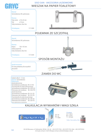 SISO SAN - AKCESORIA ŁAZIENKOWE WIESZAK NA PAPIER TOALETOWY Materiał Stal nierdzewna 304, polerowana Wymiary Pręty nośne: ø 18 x 65 mm Pręt: ø 10 mm Śruby montażowe, klucz hex Nr katalogowy 17.73.000 POJEMNIK ZE SZCZOTKĄ Materiał Stal nierdzewna 304, polerowana Wymiary Korpus: 120 x 142 mm Szklany pojemnik, śruby montażowe, klucz hex Nr katalogowy 17.73.030 SPOSÓB MONTAŻU Sposób mocowania Do ściany jednakowy dla wszystkich akcesoriów ZAMEK DO WC Grubość szkła: 8 - 12 mm Materiał: stal nierdzewna Wykończenie Zamek jednostronny Stal nierdzewna szczotkowana IDL-52-SSS Przeciwkasetka do zamka jednostronnego Stal nierdzewna szczotkowana IDL-52LK-SSS Polerowana stal szczotkowa IDL-52LK-PSS Zamek dwustronny Stal nierdzewna szczotkowana IDL-52L-SSS Polerowana stal szczotkowa IDL-52L-PSS Przeciwkasetka do zamka dwustronnego Stal nierdzewna szczotkowana IDL-52K-SSS Polerowana stal szczotkowa IDL-52K-PSS *inne wykończenia na zamówienie KALKULACJA WYMIARÓW I WAGI SZKŁA T( mm ) kg = H(m) x B(m) x 2,5 x T (mm) H=m B=m T = mm! kg Przykład H = 1,9 m B = 1,2 m T = 12 mm B (m ) 1,9 x 1,2 x 2,5 x 12 = 68,4 kg 160 04-464 Warszawa, ul. Chełmżyńska 180 lok. 220, tel.: +48 22 879 79 60, +48 22 879 79 63, faks: +48 22 879 90 62 www.gryc.com.pl, e-mail: [email protected], [email protected]