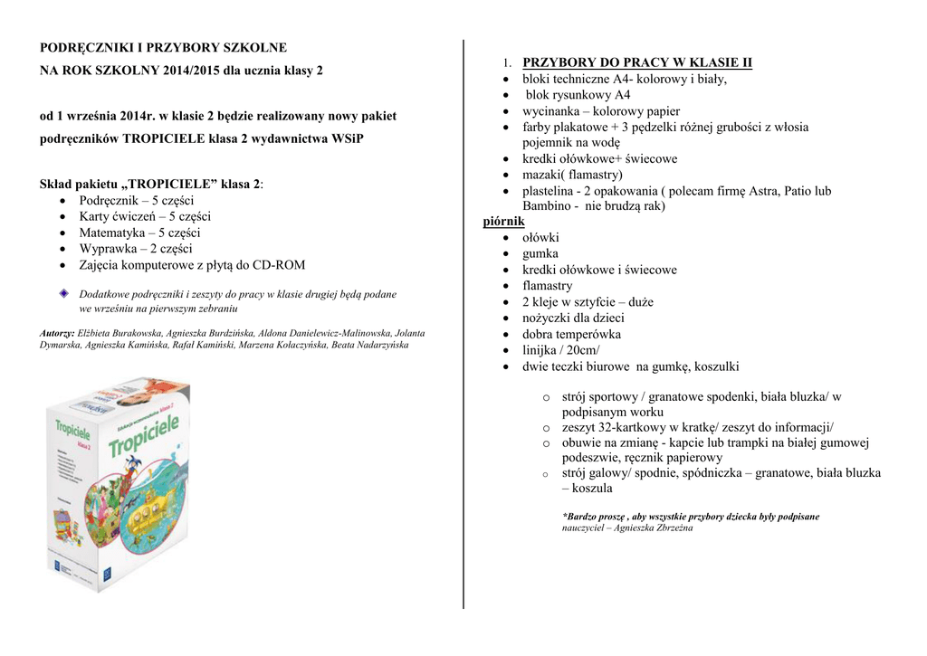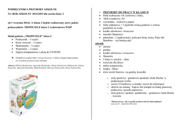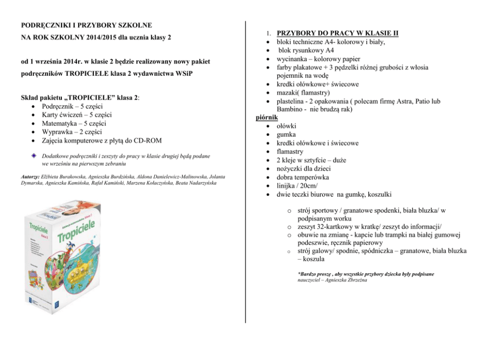 PODRĘCZNIKI I PRZYBORY SZKOLNE NA ROK SZKOLNY 2014/2015 dla ucznia klasy 2 od 1 września 2014r. w klasie 2 będzie realizowany nowy pakiet podręczników TROPICIELE klasa 2 wydawnictwa WSiP Skład pakietu „TROPICIELE” klasa 2: Podręcznik – 5 części Karty ćwiczeń – 5 części Matematyka – 5 części Wyprawka – 2 części Zajęcia komputerowe z płytą do CD-ROM Dodatkowe podręczniki i zeszyty do pracy w klasie drugiej będą podane we wrześniu na pierwszym zebraniu Autorzy: Elżbieta Burakowska, Agnieszka Burdzińska, Aldona Danielewicz-Malinowska, Jolanta Dymarska, Agnieszka Kamińska, Rafał Kamiński, Marzena Kołaczyńska, Beata Nadarzyńska 1. PRZYBORY DO PRACY W KLASIE II bloki techniczne A4- kolorowy i biały, blok rysunkowy A4 wycinanka – kolorowy papier farby plakatowe + 3 pędzelki różnej grubości z włosia pojemnik na wodę kredki ołówkowe+ świecowe mazaki( flamastry) plastelina - 2 opakowania ( polecam firmę Astra, Patio lub Bambino - nie brudzą rak) piórnik ołówki gumka kredki ołówkowe i świecowe flamastry 2 kleje w sztyfcie – duże nożyczki dla dzieci dobra temperówka linijka / 20cm/ dwie teczki biurowe na gumkę, koszulki o strój sportowy / granatowe spodenki, biała bluzka/ w podpisanym worku o zeszyt 32-kartkowy w kratkę/ zeszyt do informacji/ o obuwie na zmianę - kapcie lub trampki na białej gumowej podeszwie, ręcznik papierowy o strój galowy/ spodnie, spódniczka – granatowe, biała bluzka – koszula *Bardzo proszę , aby wszystkie przybory dziecka były podpisane nauczyciel – Agnieszka Zbrzeżna