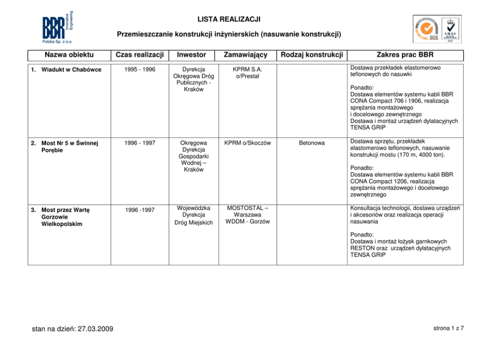 LISTA REALIZACJI Przemieszczanie konstrukcji inżynierskich