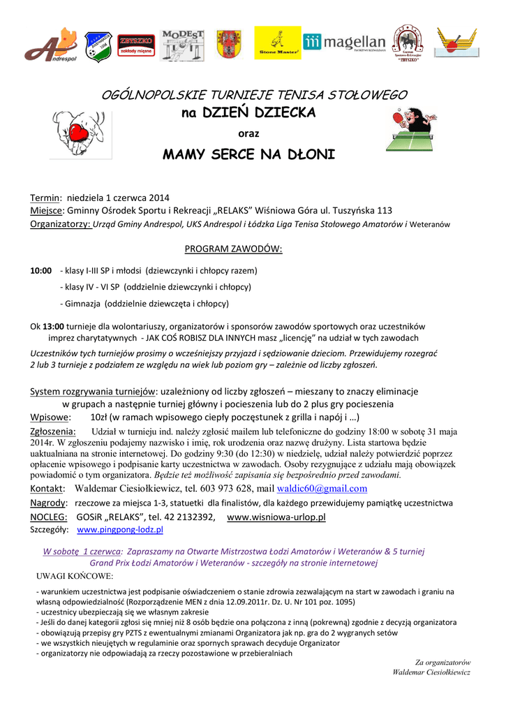 OGÓLNOPOLSKIE TURNIEJE TENISA STOŁOWEGO na DZIEŃ DZIECKA oraz MAMY SERCE NA DŁONI Termin: niedziela 1 czerwca 2014 Miejsce: Gminny Ośrodek Sportu i Rekreacji „RELAKS” Wiśniowa Góra ul. Tuszyńska 113 Organizatorzy: Urząd Gminy Andrespol, UKS Andrespol i Łódzka Liga Tenisa Stołowego Amatorów i Weteranów PROGRAM ZAWODÓW: 10:00 - klasy I-III SP i młodsi (dziewczynki i chłopcy razem) - klasy IV - VI SP (oddzielnie dziewczynki i chłopcy) - Gimnazja (oddzielnie dziewczęta i chłopcy) Ok 13:00 turnieje dla wolontariuszy, organizatorów i sponsorów zawodów sportowych oraz uczestników imprez charytatywnych - JAK COŚ ROBISZ DLA INNYCH masz „licencję” na udział w tych zawodach Uczestników tych turniejów prosimy o wcześniejszy przyjazd i sędziowanie dzieciom. Przewidujemy rozegrać 2 lub 3 turnieje z podziałem ze względu na wiek lub poziom gry – zależnie od liczby zgłoszeń. System rozgrywania turniejów: uzależniony od liczby zgłoszeń – mieszany to znaczy eliminacje w grupach a następnie turniej główny i pocieszenia lub do 2 plus gry pocieszenia Wpisowe: 10zł (w ramach wpisowego ciepły poczęstunek z grilla i napój i …) Zgłoszenia: Udział w turnieju ind. należy zgłosić mailem lub telefoniczne do godziny 18:00 w sobotę 31 maja 2014r. W zgłoszeniu podajemy nazwisko i imię, rok urodzenia oraz nazwę drużyny. Lista startowa będzie uaktualniana na stronie internetowej. Do godziny 9:30 (do 12:30) w niedzielę, udział należy potwierdzić poprzez opłacenie wpisowego i podpisanie karty uczestnictwa w zawodach. Osoby rezygnujące z udziału mają obowiązek powiadomić o tym organizatora. Będzie też możliwość zapisania się bezpośrednio przed zawodami. Kontakt: Waldemar Ciesiołkiewicz, tel. 603 973 628, mail [email protected] Nagrody: rzeczowe za miejsca 1-3, statuetki dla finalistów, dla każdego przewidujemy pamiątkę uczestnictwa NOCLEG: GOSiR „RELAKS”, tel. 42 2132392, www.wisniowa-urlop.pl Szczegóły: www.pingpong-lodz.pl W sobotę 1 czerwca: Zapraszamy na Otwarte Mistrzostwa Łodzi Amatorów i Weteranów & 5 turniej Grand Prix Łodzi Amatorów i Weteranów - szczegóły na stronie internetowej UWAGI KOŃCOWE: - warunkiem uczestnictwa jest podpisanie oświadczeniem o stanie zdrowia zezwalającym na start w zawodach i graniu na własną odpowiedzialność (Rozporządzenie MEN z dnia 12.09.2011r. Dz. U. Nr 101 poz. 1095) - uczestnicy ubezpieczają się we własnym zakresie - Jeśli do danej kategorii zgłosi się mniej niż 8 osób będzie ona połączona z inną (pokrewną) zgodnie z decyzją organizatora - obowiązują przepisy gry PZTS z ewentualnymi zmianami Organizatora jak np. gra do 2 wygranych setów - we wszystkich nieujętych w regulaminie oraz spornych sprawach decyduje Organizator - organizatorzy nie odpowiadają za rzeczy pozostawione w przebieralniach Za organizatorów Waldemar Ciesiołkiewicz